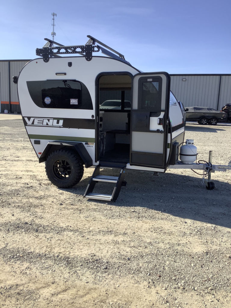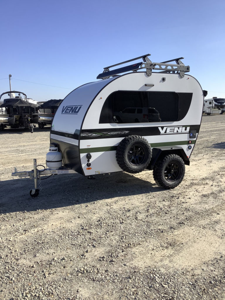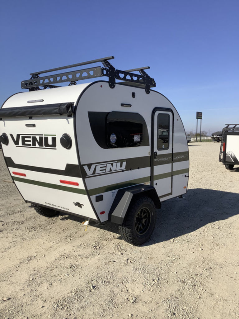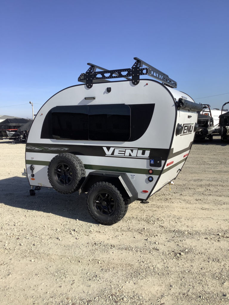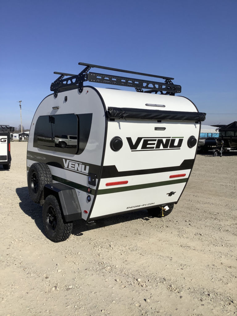The Encore VENU 10RKS is a modern, lightweight, teardrop-style adventure trailer designed for two people and built with a 100% wood-free, all-aluminum construction. It is a deluxe model within the Venu lineup that is easy to tow and equipped with essential amenities for off-grid camping, including a dinette, a small indoor kitchen, and a private cassette toilet.