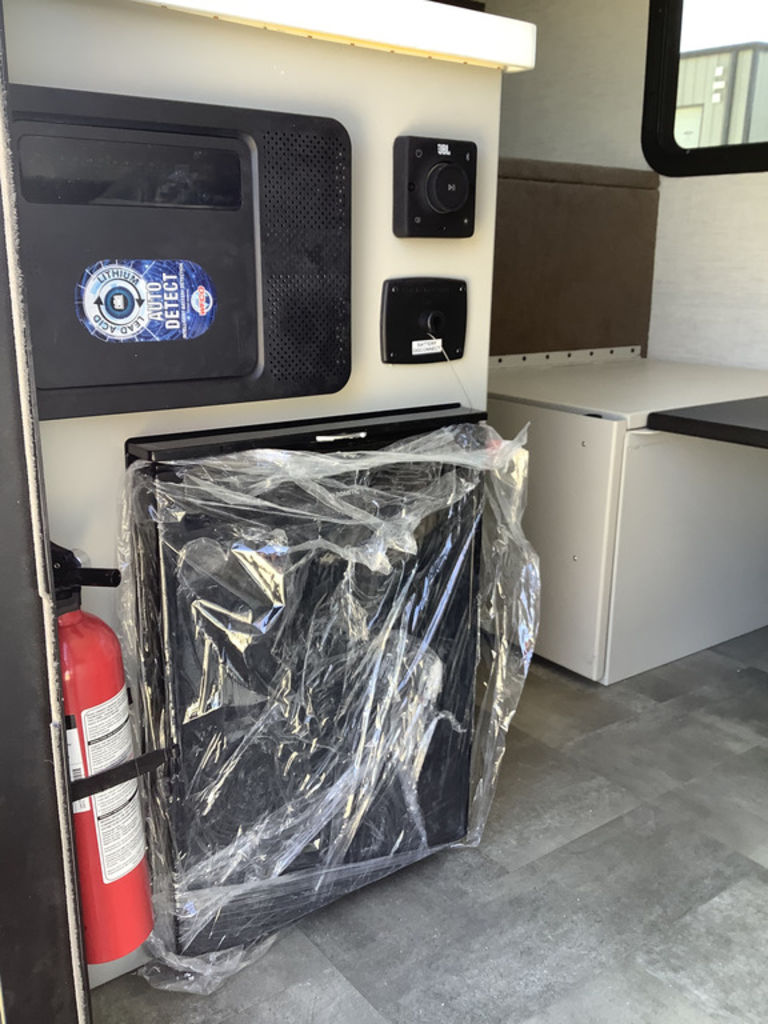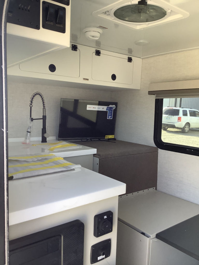 Modern finishes: The interior features tweed walls with Azdel, durable Luxe vinyl flooring, and sleek aluminum cabinetry.