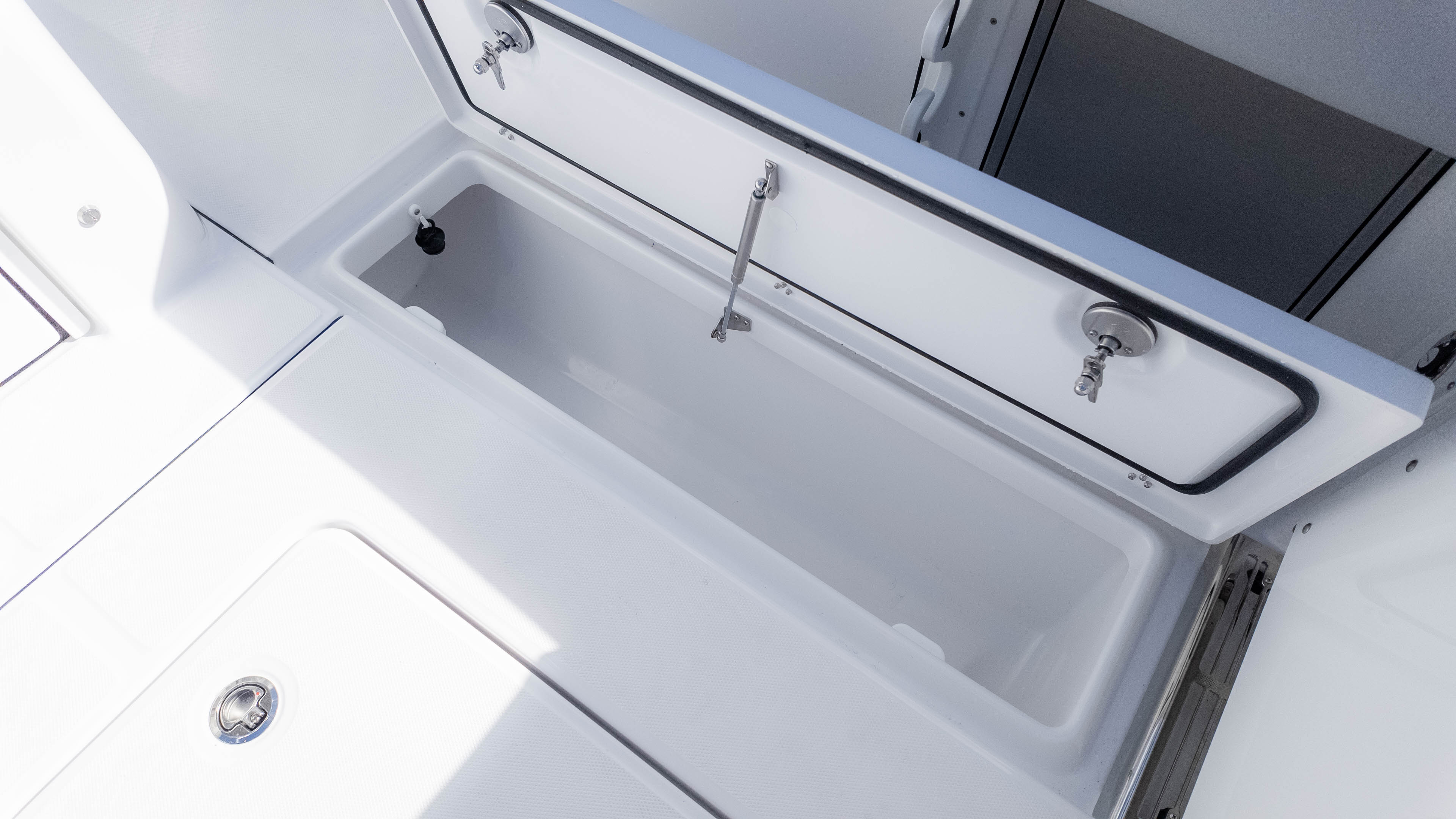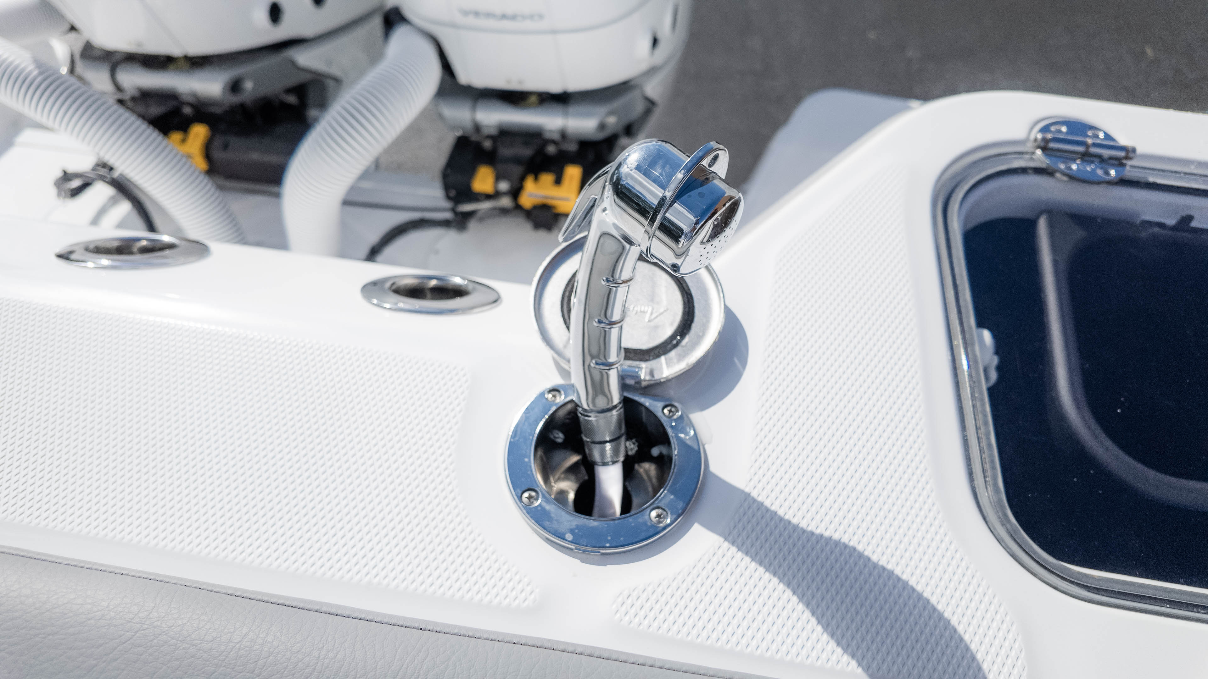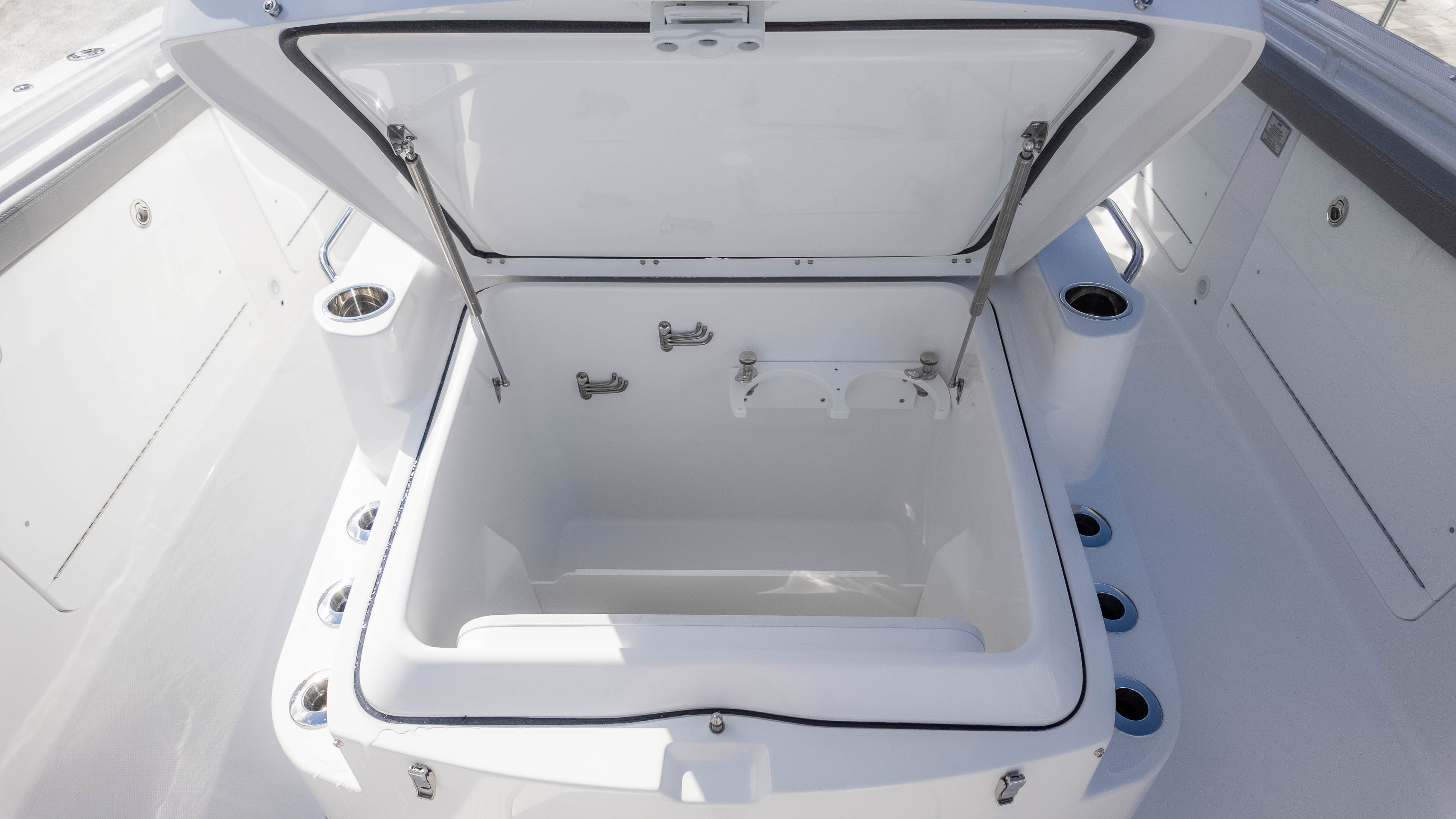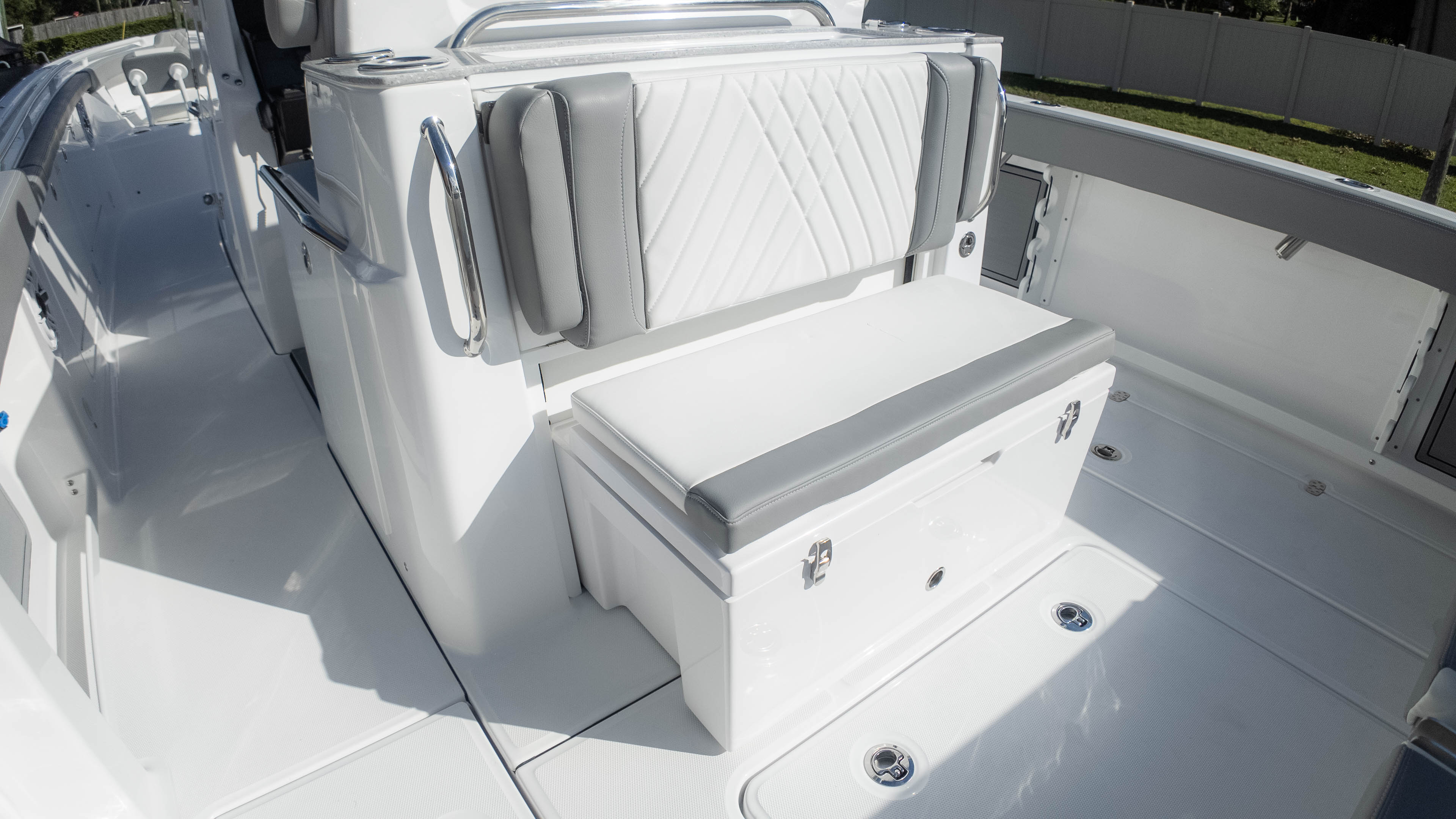 But it's not all about the adrenaline and the catch; this boat also knows how to pamper. Relax in the cushioned forward console lounge seating, or unwind in the aft-facing mezzanine seating with its insulated storage tub. The head compartment offers a sink, toilet, and even a teak head cover for added comfort. And when the sun dips below the horizon, the underwater spectrum quattro RGBW lights set the mood for an evening of entertainment.
