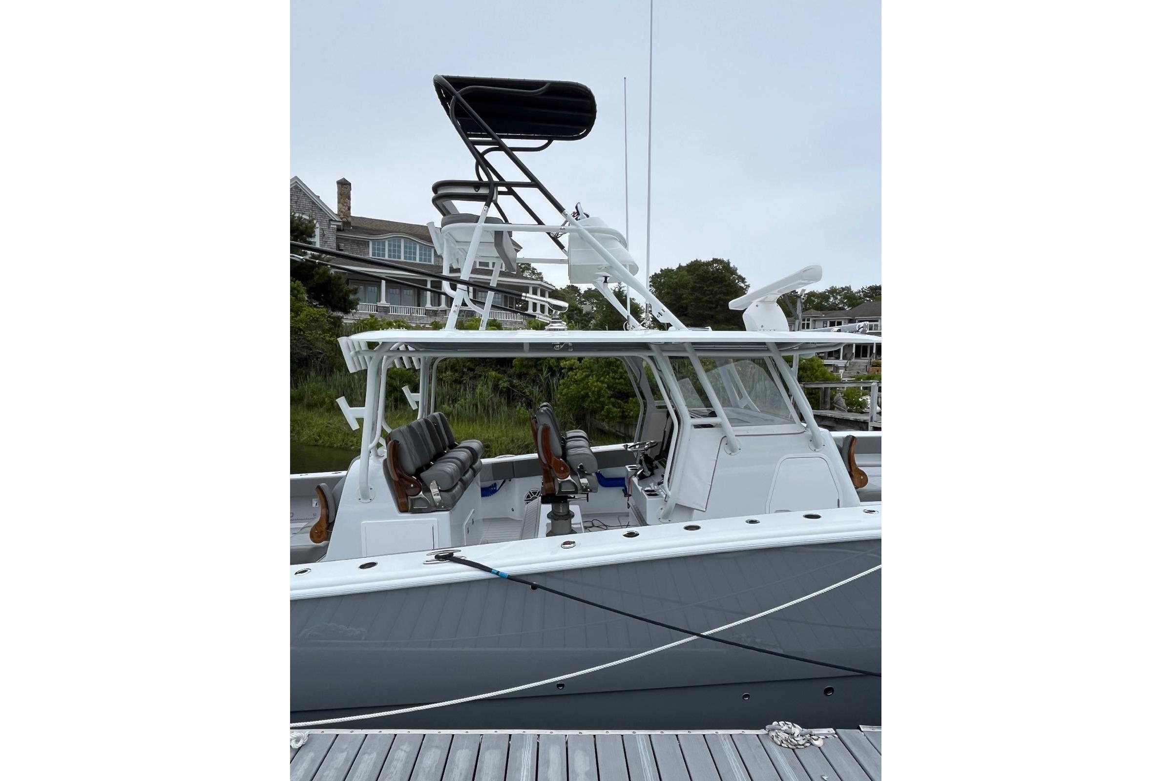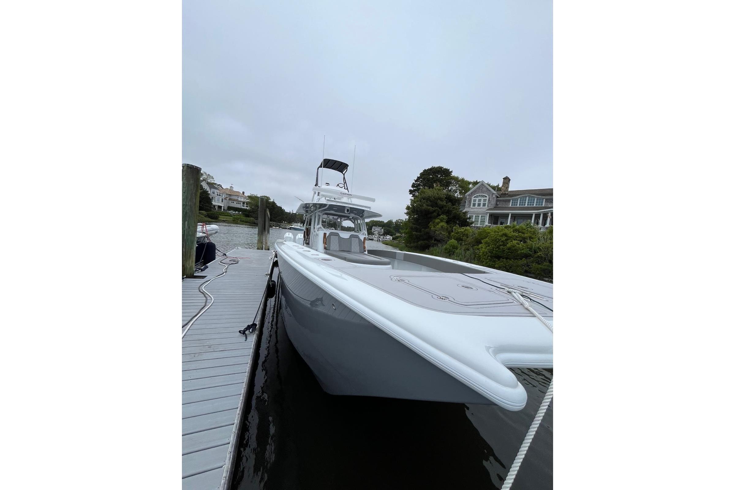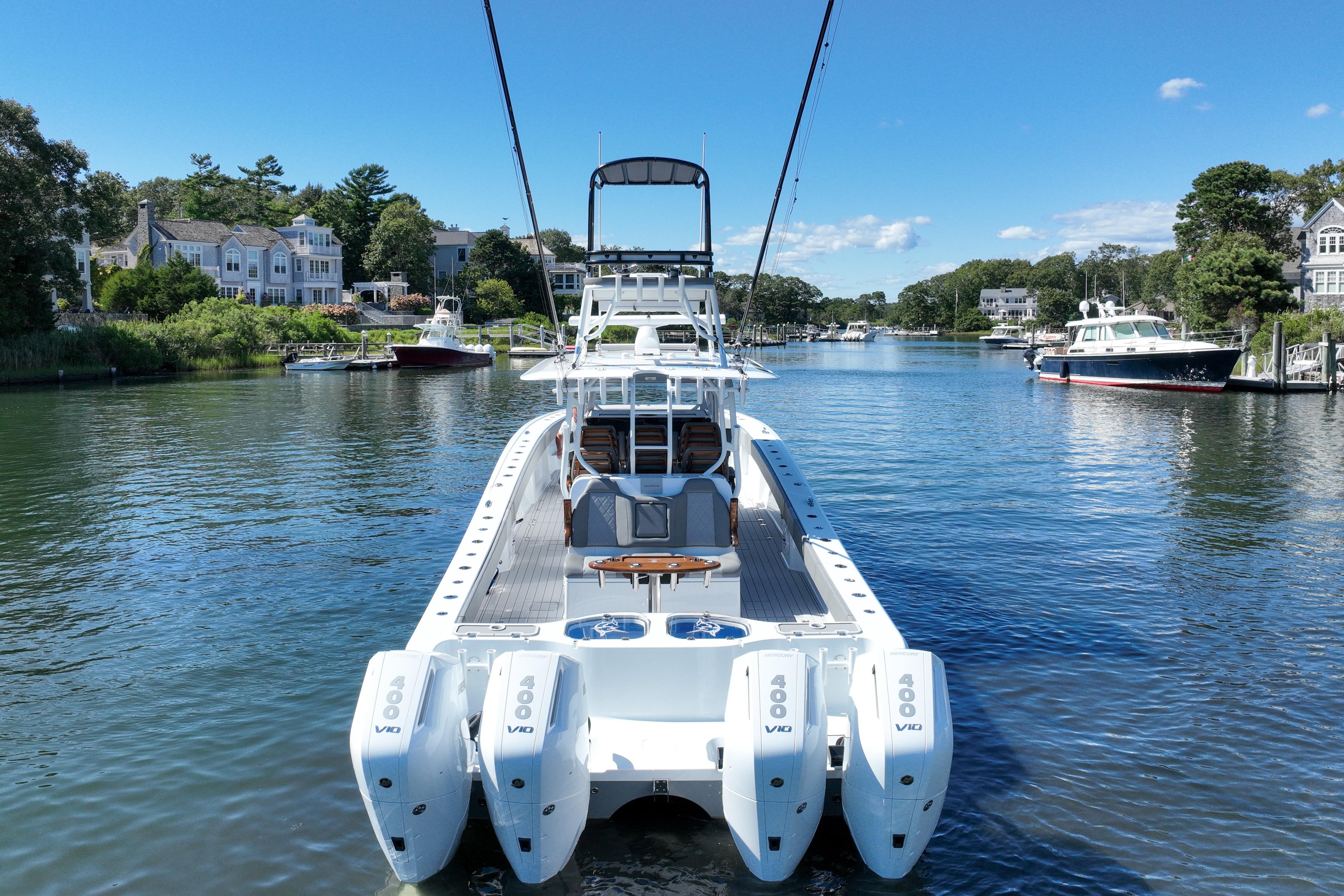 LOA 42′ (45′ w/ engines) · Beam 11′ 9″ · Draft 24″ · Fuel 800 gal · Fresh water 40 gal (twin 20) · Deluxe XL 42 haze-gray T-top with polycarbonate enclosure & side wings · White powdercoat package · Tower with full controls · Gemlux outrigger bases with Marsh Tacky 21′ internal poles · HullPro bottom coating (upgrade from bottom paint) · Full Deckit traction package (deck, hatches, bow tops) · Inverter upgrade · Pre-wire for windlass · On-board battery charger · Electric marine head with holding tank