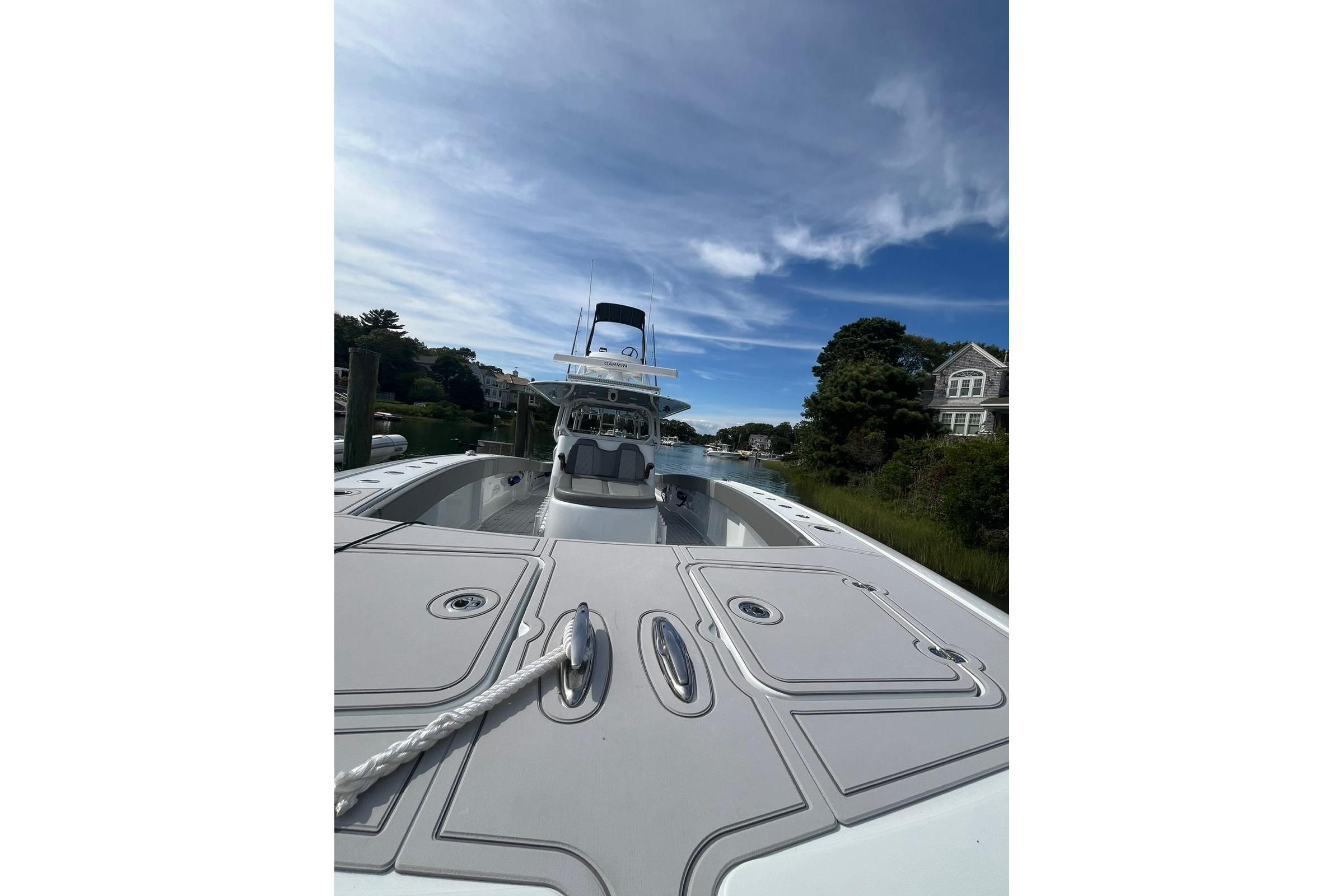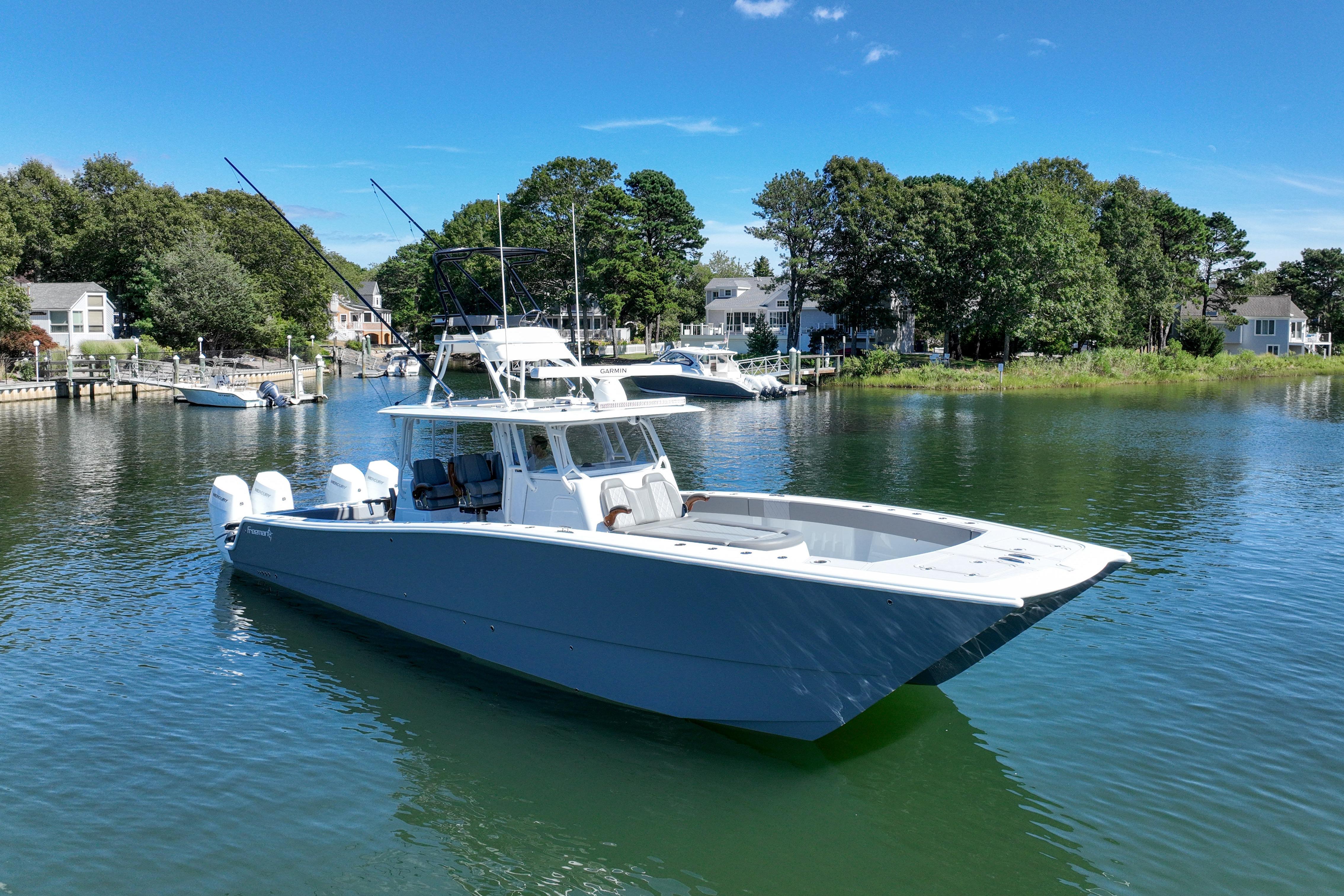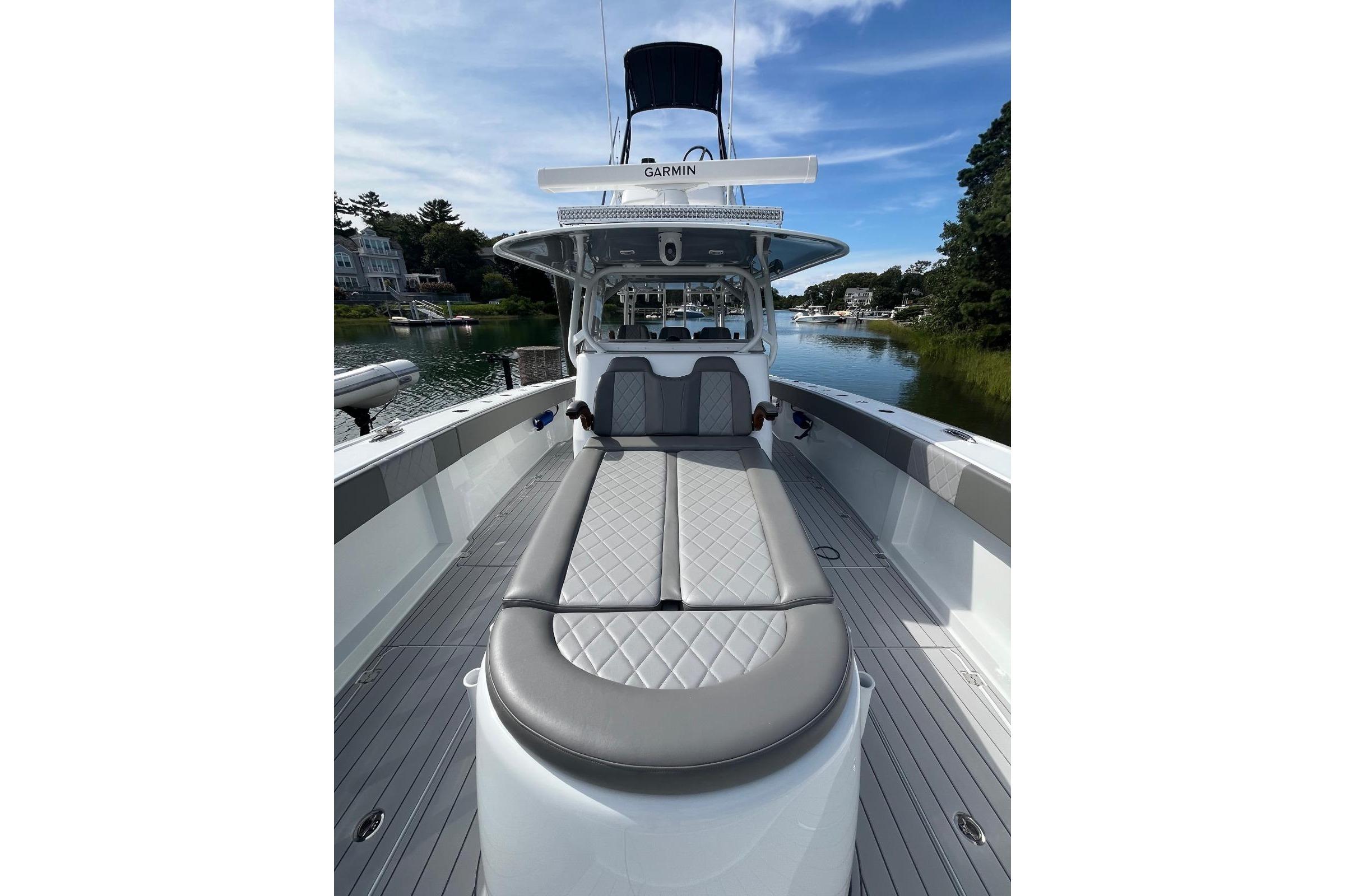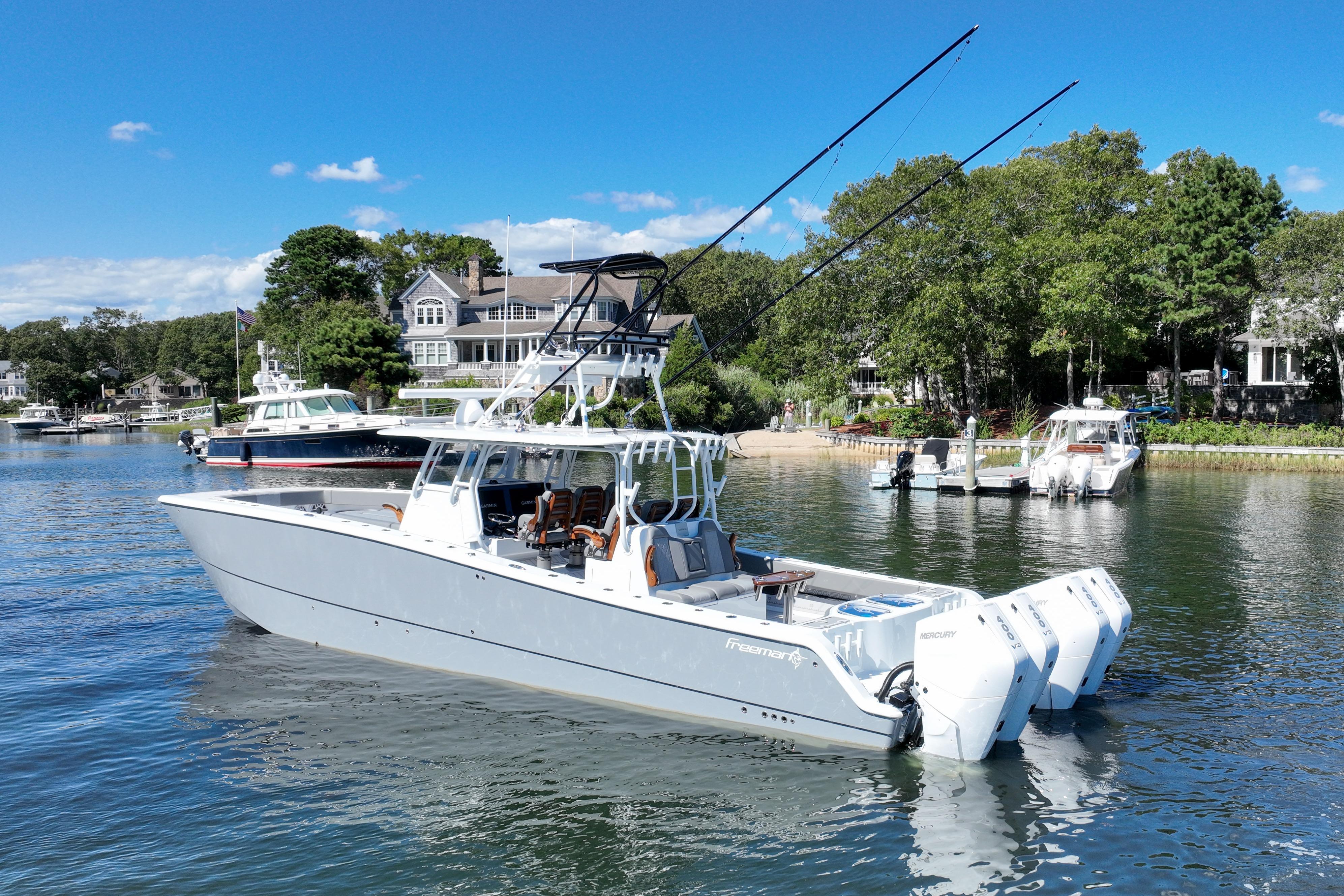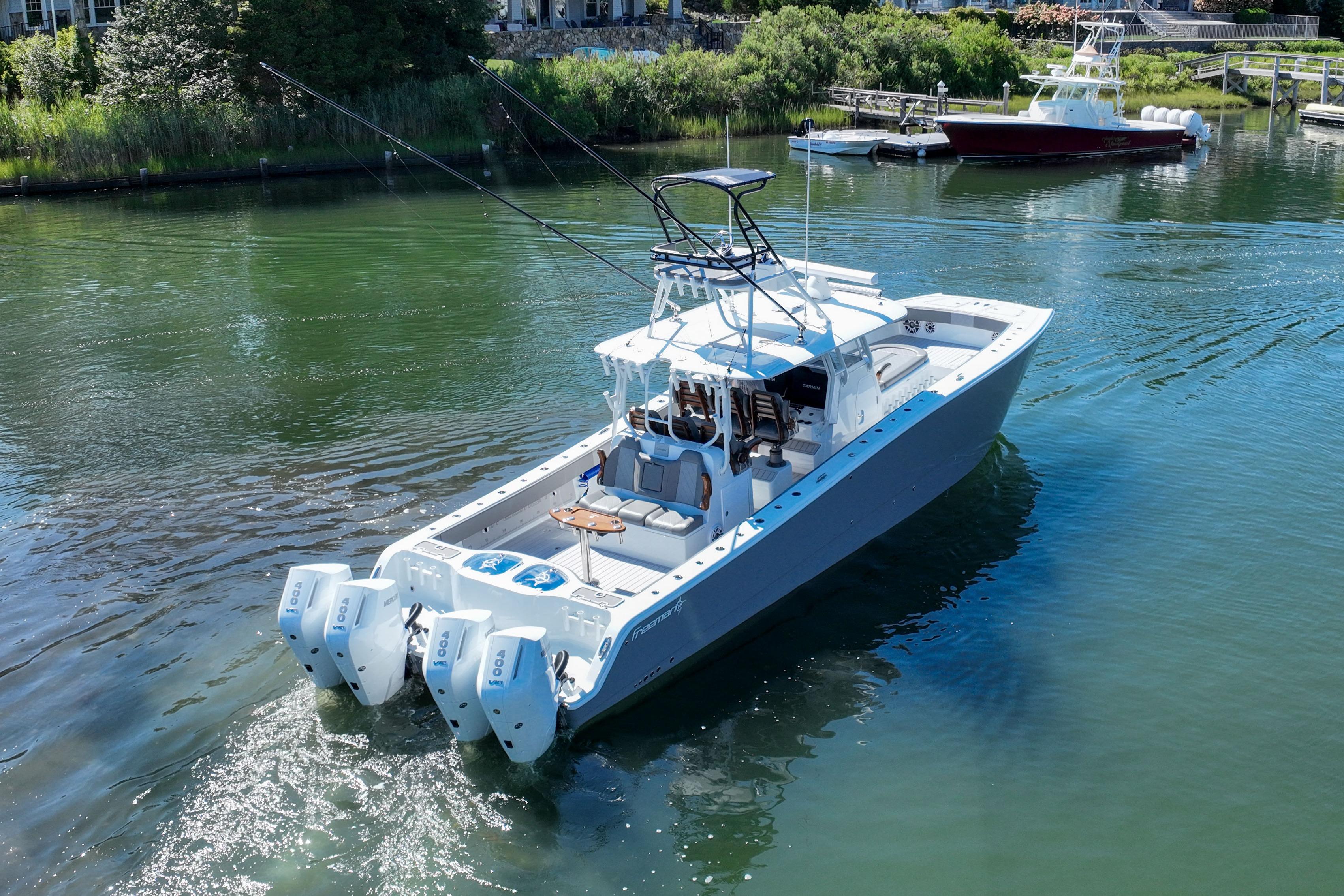 Freeman’s 42 LR is all about reach, pace and efficiency, and this custom build leans in with an 800-gal fuel load, Haze Gray topsides and a full Deckit package that keeps traction sure from bow to transom. The deck plan is pure fish: a 1,200-qt coffin lounge, twin 400-qt forward boxes, twin floor wells (70 gal each) with pumpout and multiple mains keep baits lively and the catch iced. Gemlux bases and Marsh Tacky 21′ internal outriggers set clean spreads, while the tower with controls tightens your sight lines when you’re hunting edges.