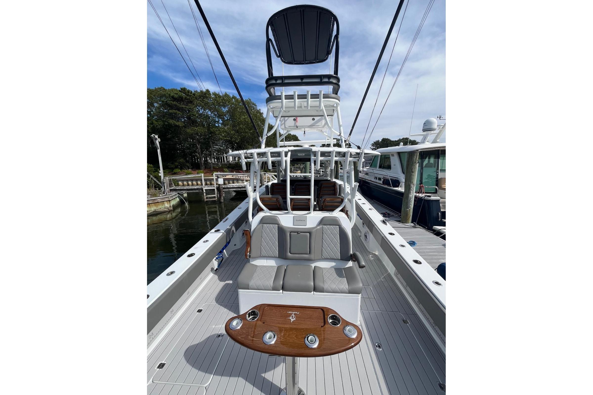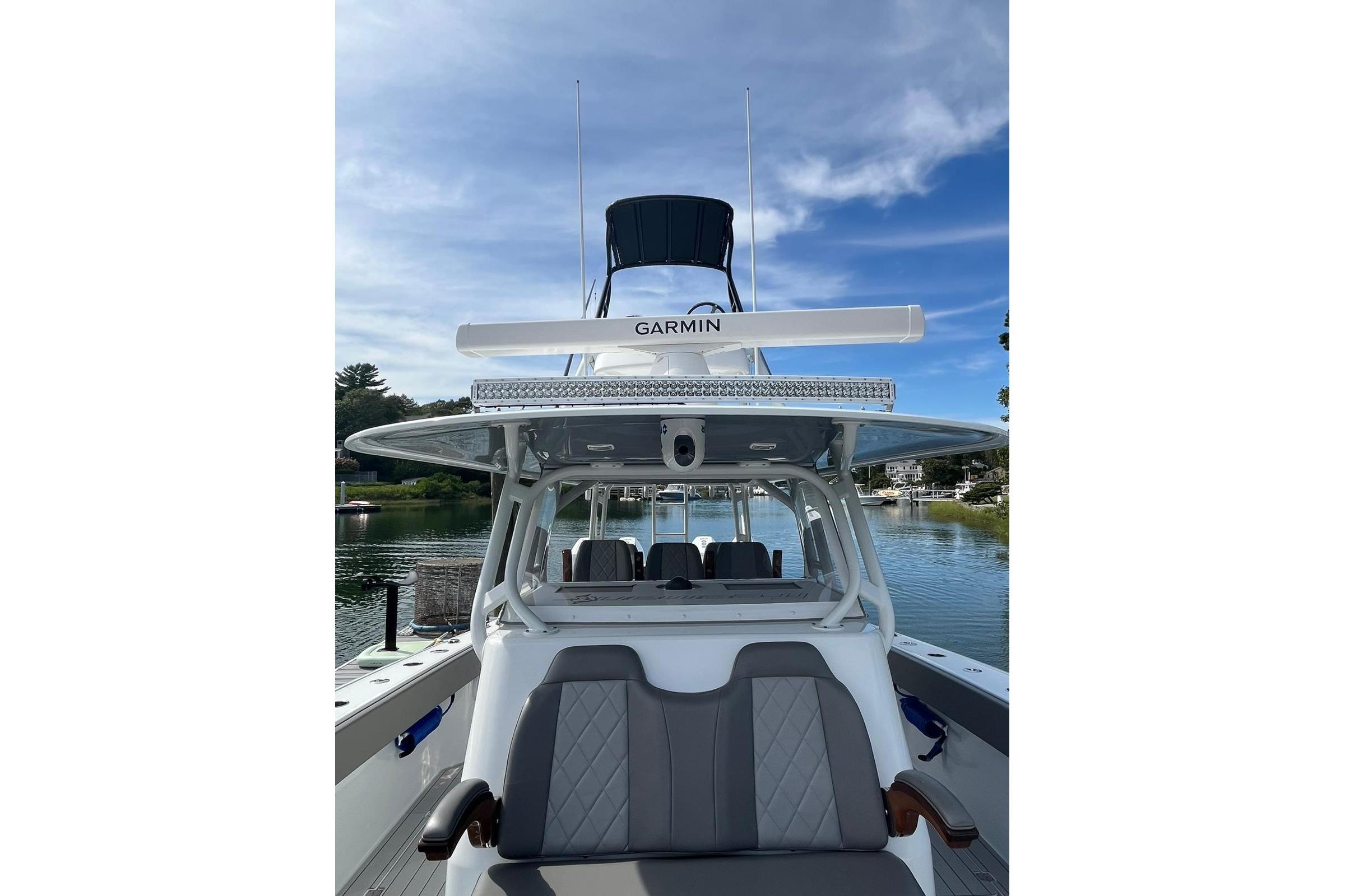Haze-gray hull & T-top · White rub rail with white insert · SHOX pedestal helm seats · Second-row seating with teak accents · Rear-facing leaning-post seat with drink coolers · Premium tackle storage (port & stbd) · Birdsall hose holders ×4 · USB & 12V outlets · Polycarbonate windshield enclosure · Side wings for isinglass · Under-gunnel LED lighting