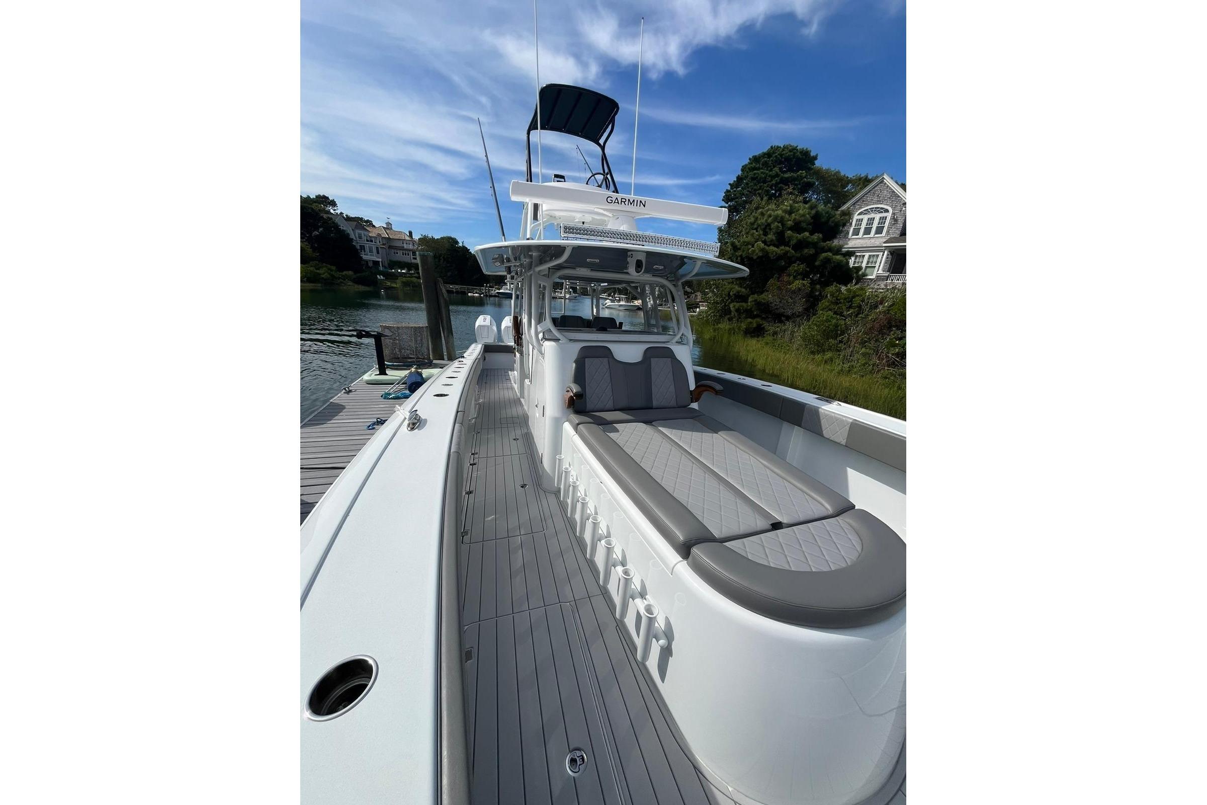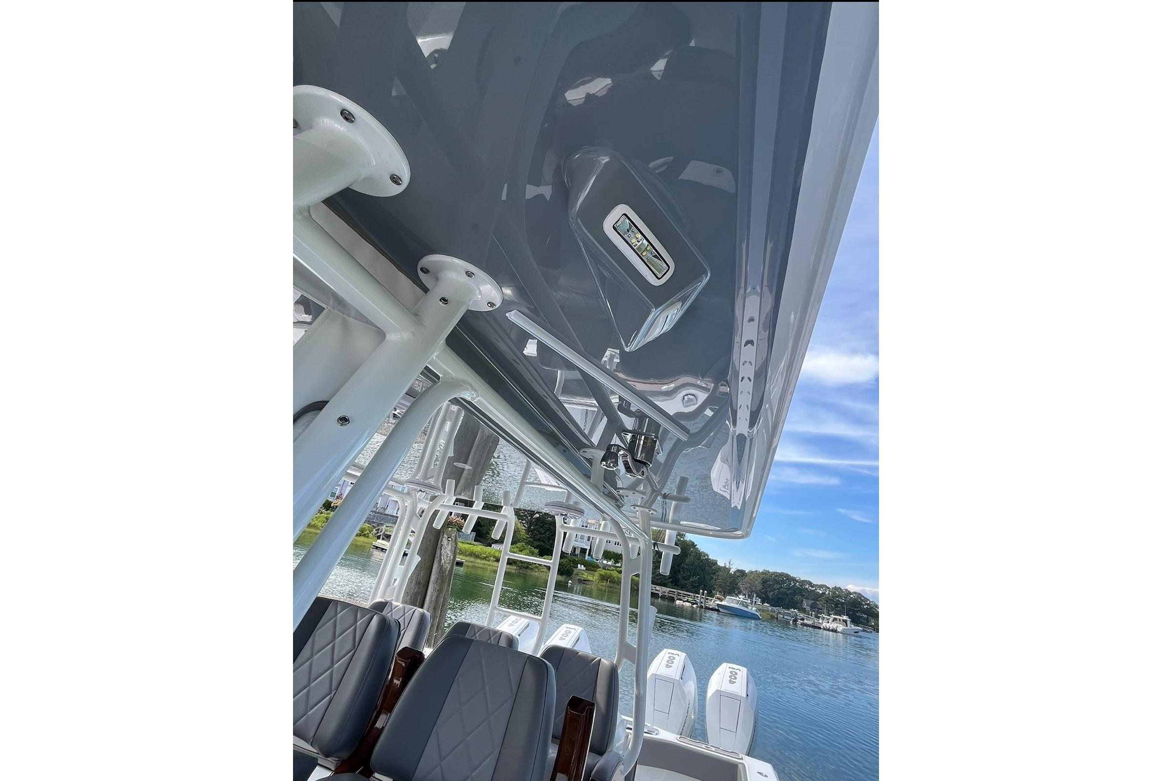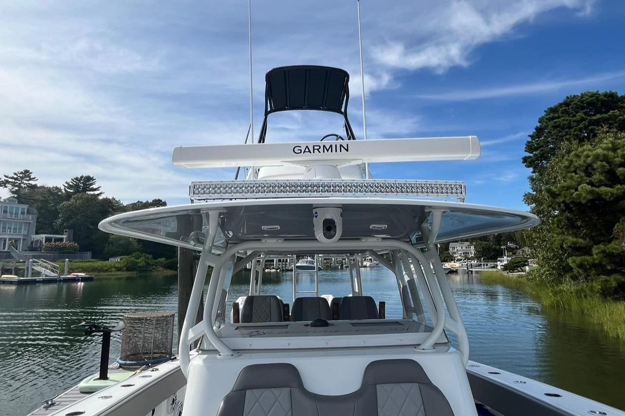 At the helm, twin 24″ Garmin GPSMAP 9224s drive an upgraded 6′ xHD3 1236 open array and dual sounder modules (GSD 28/25) for deep, clear returns; FLIR night vision extends confidence after dark. The “Over-the-Top” stereo brings concert weight, and multi-color lighting, plus added underwater units, sets the mood on the drift. Quad Mercury 400 V10s (45 hours) with joystick make the big cat nimble around docks, and the inverter upgrade, HullPro bottom, extra LP plugs and the polycarbonate enclosure round out a long-range build that’s equally dialed for tournament days and blue-water runs.