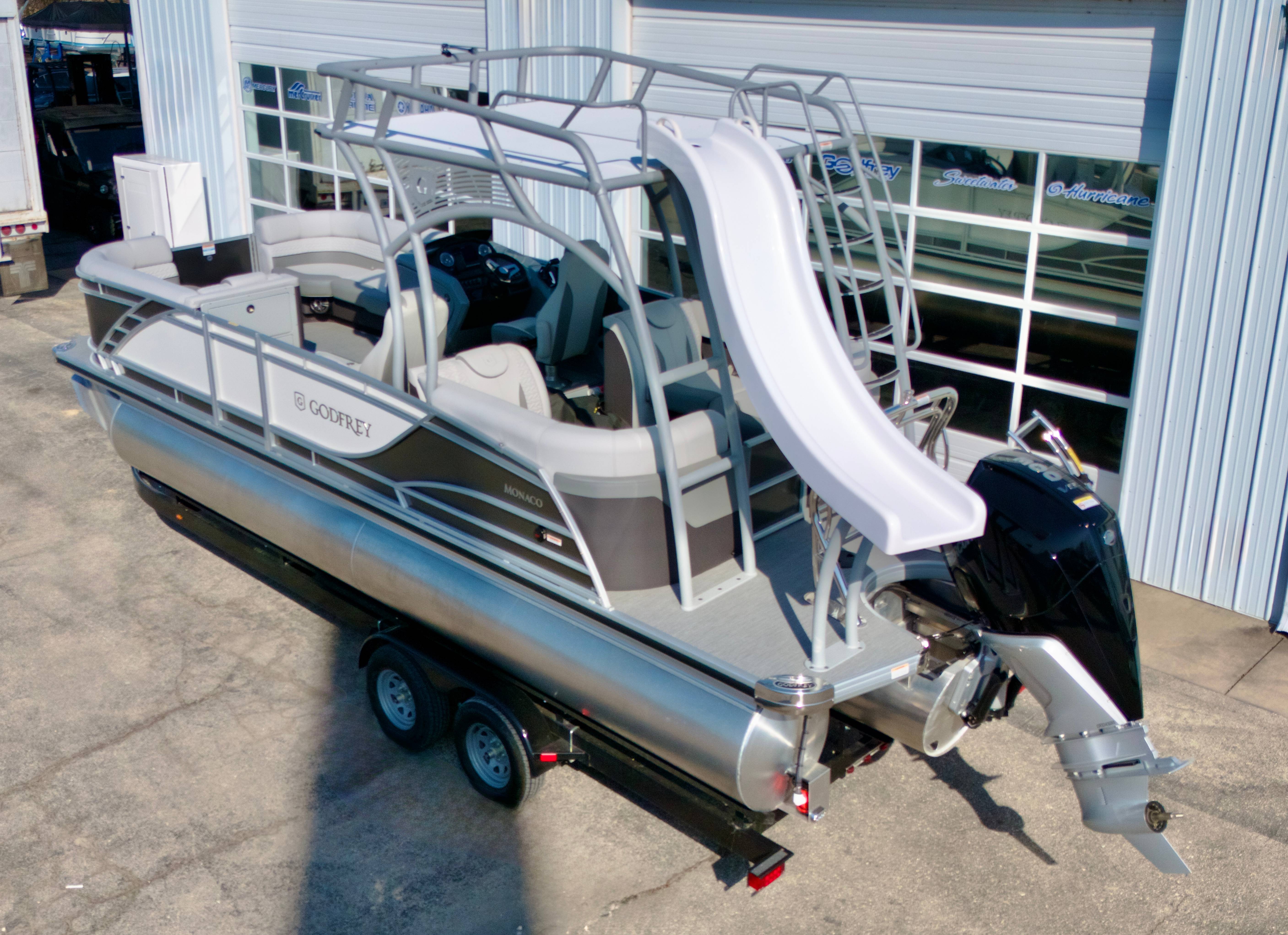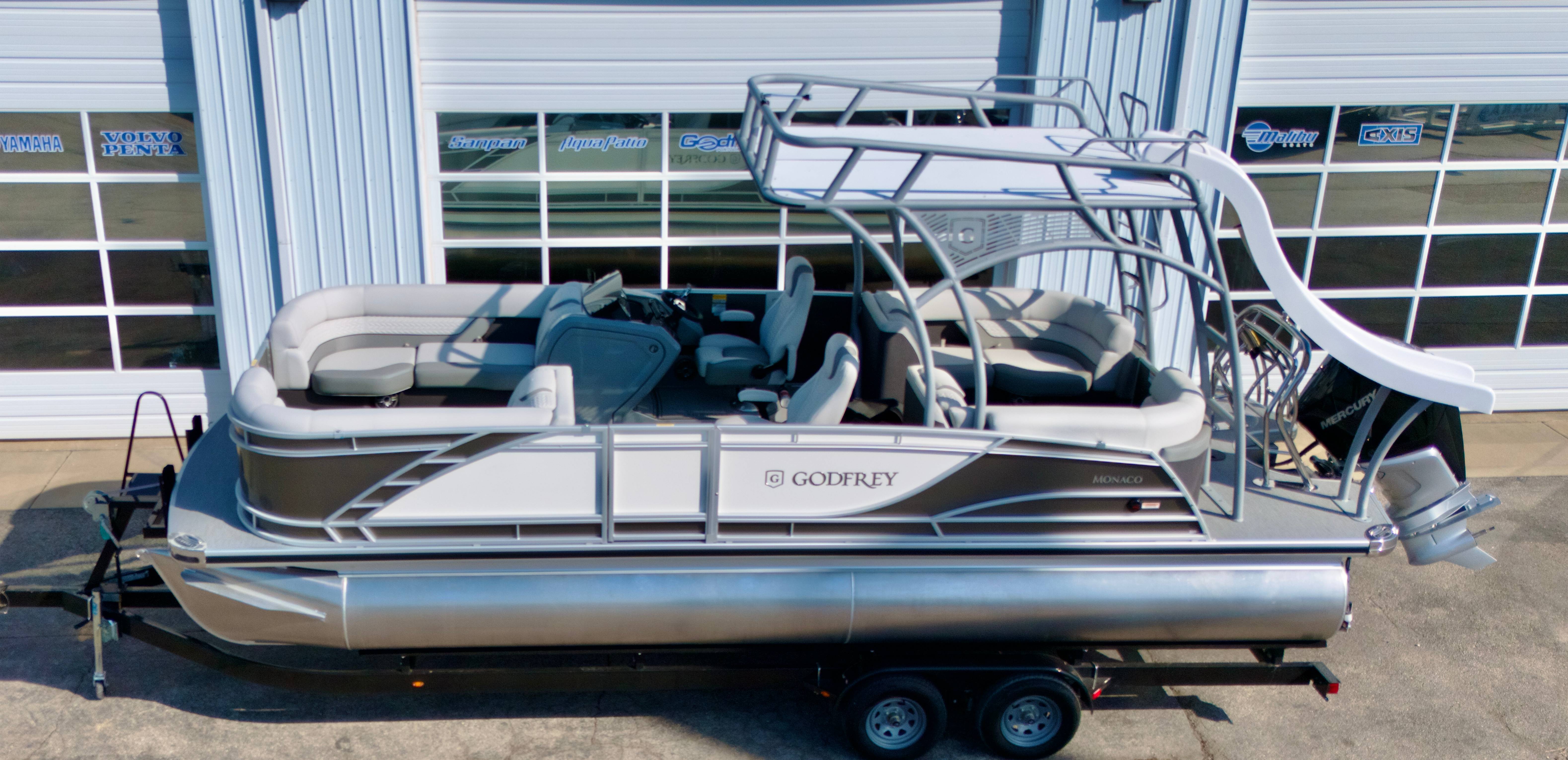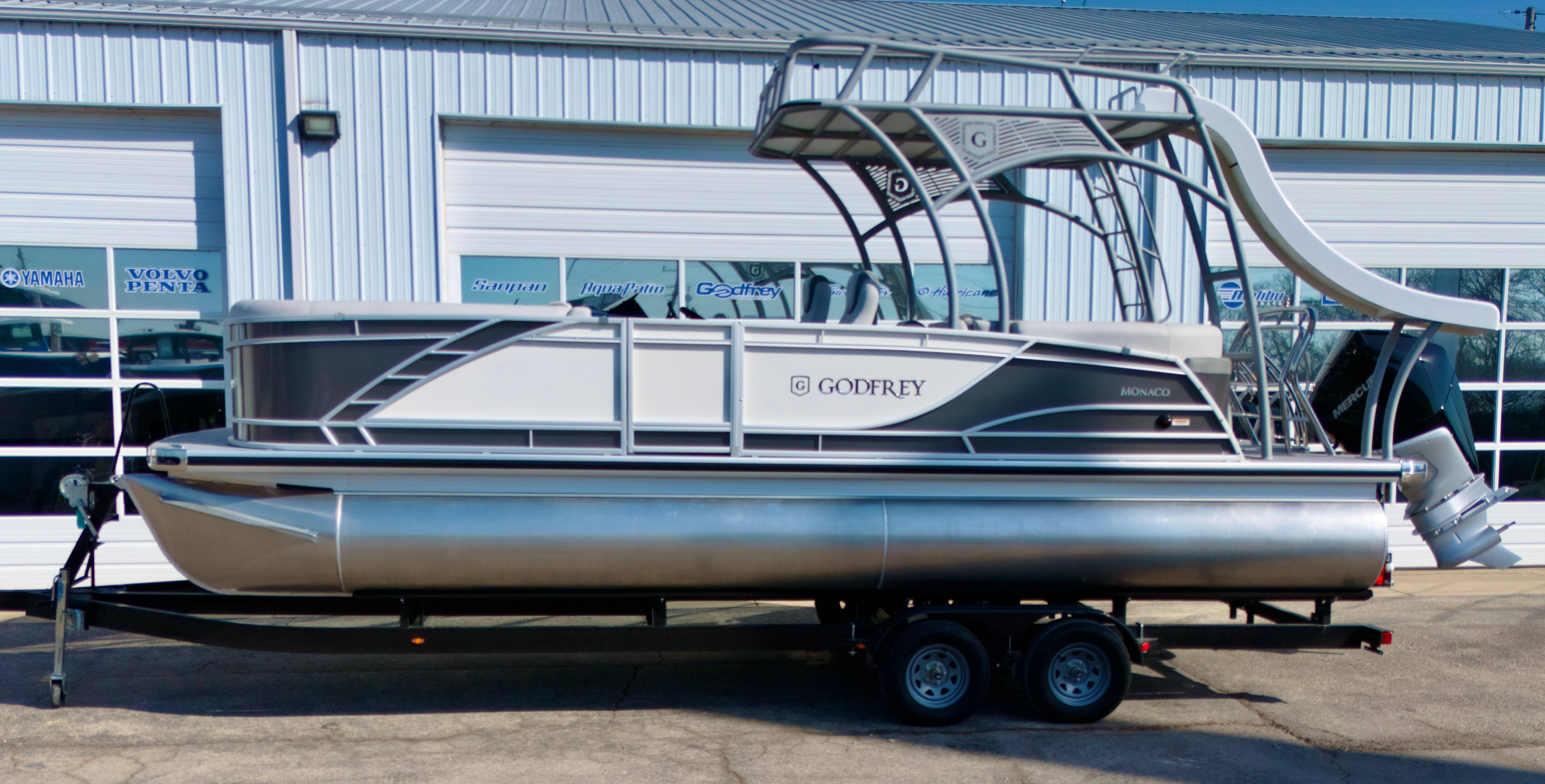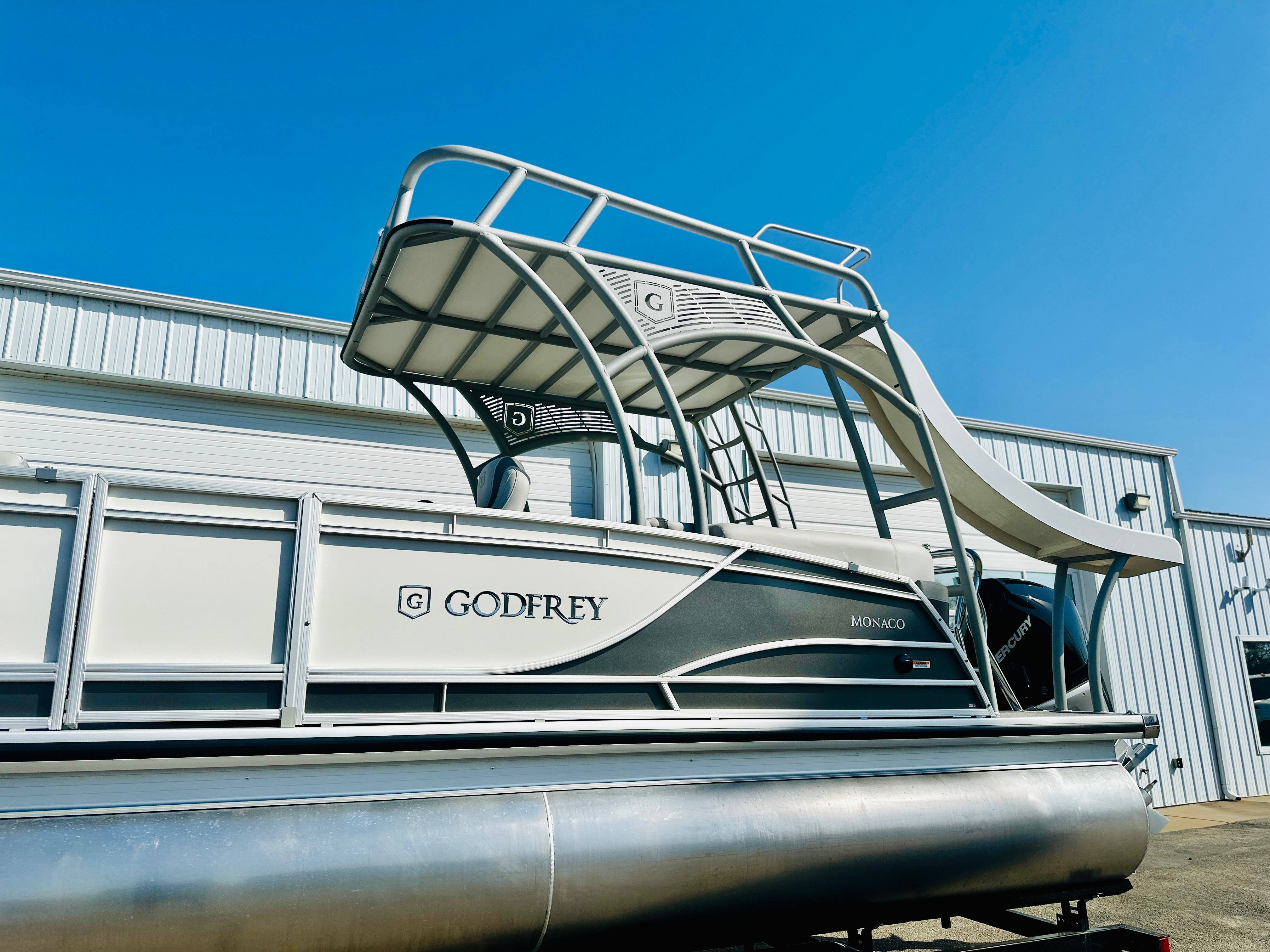 2025 Godfrey Monaco 255 SD - Slide Boat with Hard Top Boat enthusiasts will appreciate the exceptional performance and exquisite style of the 2025 Godfrey Monaco 255 SD . This full-sized pontoon boat prominently features a robust hard top , offering a perfect blend of comfort, protection, and style. Outstanding Power and Performance iMpact Plus Tritoon package is included in the boat, boasting a 29-inch center tritoon that provides the perfect balance of buoyancy and stability. The boat is powered by a top-of-the-line Mercury 300 HP Verado Outboard engine, offering an unyielding performance and power for cruising on the waters with ease. Assurance of Quality and Durability To guarantee your peace of mind, the boat comes with a Lifetime warranty deck-down guaranteeing high durability and long-lasting use. Additionally, it also provides a generous 10-year warranty from bow to stern , ensuring all-around protection and preserving your investment for the years to come. The 2025 Godfrey Monaco 255 SD is more than just a boating vessel, it's a statement of elegance and functionality that stands apart in the world of marine recreation. Experience the exceptional performance and luxurious style that the Godfrey Monaco 255 SD has to offer today. This Godfrey Tritoon is available for sale at our Lake of the Ozarks location. We also have locations in St. Louis MO, Oklahoma on Grand Lake, and Lake Texoma in TX. Our skilled team is ready and willing to assist with any of your boating needs. Sales and service at all locations.