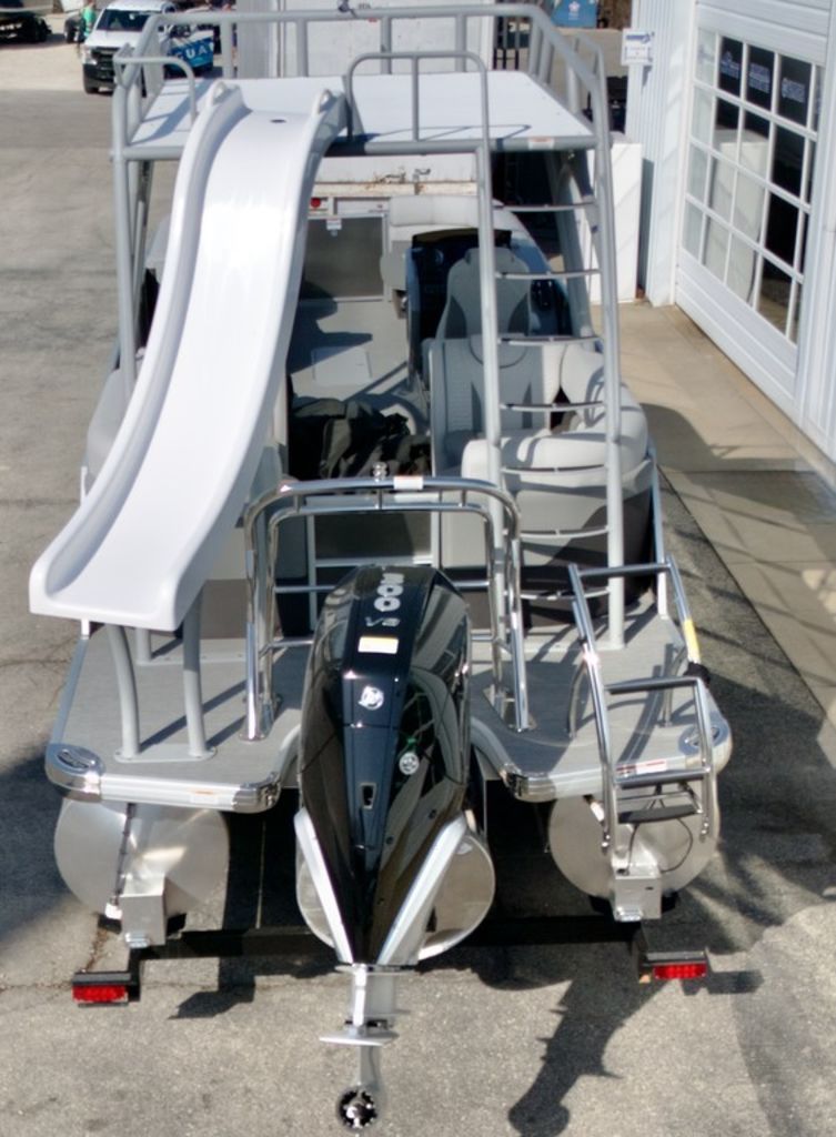 Slip Into Fun- Make a splash with your own personal water park. The far-aft stern mount design of the water slide allows for maximum deck space. An angled design keeps sliders away from the engine and a water pump discharge nozzle at the top of the slide keeps the fun flowing.