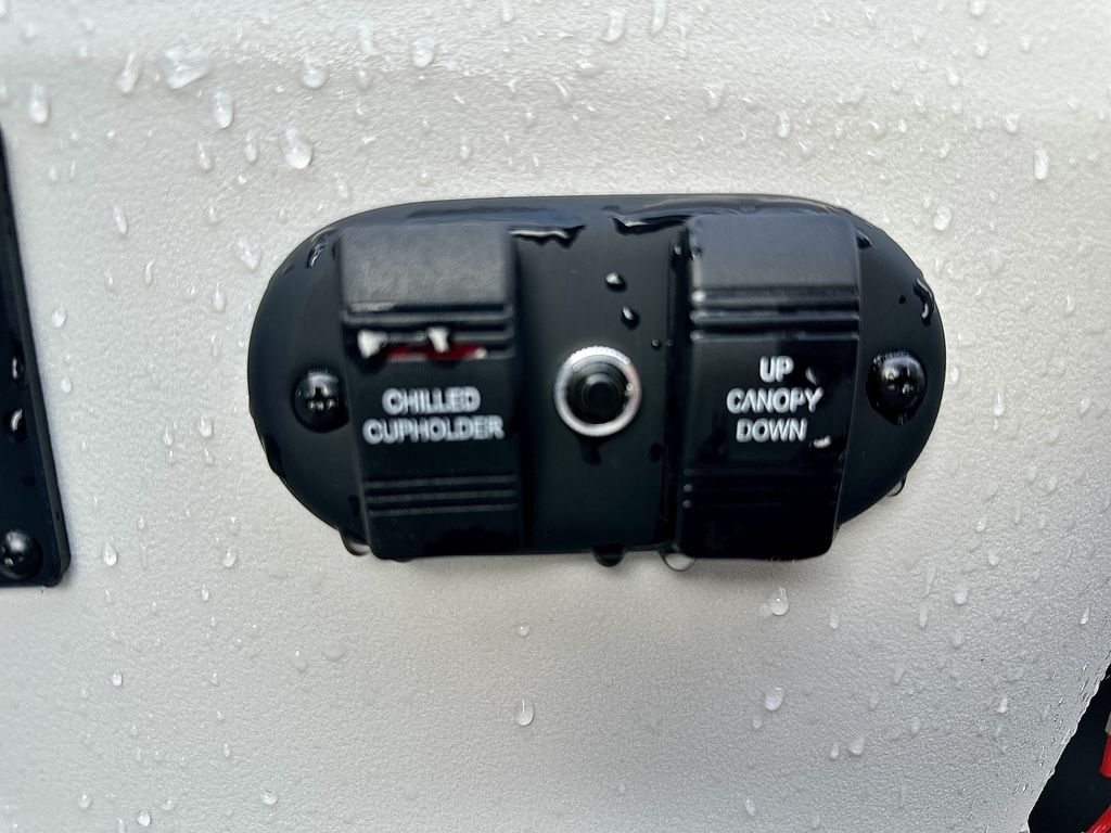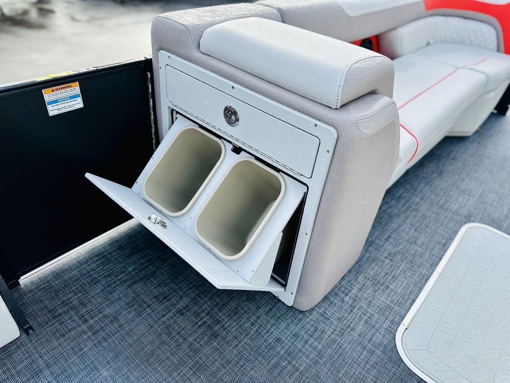 - Our stern storage box, featuring tip-out fender storage and dock line hooks, offers ample space for all your on-the-water essentials.