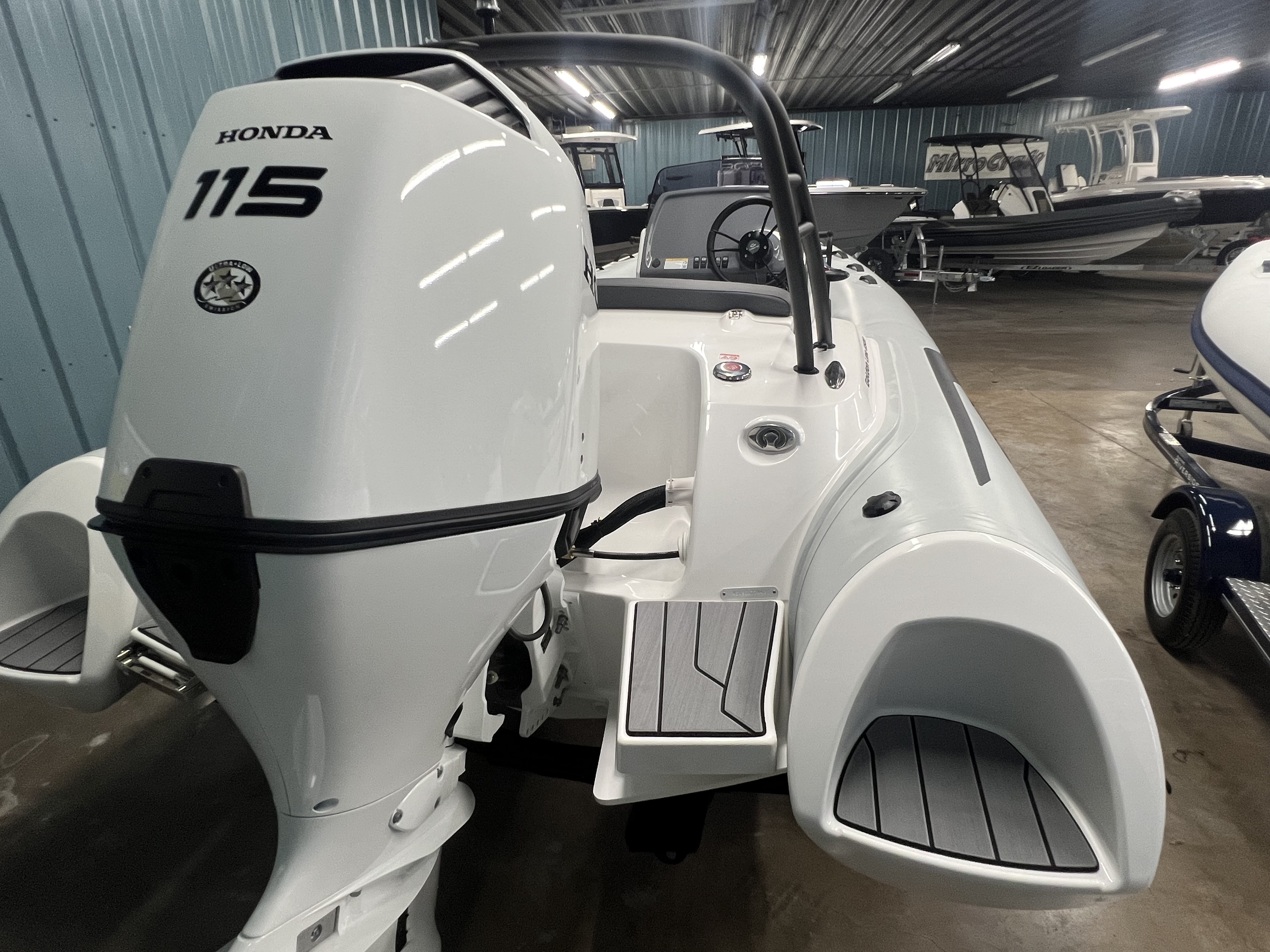 • Fiberglass deep-V hull with self-bailing anti-skid deck