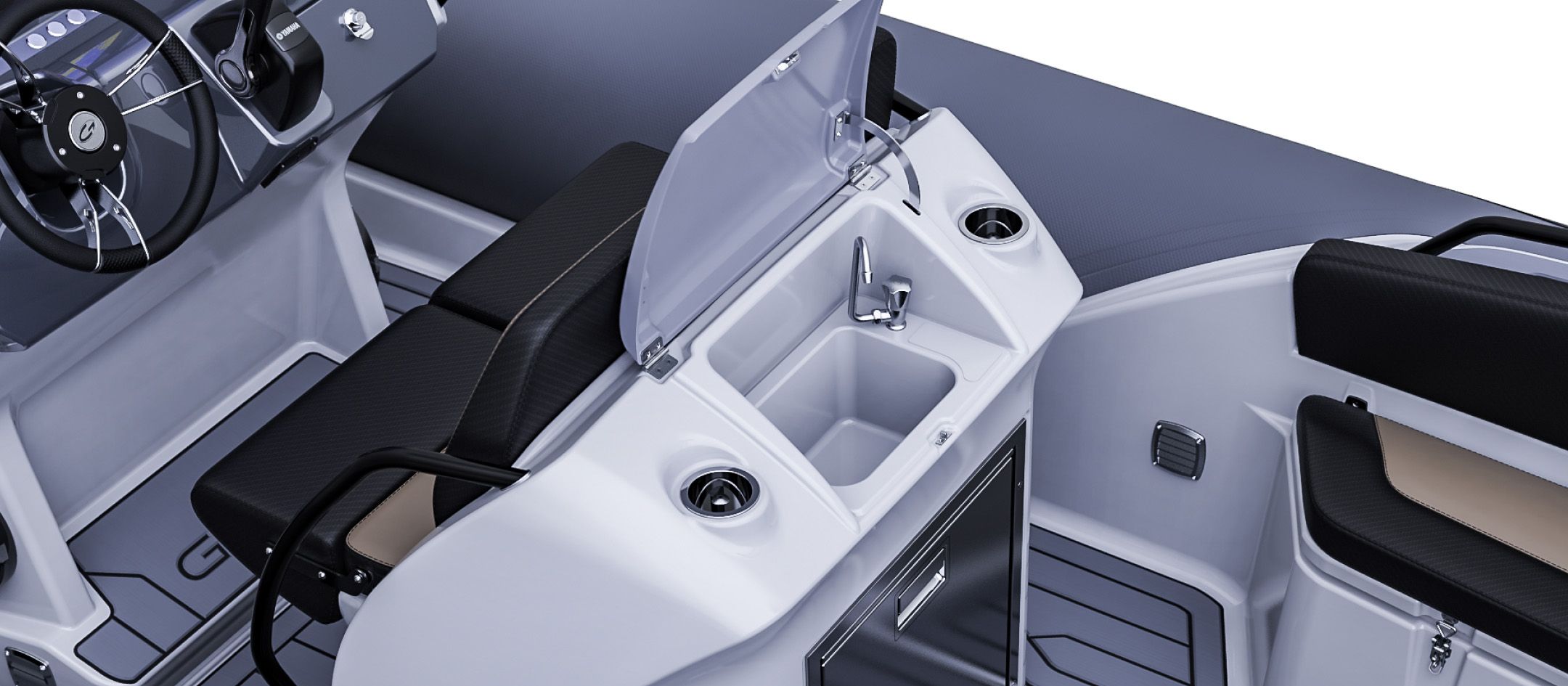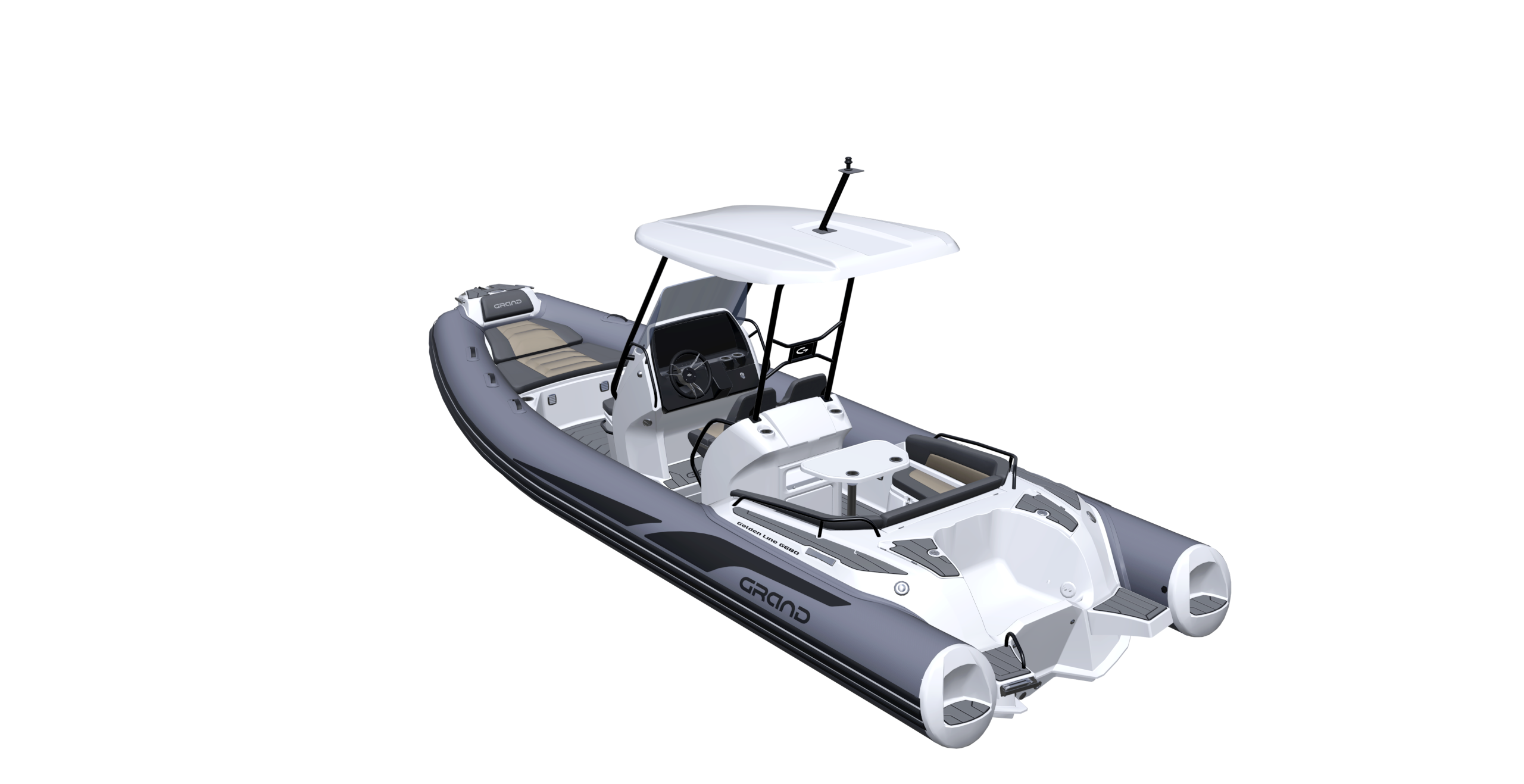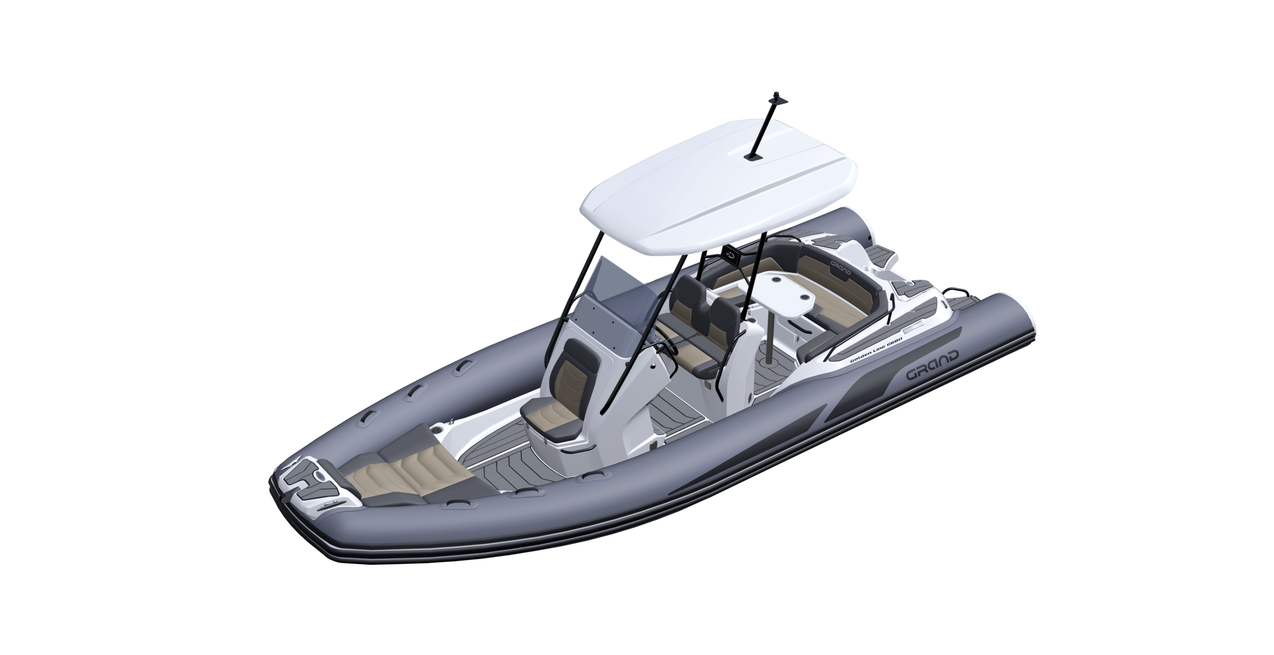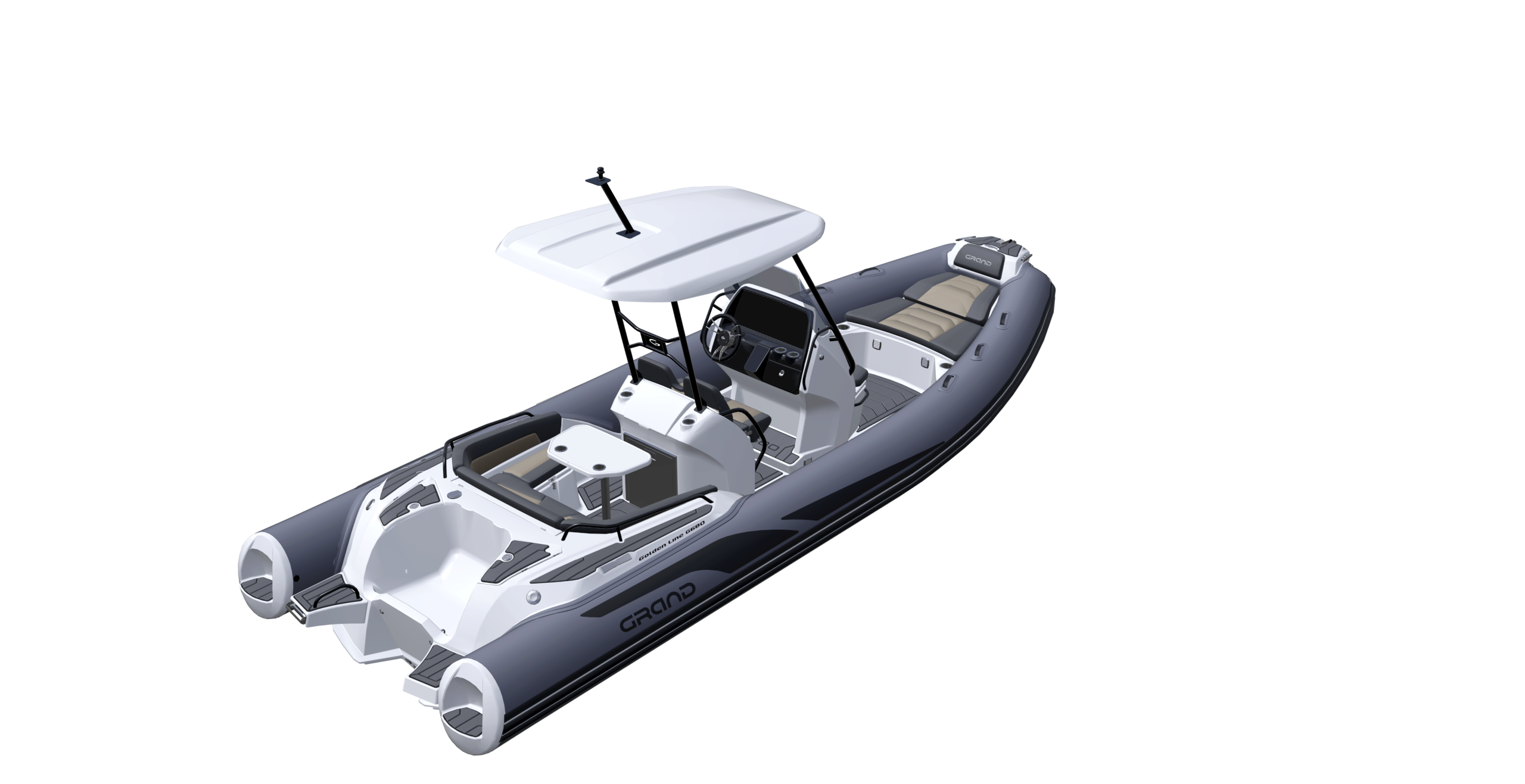 The Grand G680, Our new 6.8m/22ft rigid hull inflatable boat with motor up to 200HP. Released in late 2023, The Grand G680 is a midsize center console RIB, that has combined our classic style with advanced and thoughtful design, to deliver a complete modern day cruising experience. Featuring an optional large refrigerator-freezer, freshwater system with sink and absolutely huge sunbeds, it is a functional, spacious and luxury RIB boat for pleasure cruiser. Discover the true comfort and tranquil boating within.
