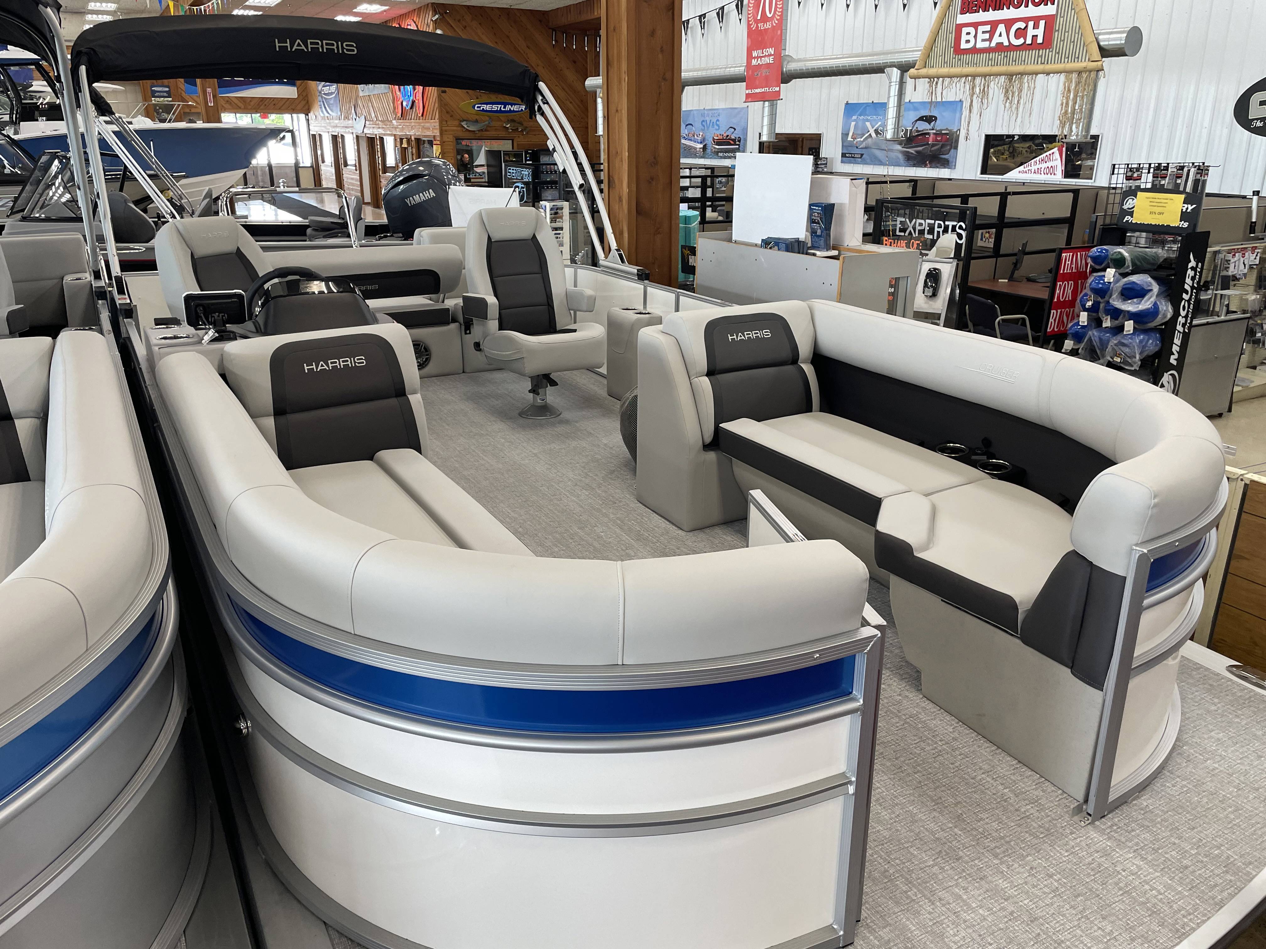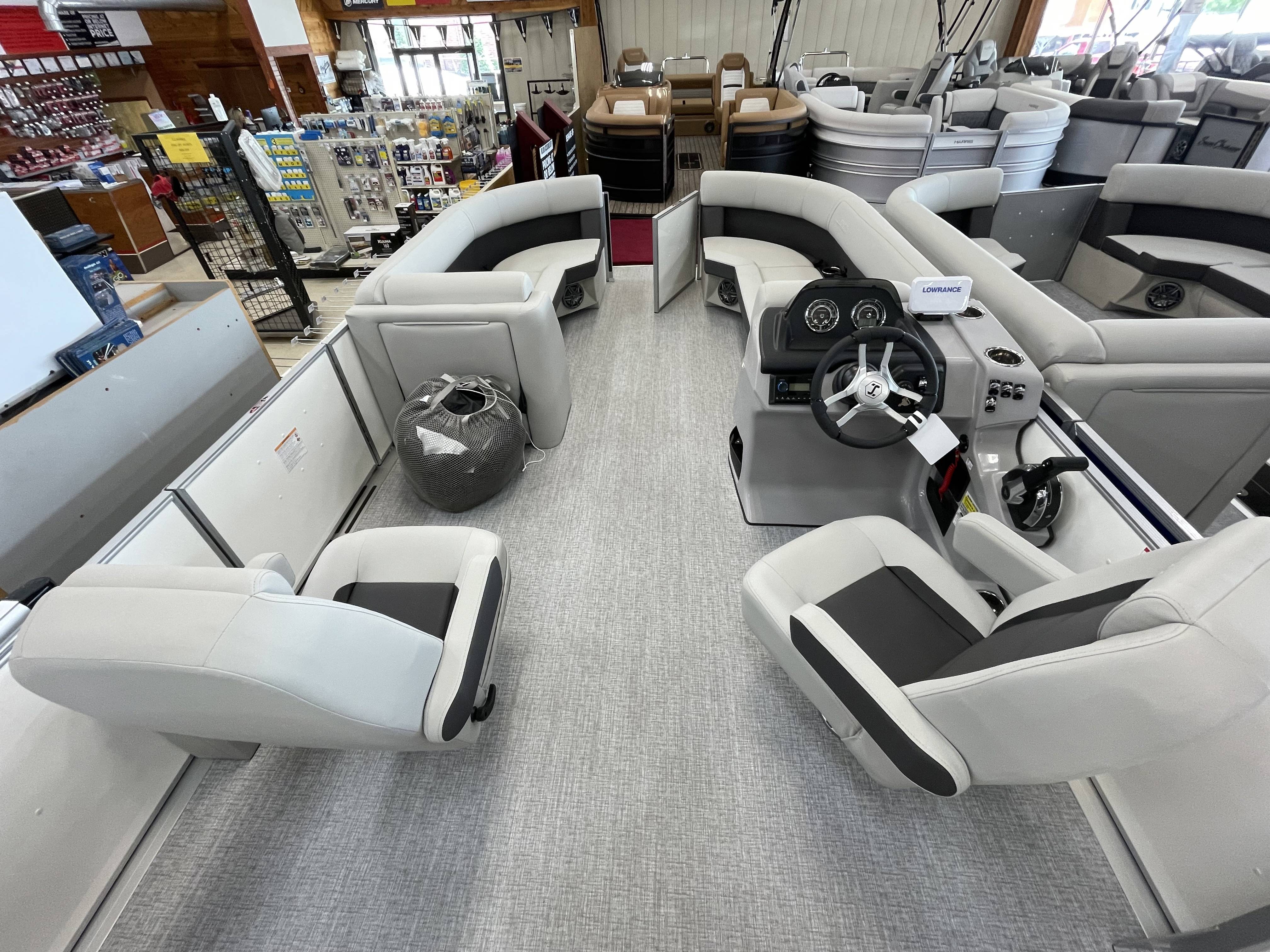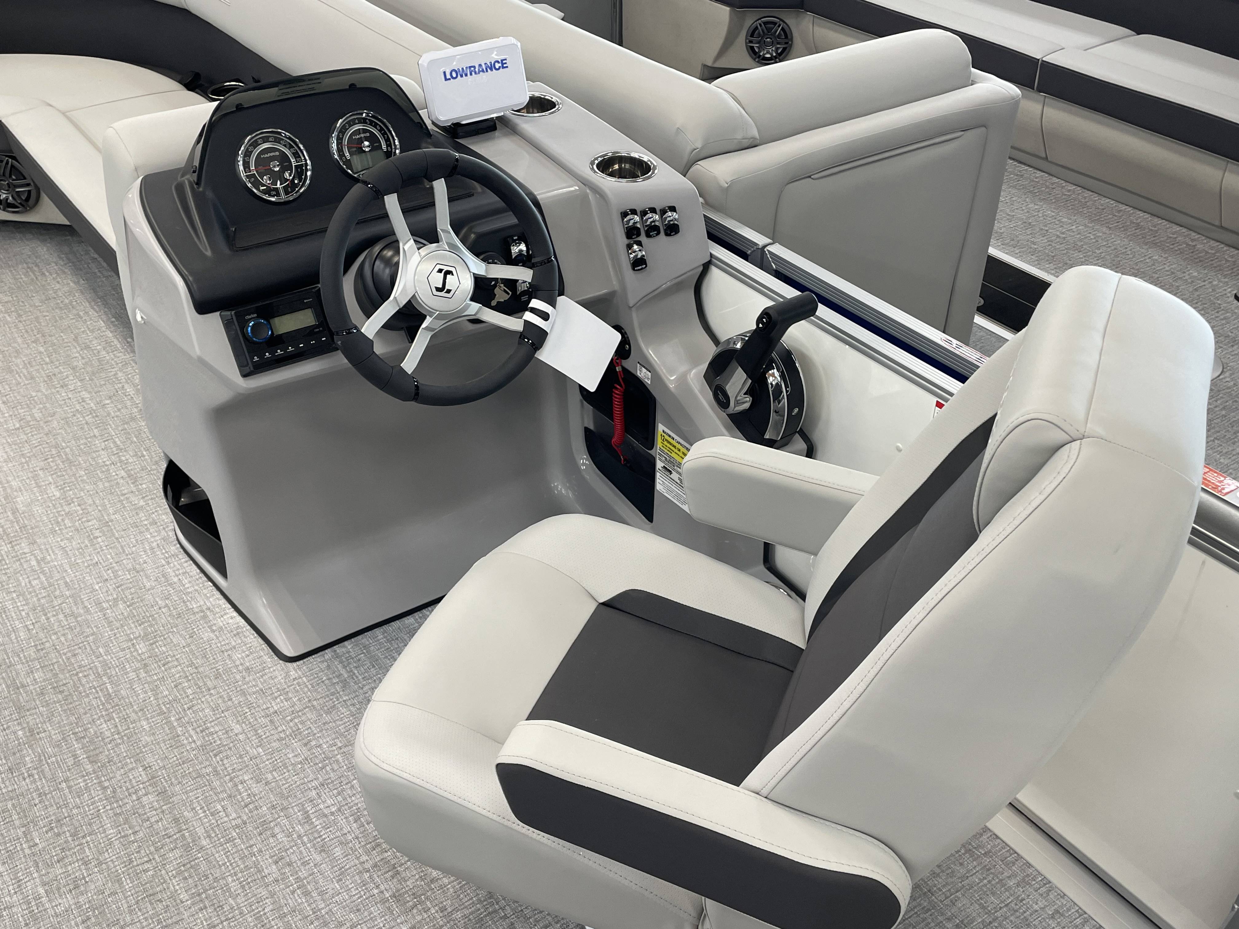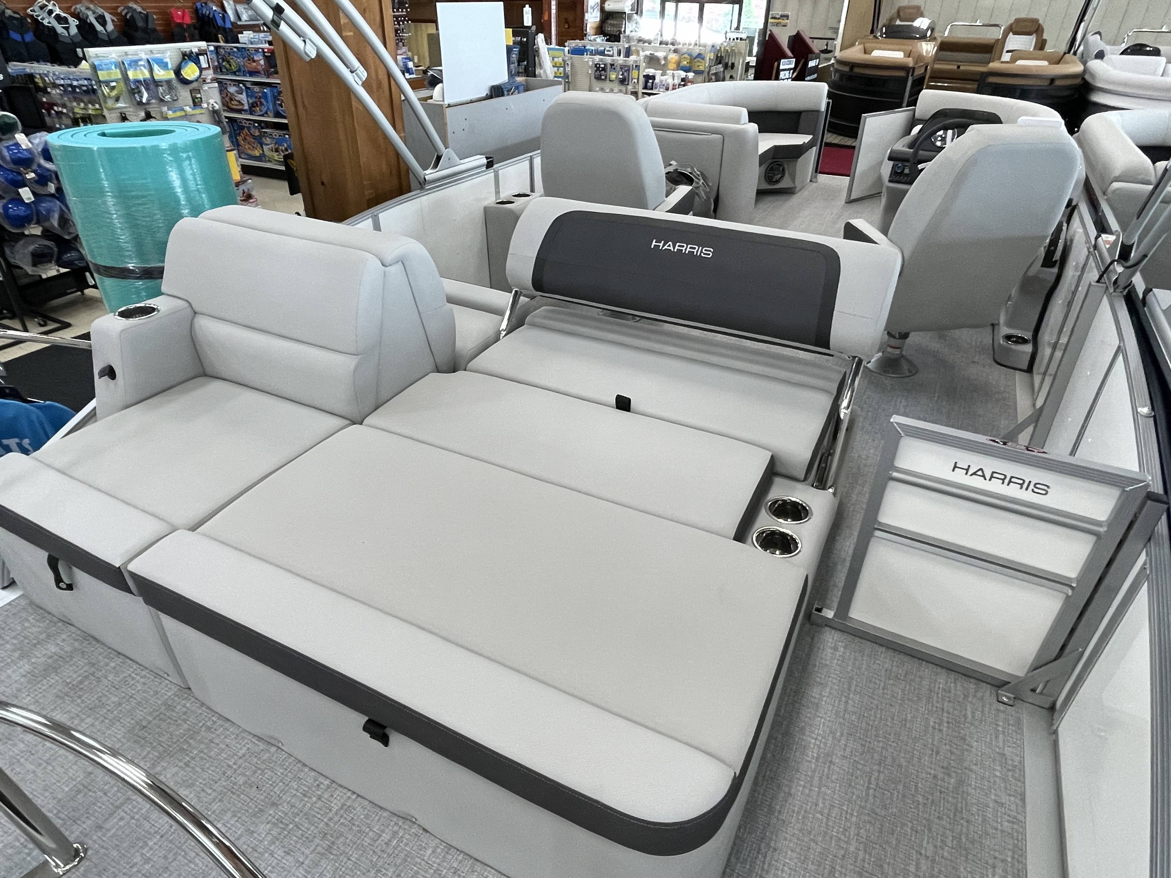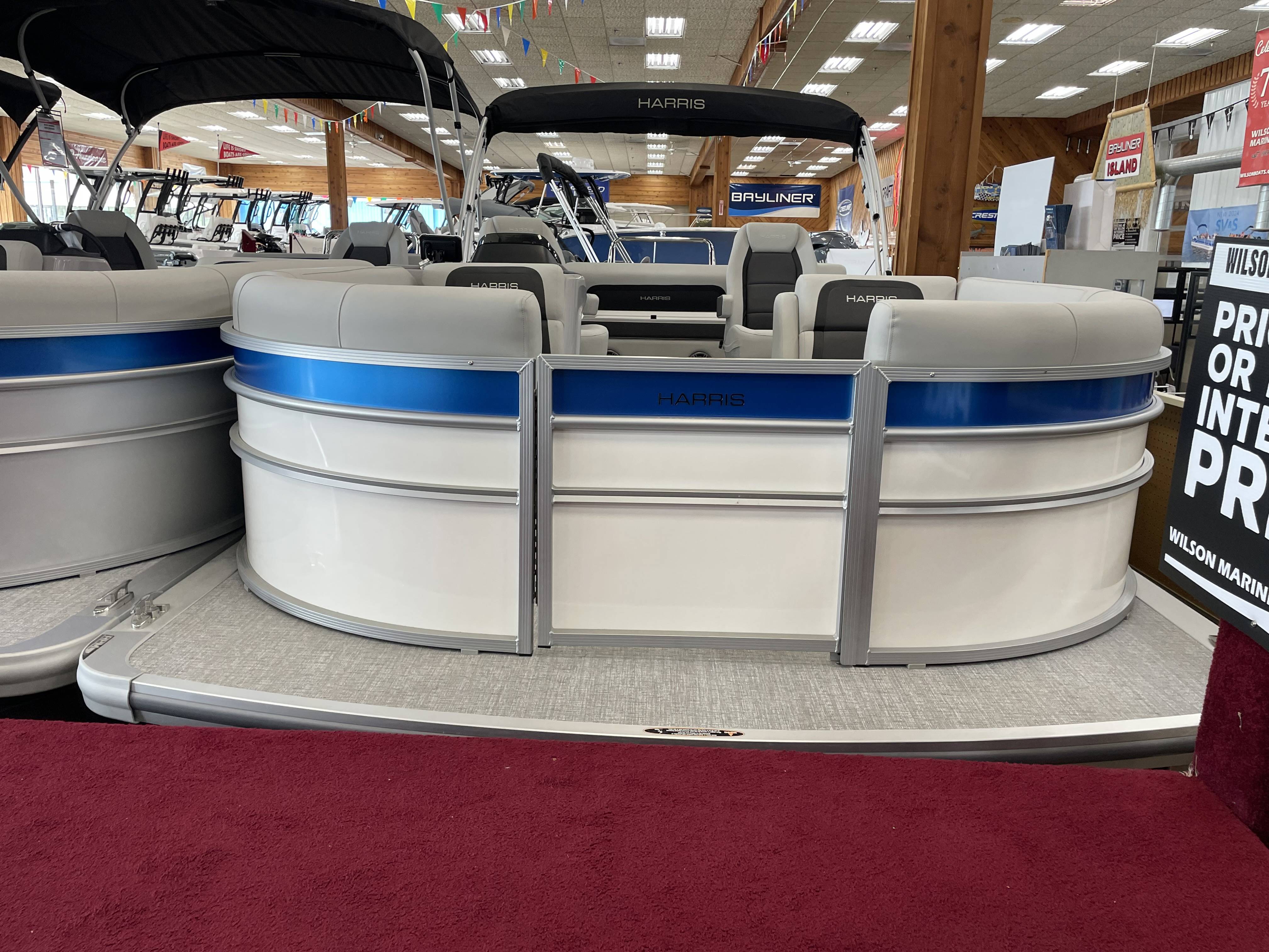 2025 Harris 230 Cruiser with SLDH floorplan and powered by a Mercury 200L!Factory Installed Options:Exterior- ceramic white with vivid blue metallic accentsInterior- tungsten325 chassisContour power bimini top4 step telescoping stainless steel ladderStainless steel ski tow barUltra lux high back helm seatsChanging room with curtainStone gray woven vinyl flooringEagle fish finderClarion stereoStainless steel cupholdersSafety railWoodgrain luxury sport table
