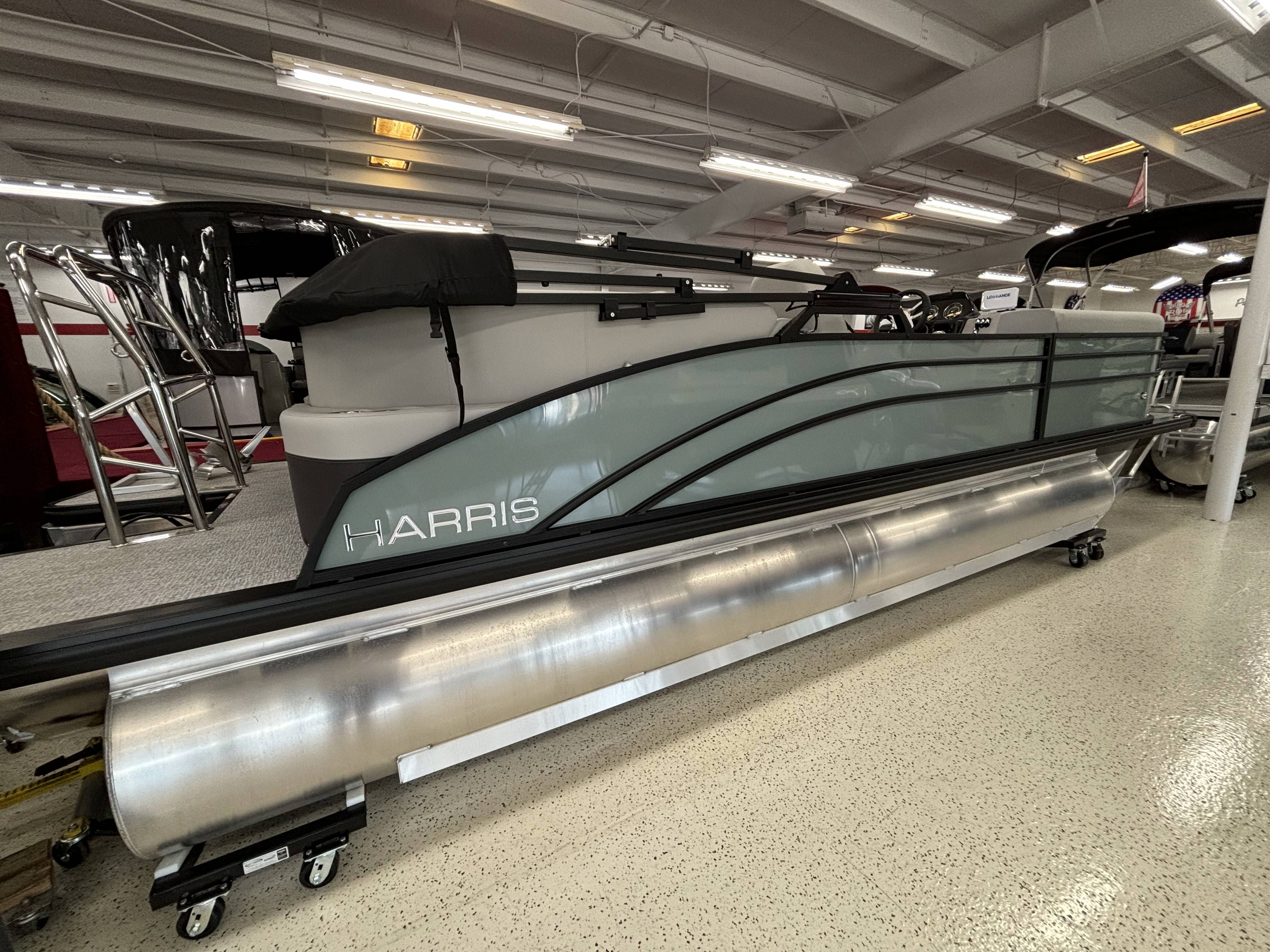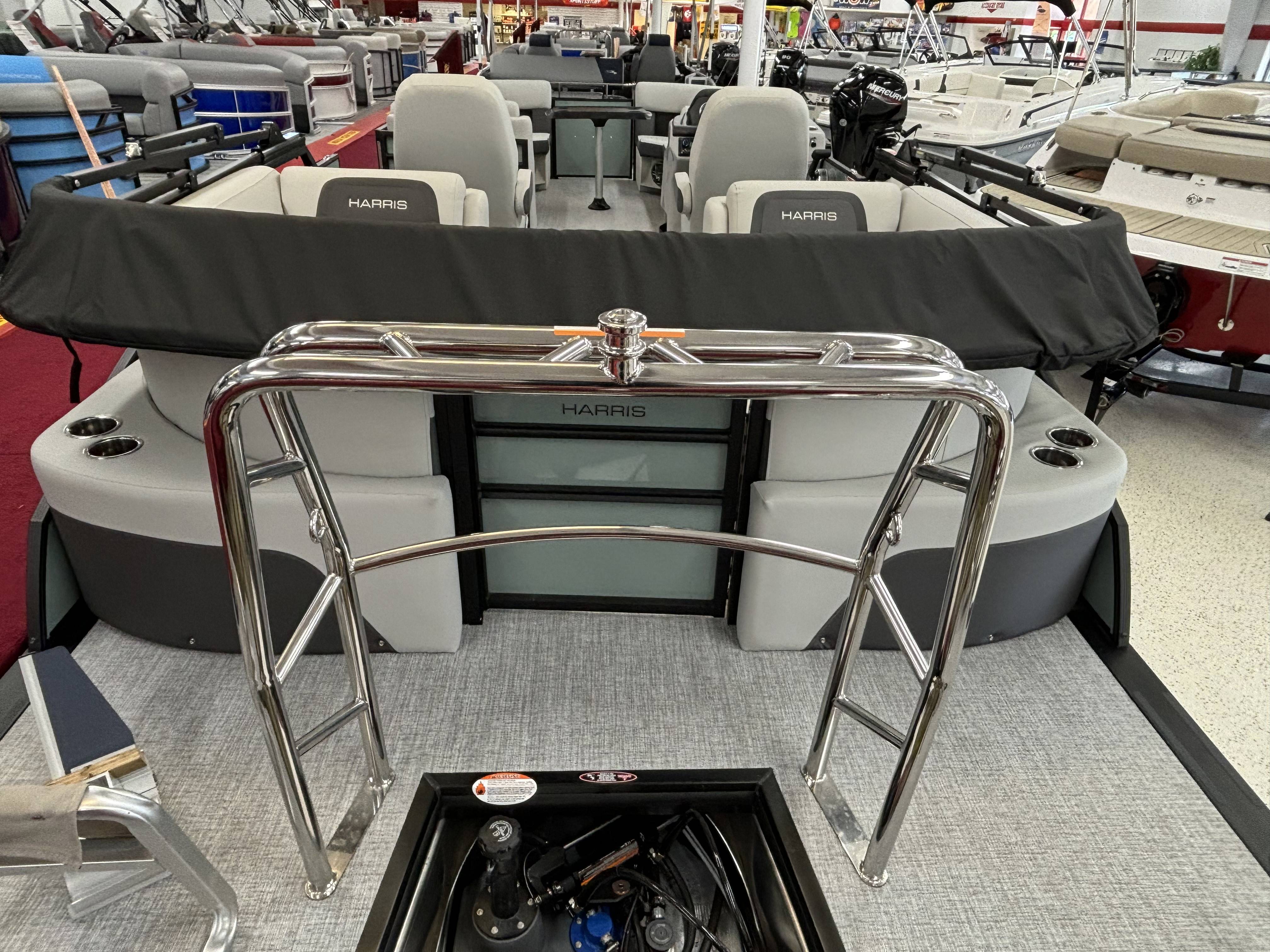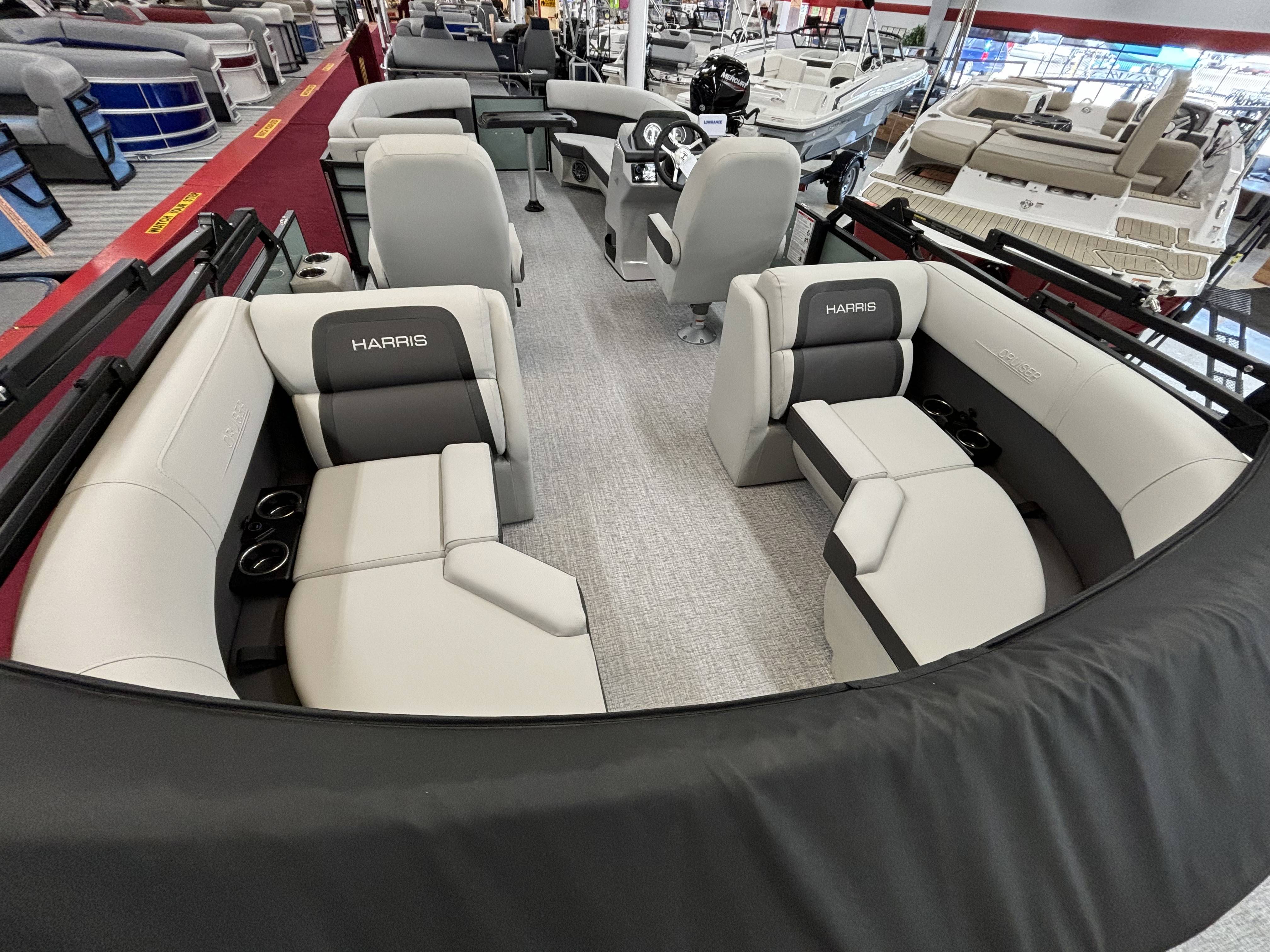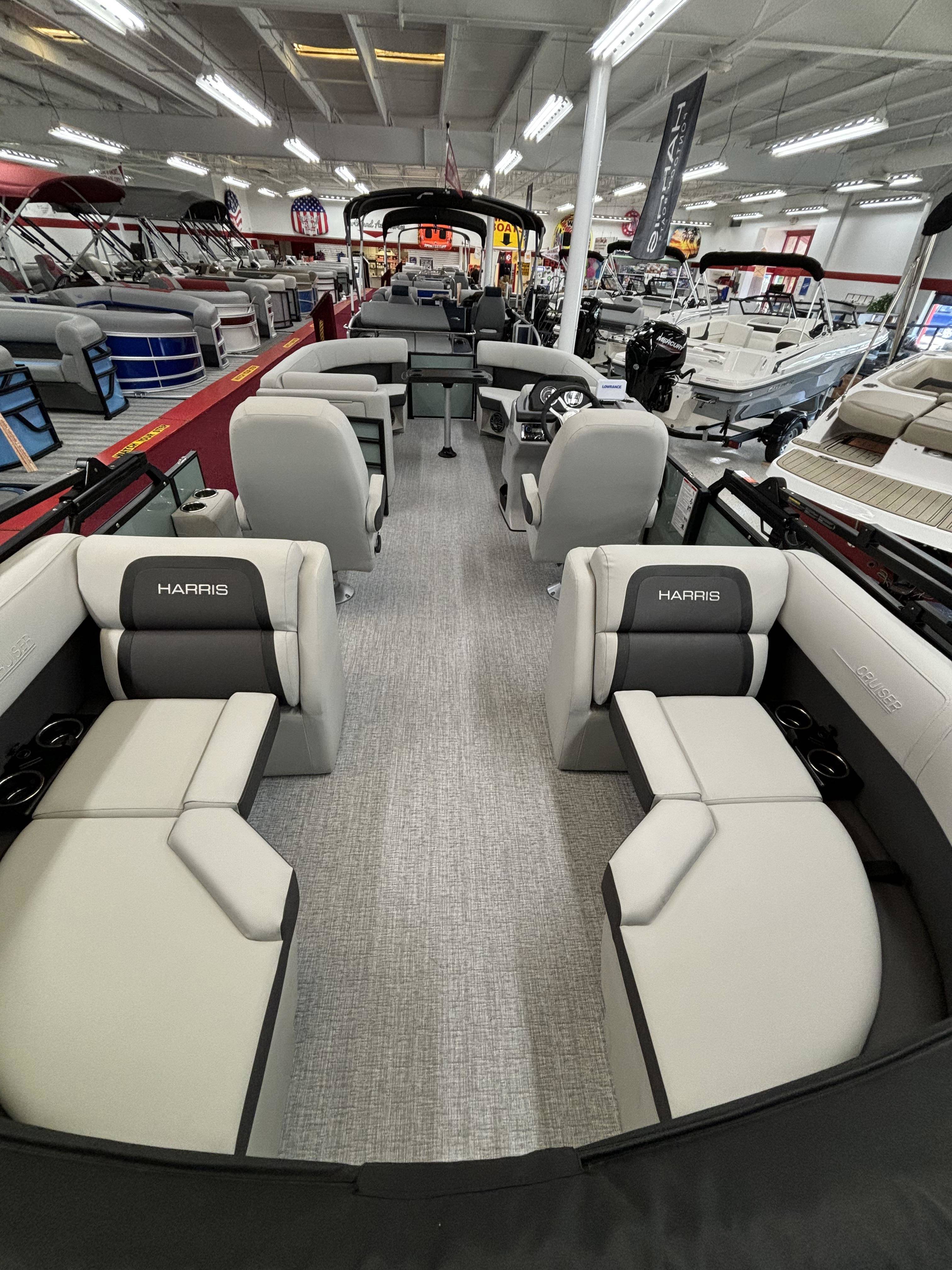 2025 Harris 230 Cruiser with CWDH floorplan and powered by a Mercury 150L 4S!Factory Installed Options:Exterior- sage greenInterior- tungstenBlack edition325 chassisElectric power bimini top4 step telescoping stainless steel ladderStainless steel ski tow barUltra lux high back helm seatsChanging room with curtainStone gray woven vinyl flooringEagle fish finderClarion stereoStainless steel cupholdersWoodgrain luxury sport table