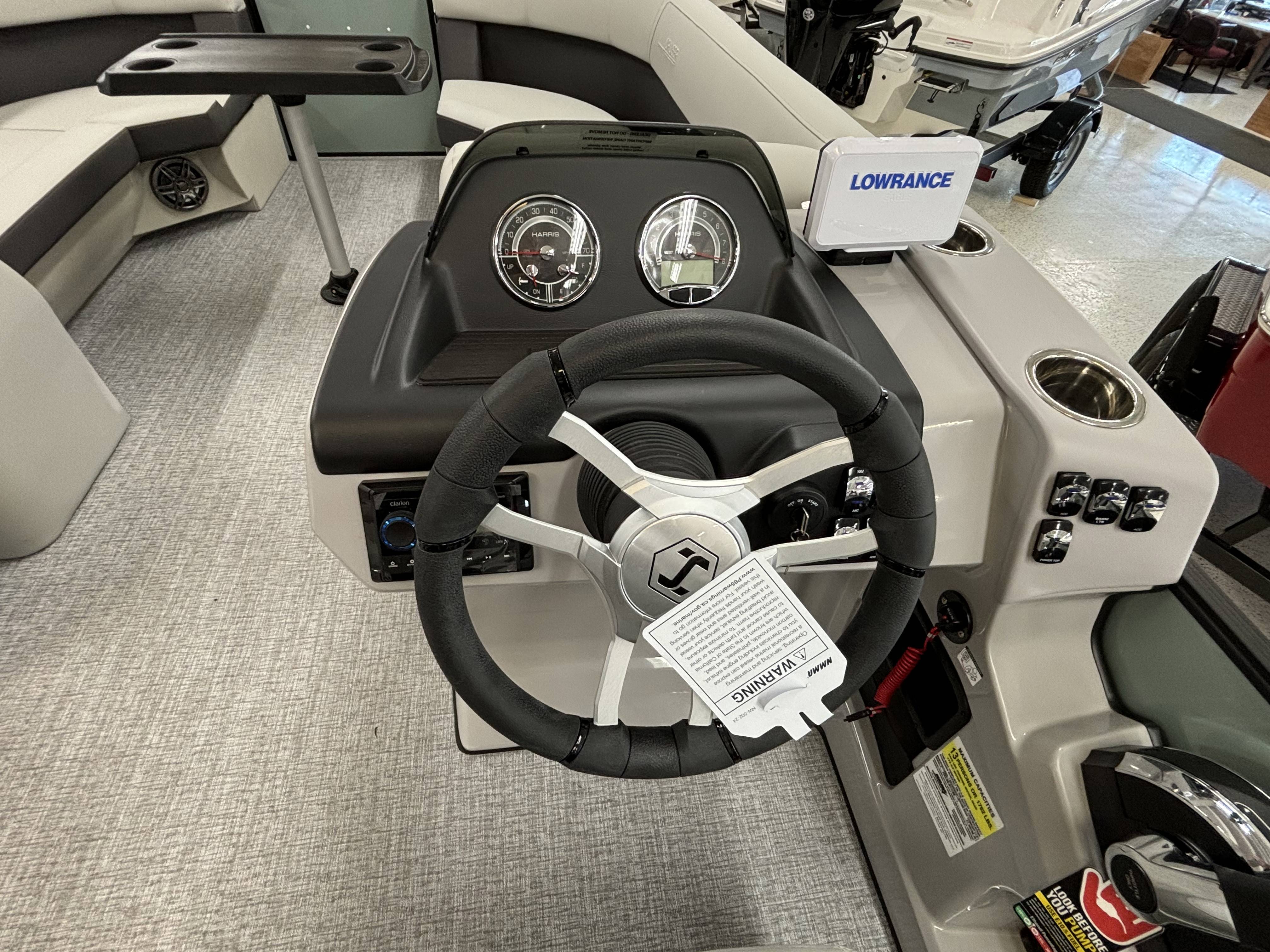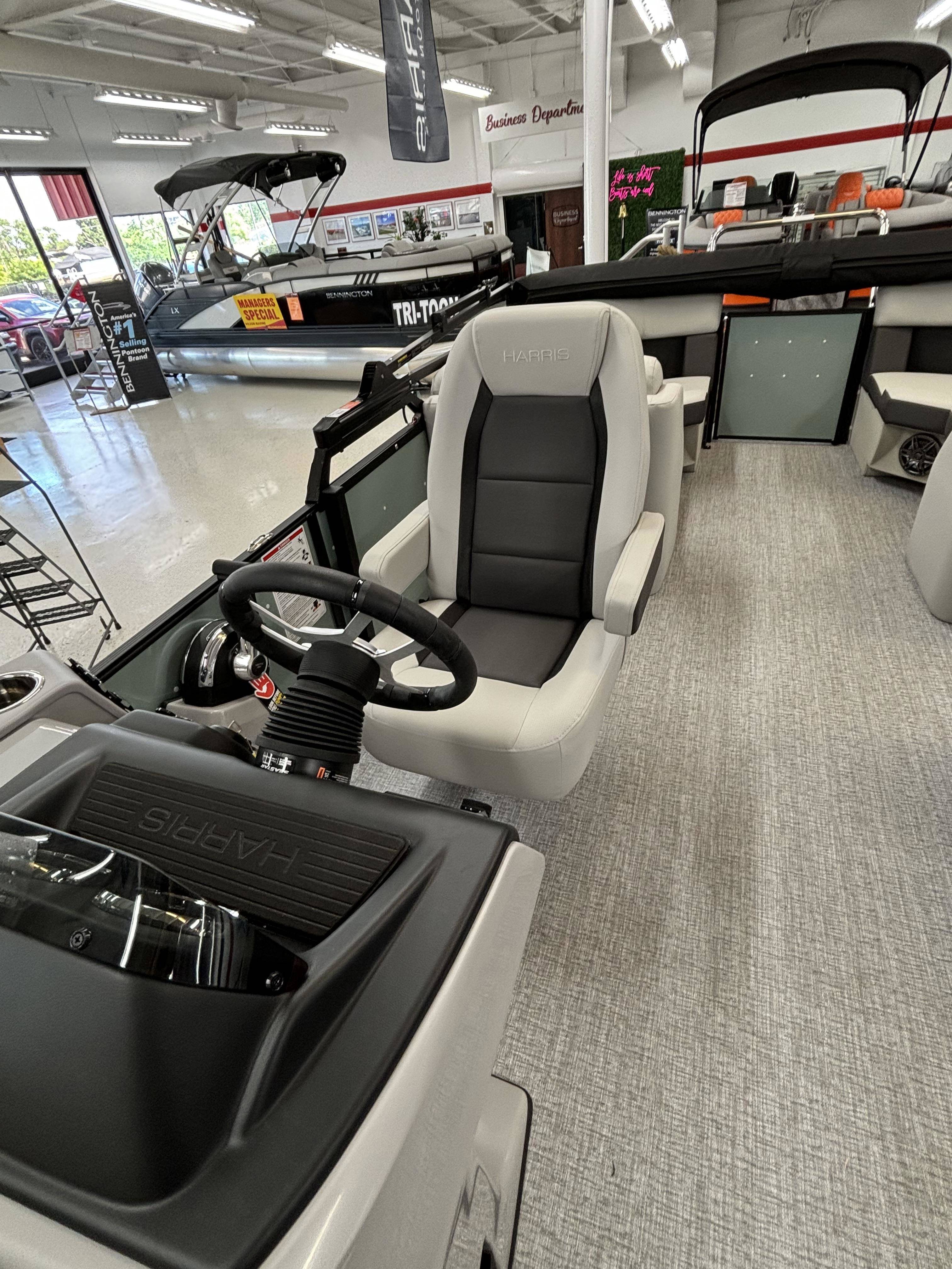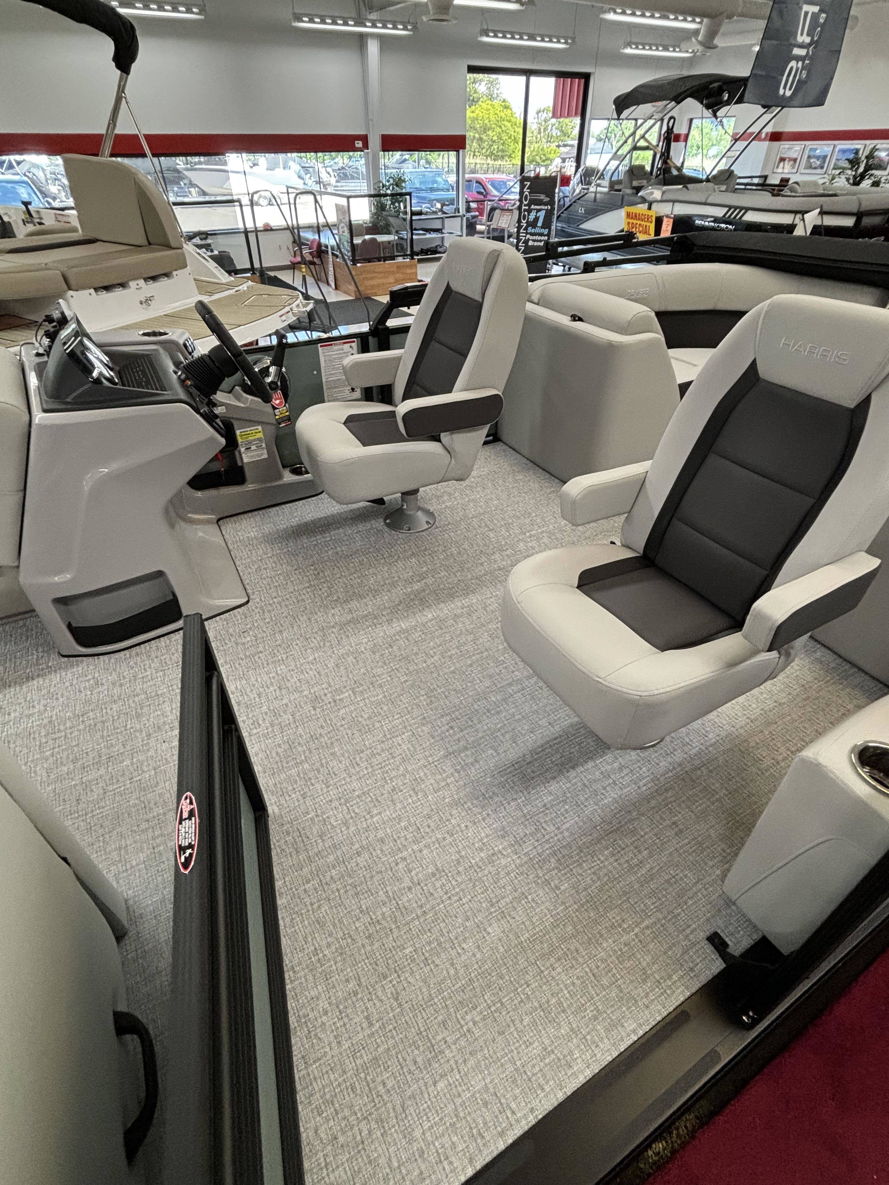 2025 Harris 230 Cruiser with CWDH floorplan and powered by a Mercury 150L 4S!Factory Installed Options:Exterior- sage greenInterior- tungstenBlack edition325 chassisElectric power bimini top4 step telescoping stainless steel ladderStainless steel ski tow barUltra lux high back helm seatsChanging room with curtainStone gray woven vinyl flooringEagle fish finderClarion stereoStainless steel cupholdersWoodgrain luxury sport table
