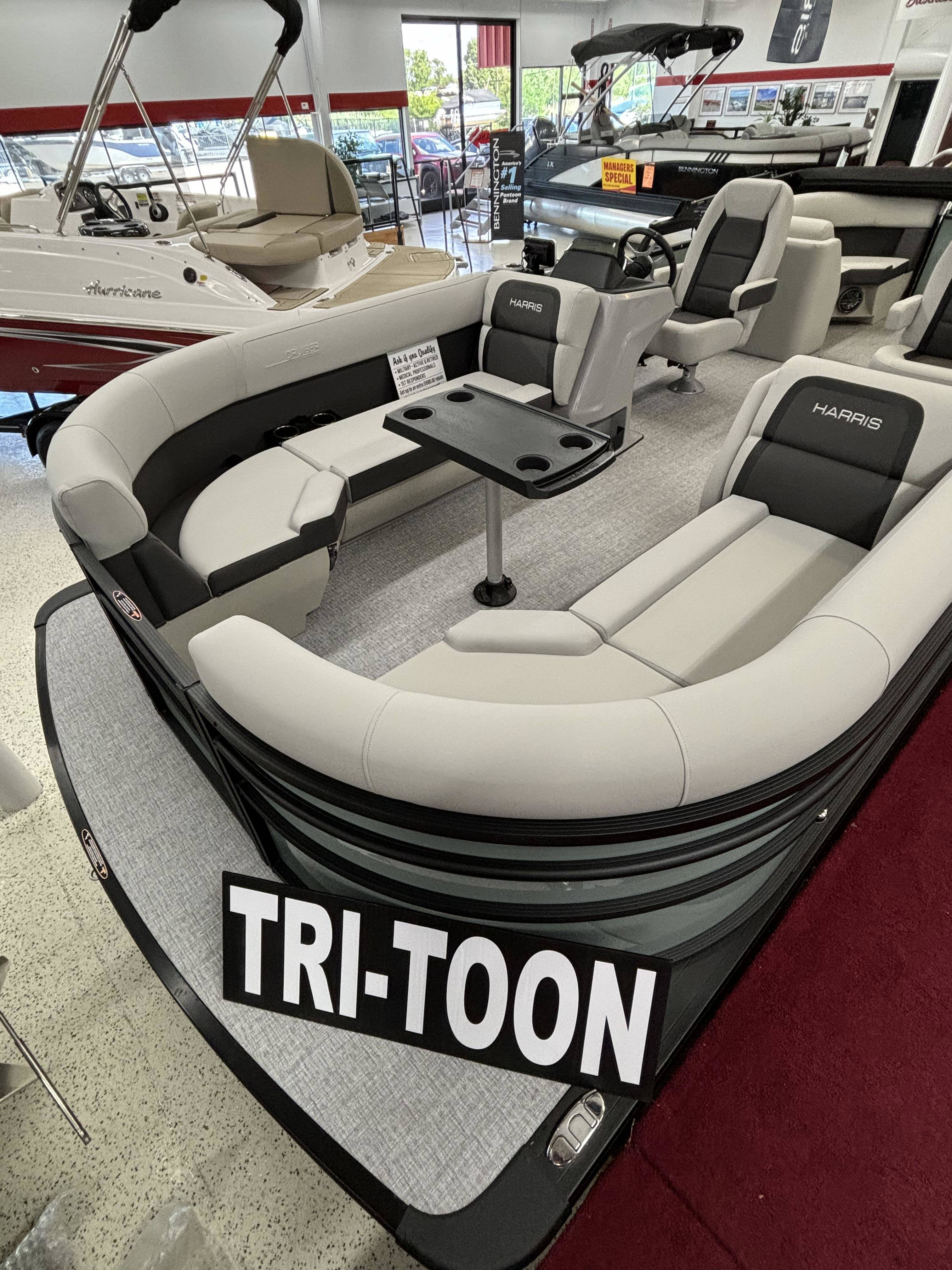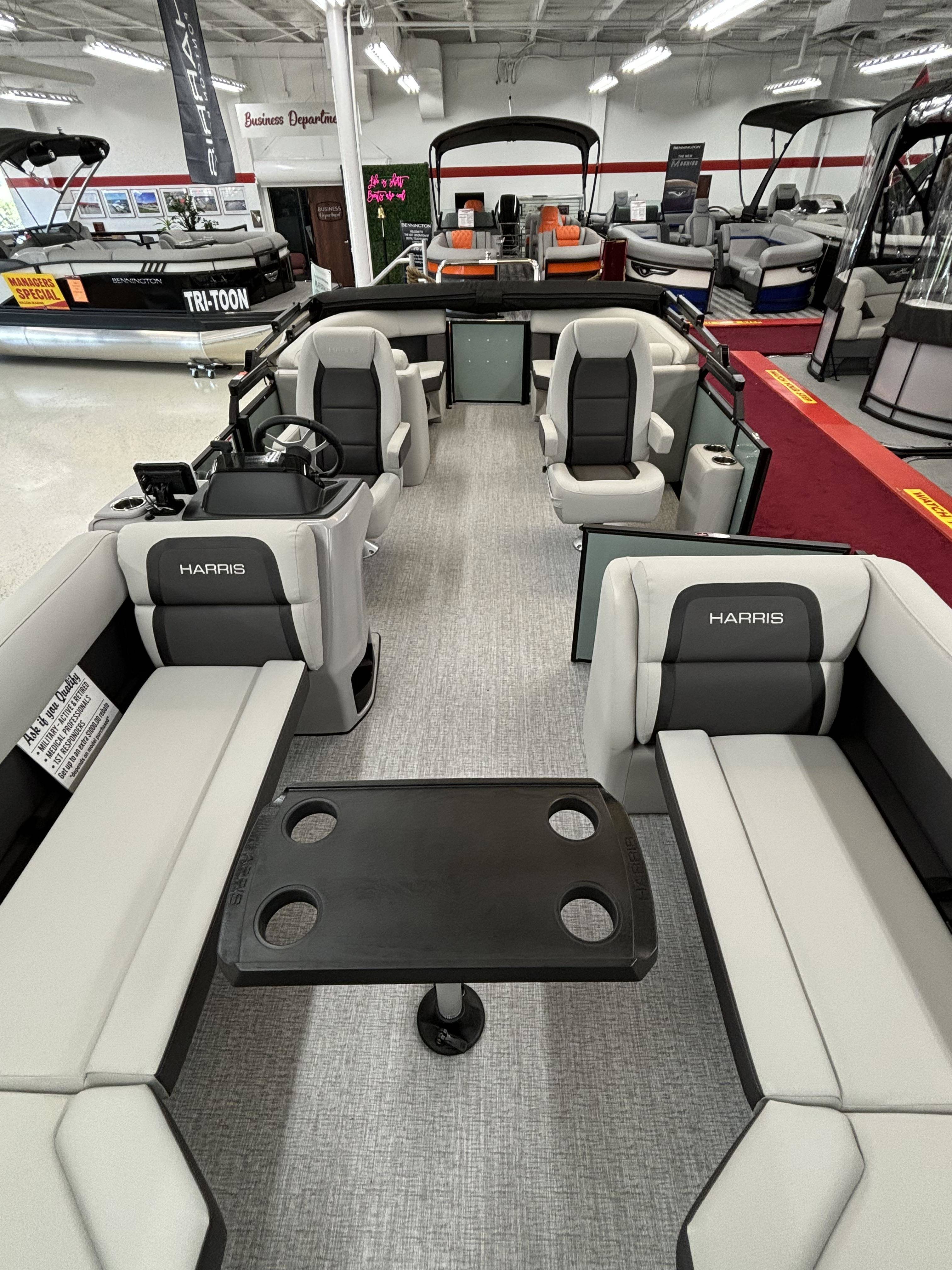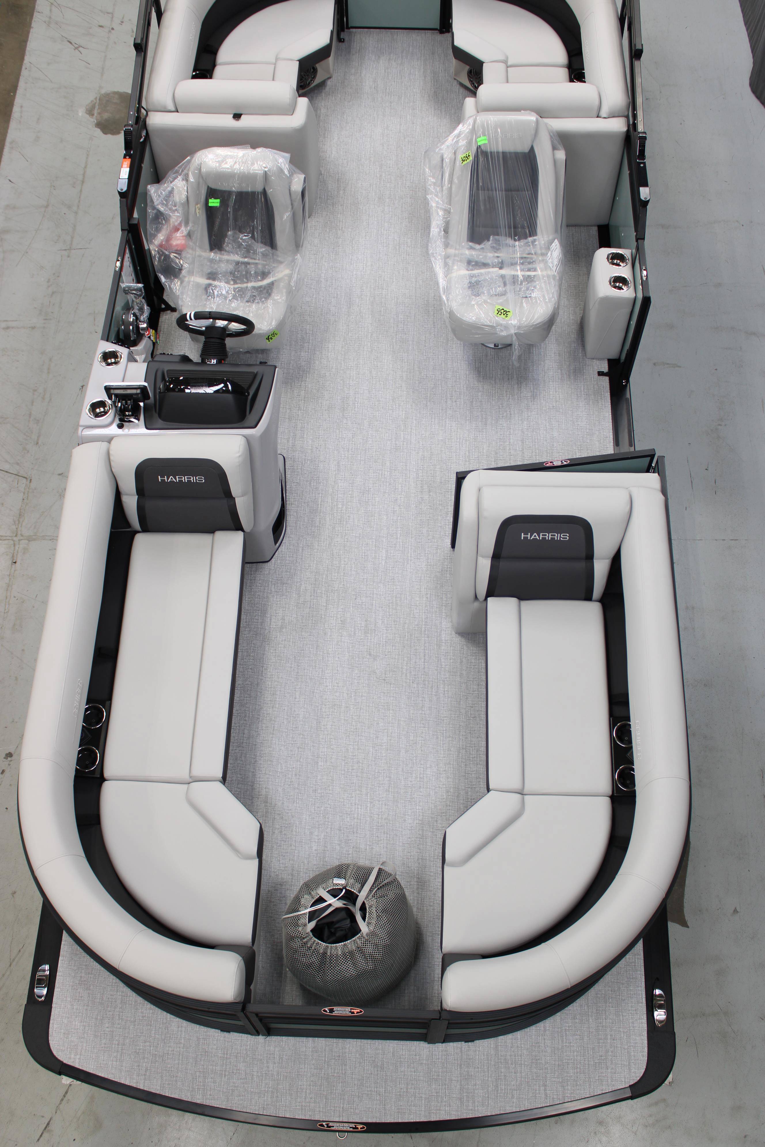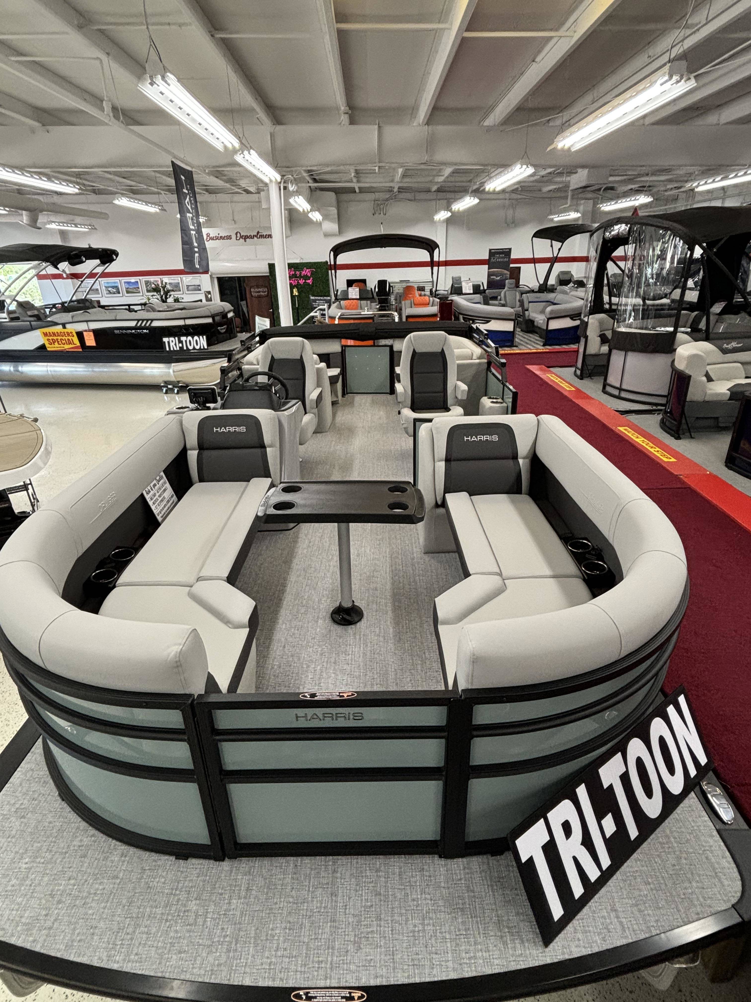 2025 Harris 230 Cruiser with CWDH floorplan and powered by a Mercury 150L 4S!Factory Installed Options:Exterior- sage greenInterior- tungstenBlack edition325 chassisElectric power bimini top4 step telescoping stainless steel ladderStainless steel ski tow barUltra lux high back helm seatsChanging room with curtainStone gray woven vinyl flooringEagle fish finderClarion stereoStainless steel cupholdersWoodgrain luxury sport table