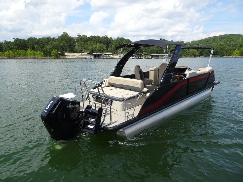 This is a 2025 Harris Grand Mariner 250 SLDH Tri-toon in Black Sapphire w/Blush Red Accent and Luxe Dune Interior. It is powered by a Mercury 350hp Verado V-10 4-Stroke DTS/PAS with 9 hours and has the following options: