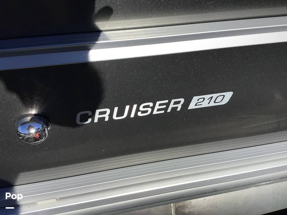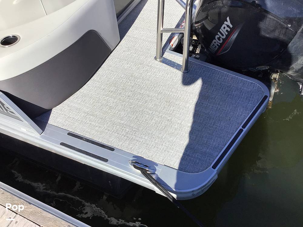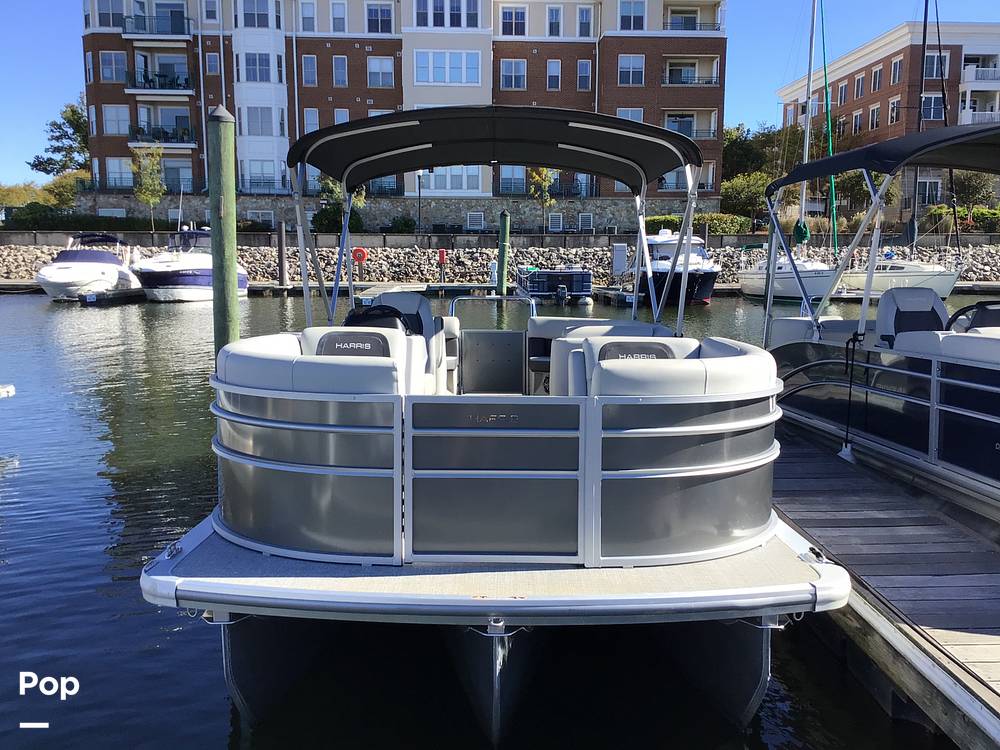 This Harris HCX21 offers amenities such as a Bimini top for shade, a swim ladder for easy access to the water, and a helm console with various controls.