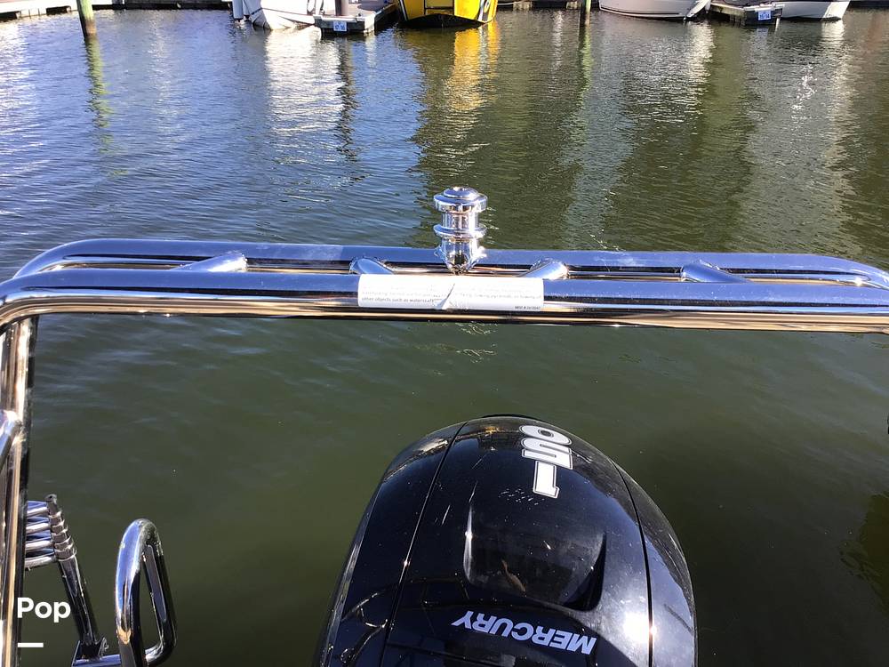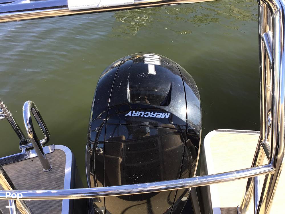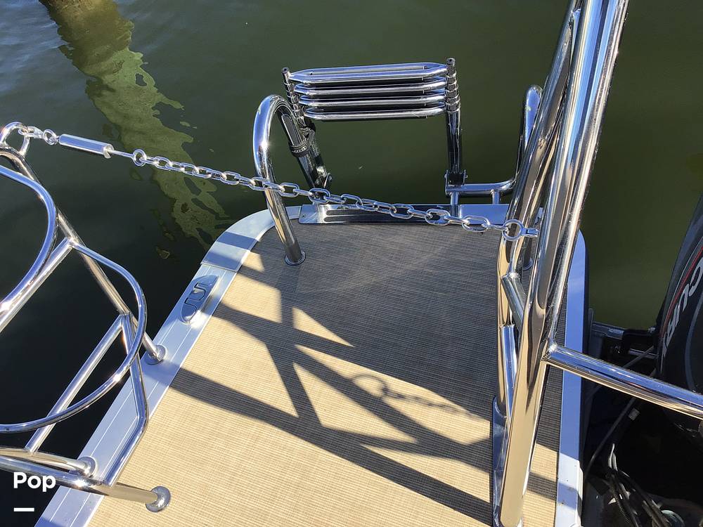 This Harris HCX23 offers amenities such as a Bimini top for shade, a swim ladder for easy access to the water, and a helm console with various controls.