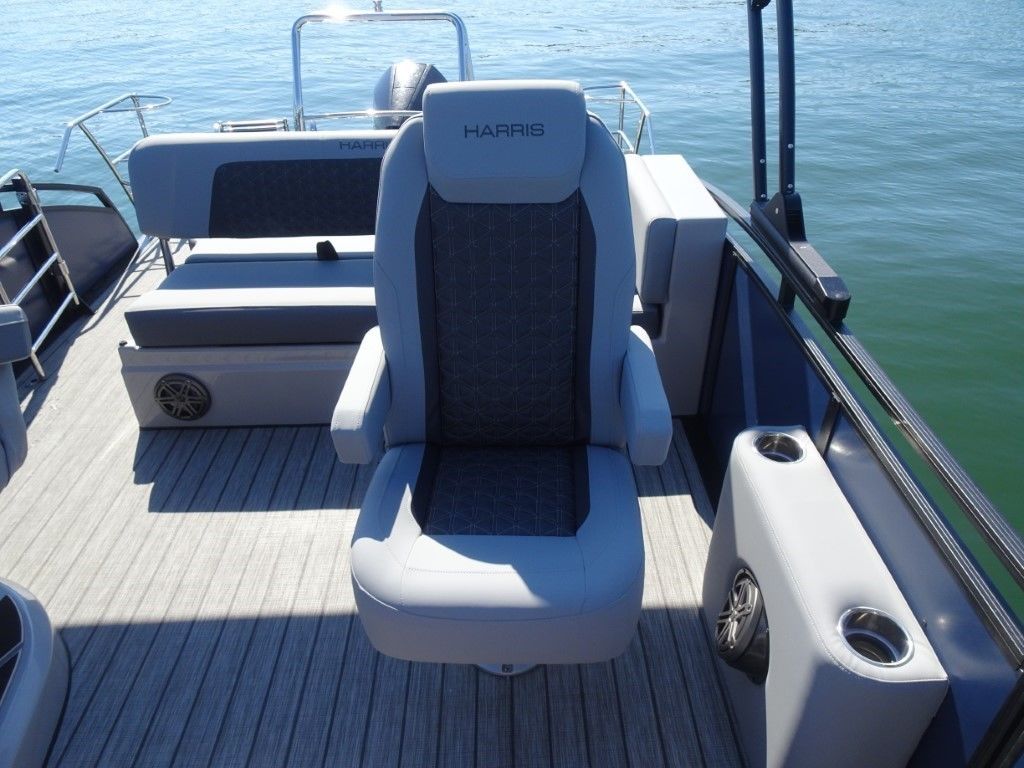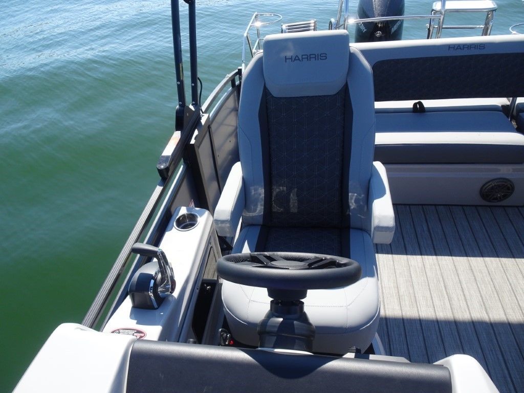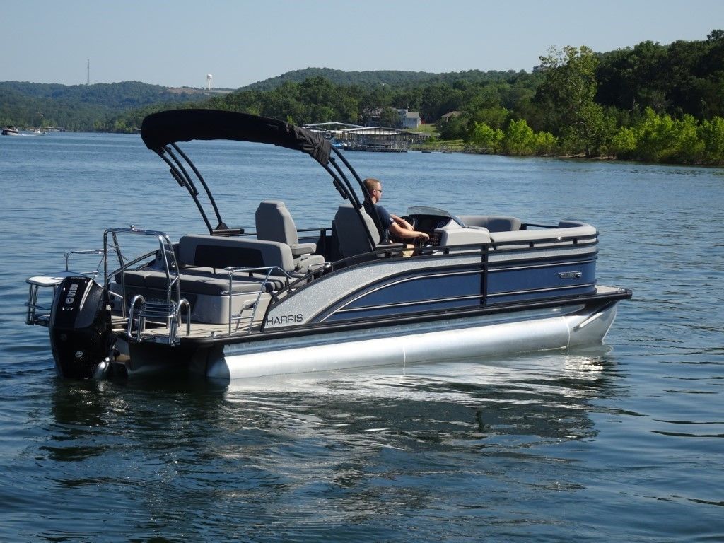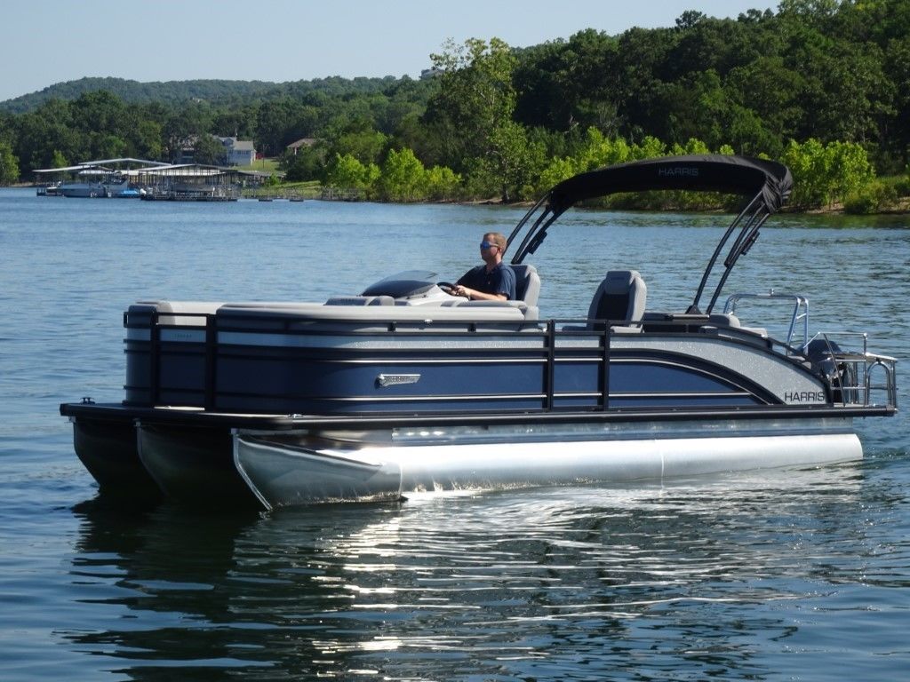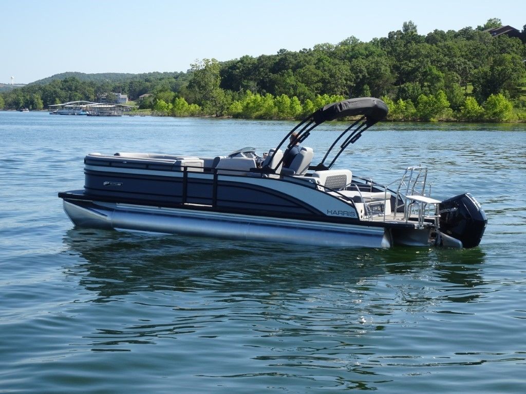 This is a brand new 2025 Harris Solstice 250 SLDH Tri-toon in Matte Midnight Blue Fence Color w/ Platinum Silver Accent and Luxury Shade Grey Interior. It is powered by a Mercury 250hp Verado 4-Stroke. It also has the following options: