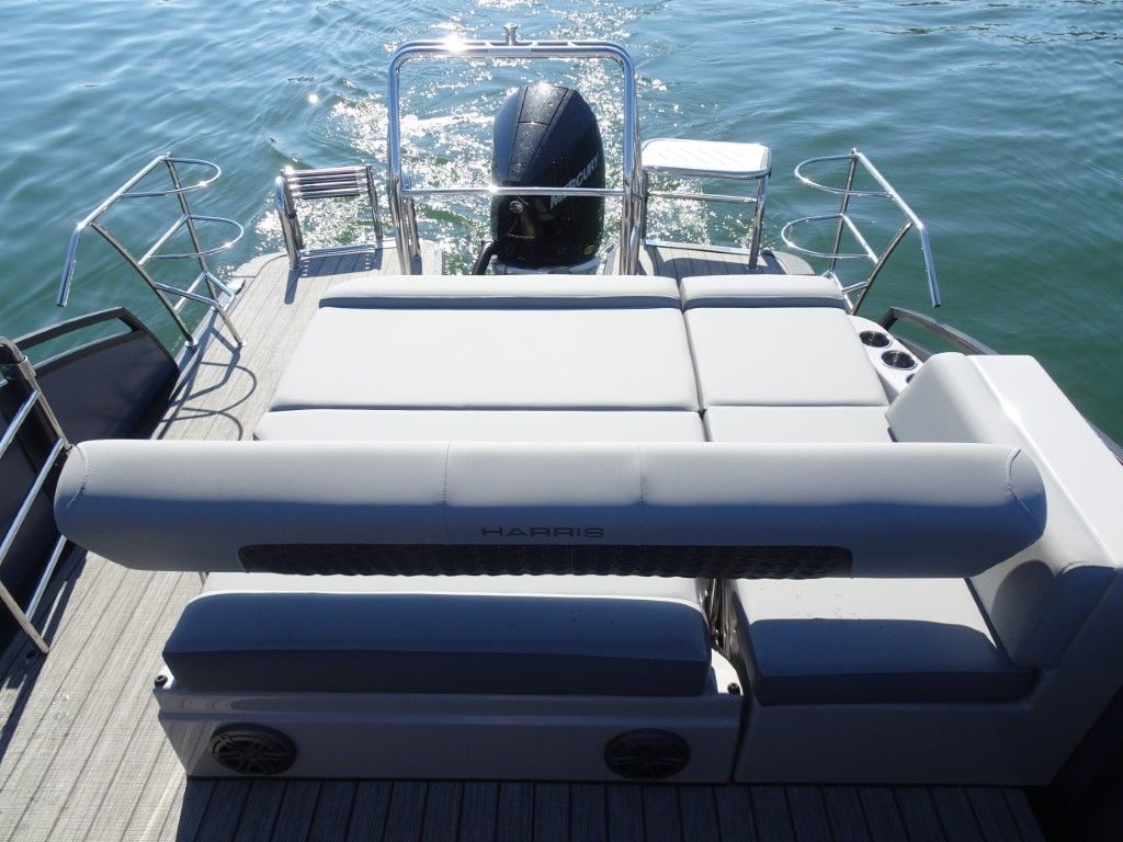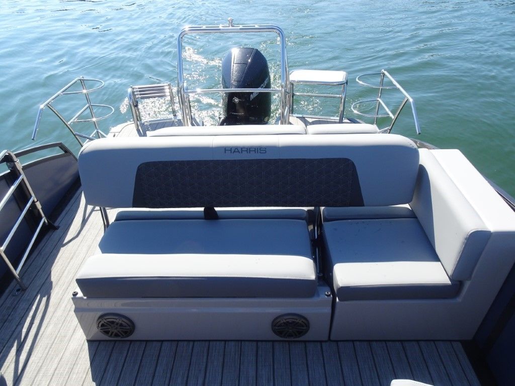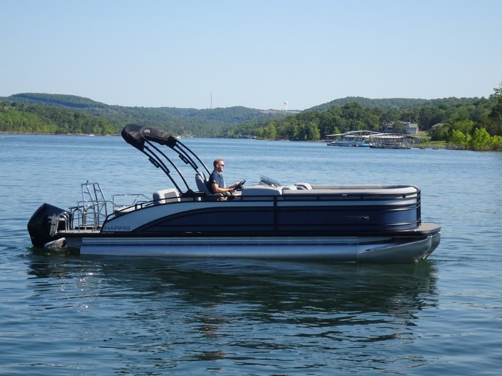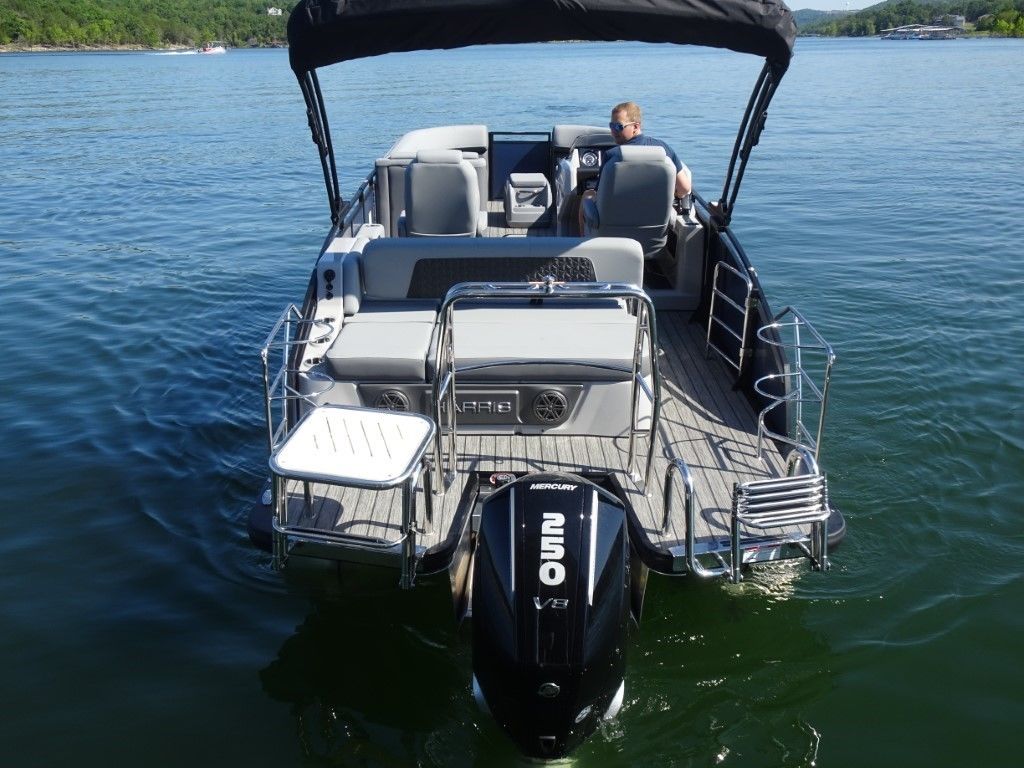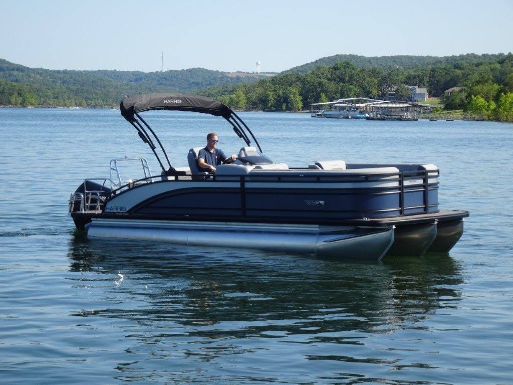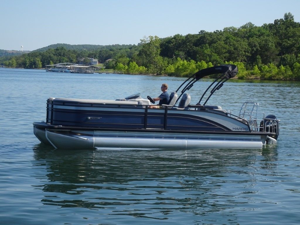This is a brand new 2025 Harris Solstice 250 SLDH Tri-toon in Matte Midnight Blue Fence Color w/ Platinum Silver Accent and Luxury Shade Grey Interior. It is powered by a Mercury 250hp Verado 4-Stroke. It also has the following options: