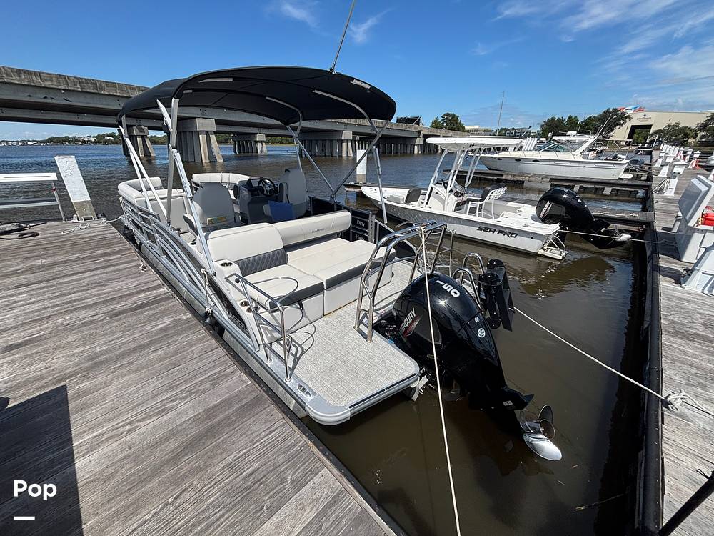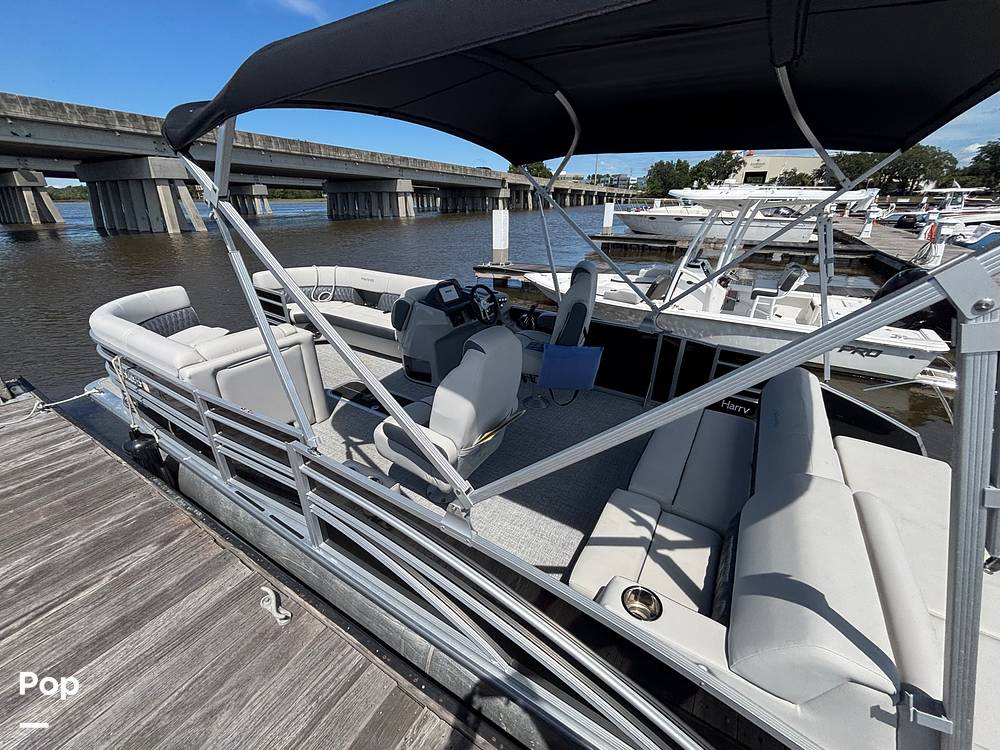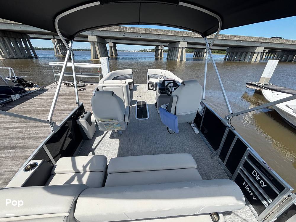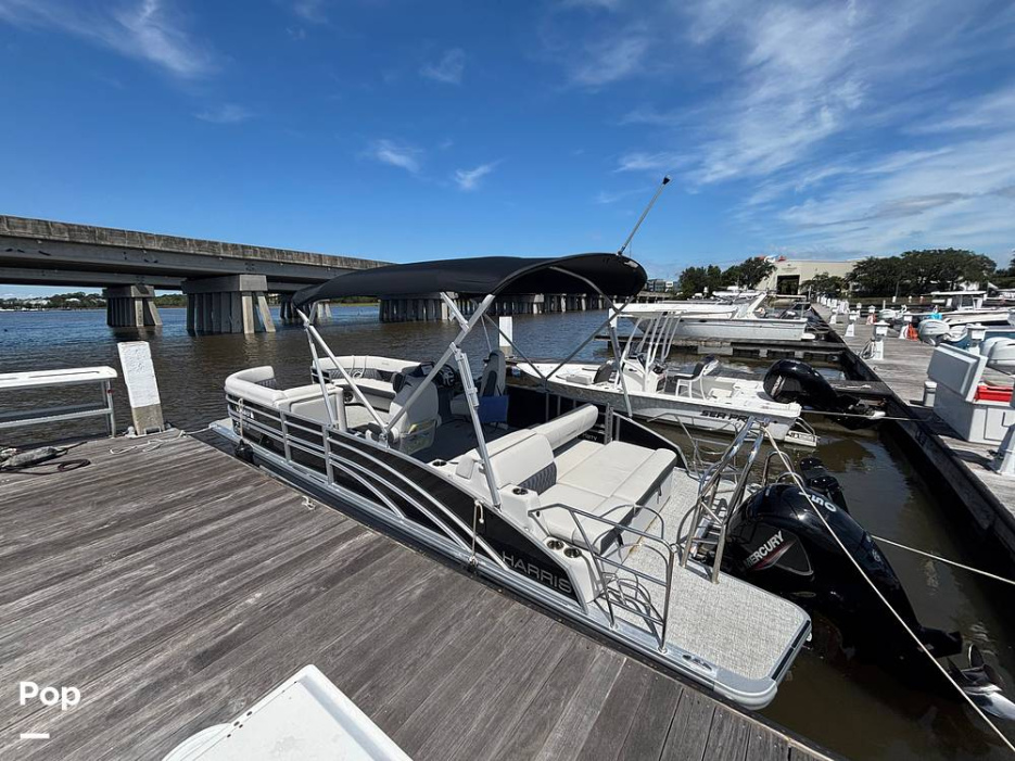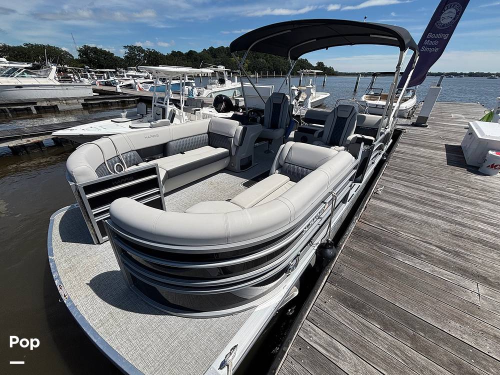 2025 Harris Sunliner 230 model with all the bells and whistles for sale, powered by a Mercury 150 HP 4-stroke engine. This boat boasts over 25ft total deck space.