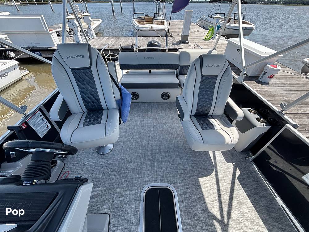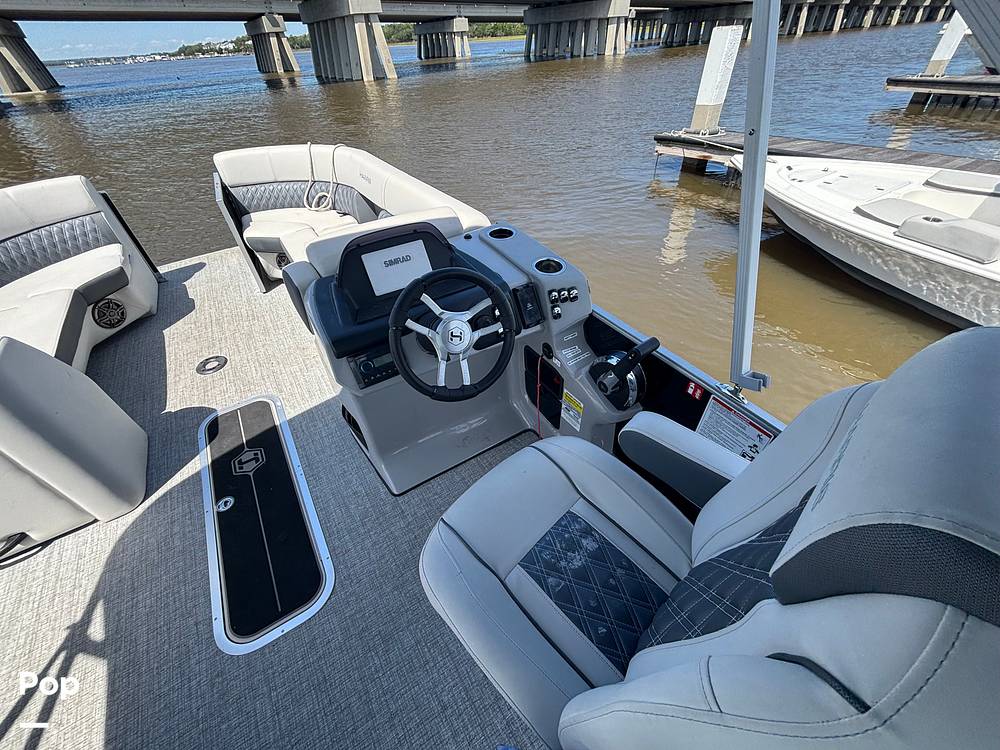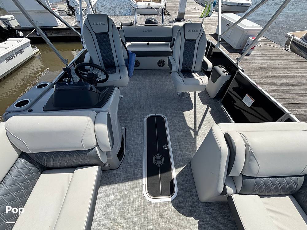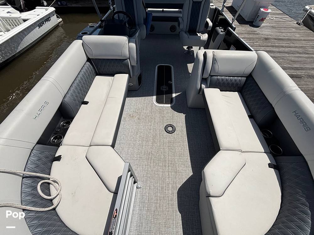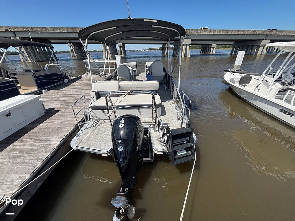 2025 Harris Sunliner 230 model with all the bells and whistles for sale, powered by a Mercury 150 HP 4-stroke engine. This boat boasts over 25ft total deck space.