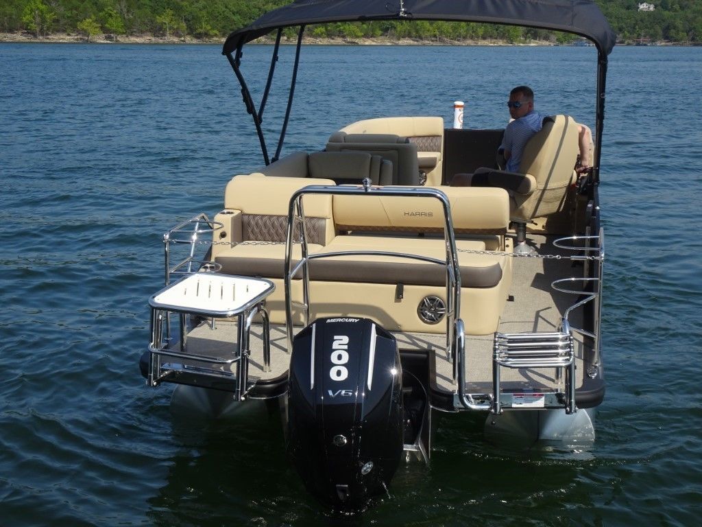 This is a new 2025 Harris Sunliner 230 SL Tri-toon in Matte Black and Beach Tan Interior. It is powered by a Mercury 200hp Verado 4-Stroke DTS/PAS and has the following options: