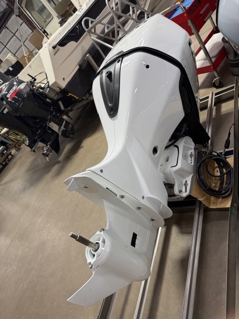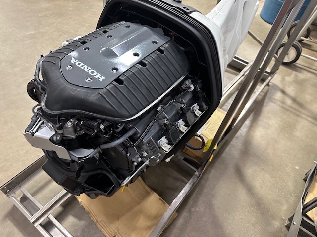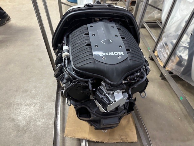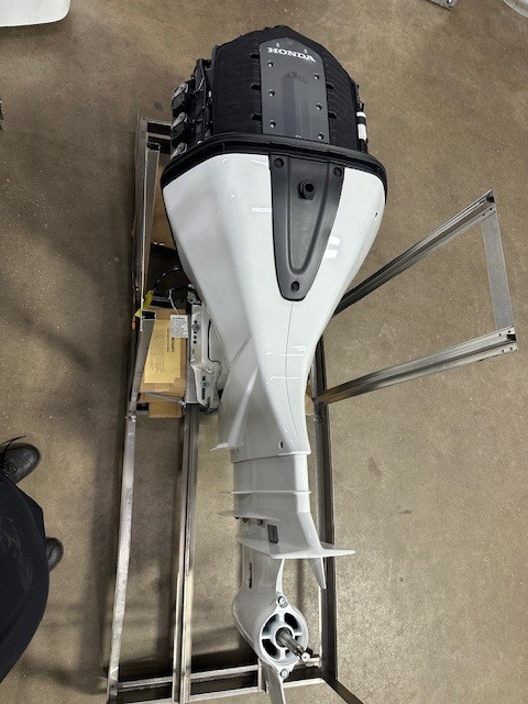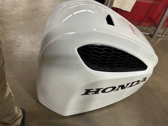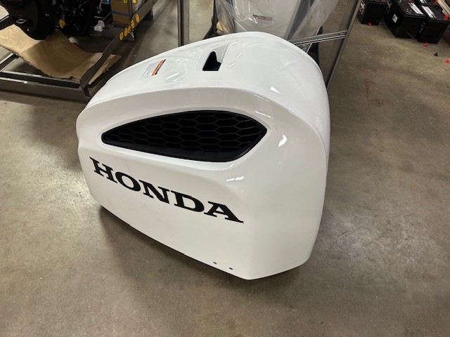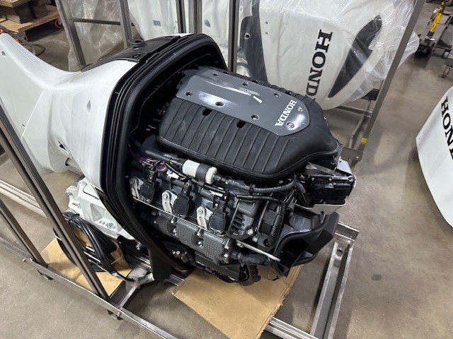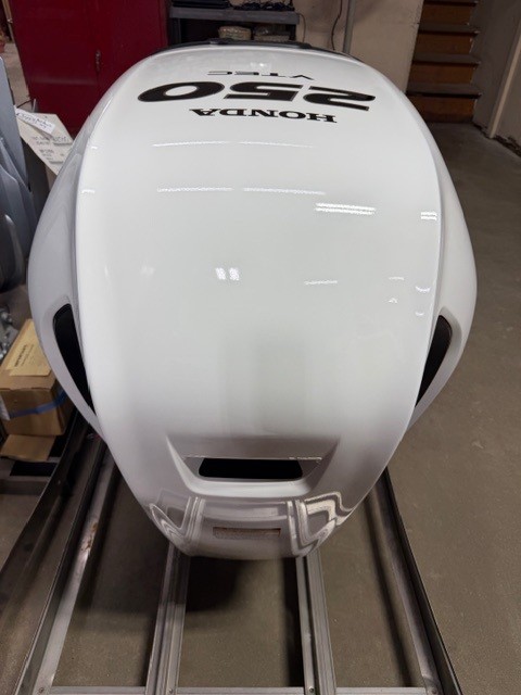 Honda 250 HP EFI outboard motor. 25" XL (Extra Long Shaft). White Exterior Digital IST Model is discounted for Open Crate with minor cosmetic defects. 2025 Program Year with earlier manufacture date includes Honda’s industry-leading “True-5” five-year, non-declining warranty. Prop, Cables, Controls, Gauges, and Install are available for an additional charge.