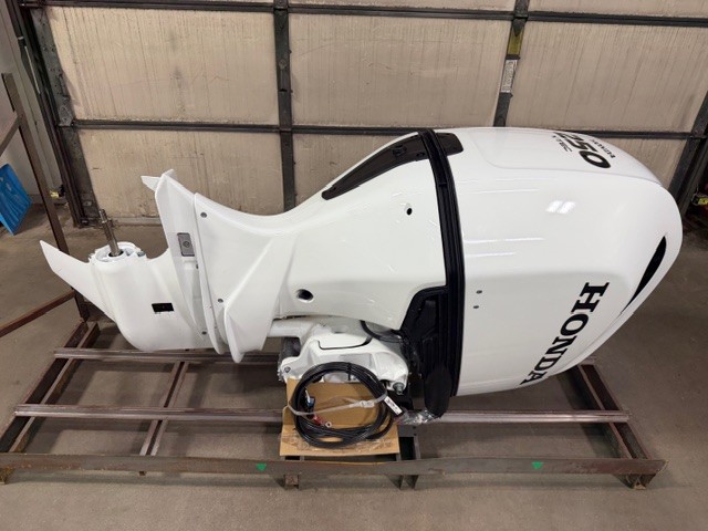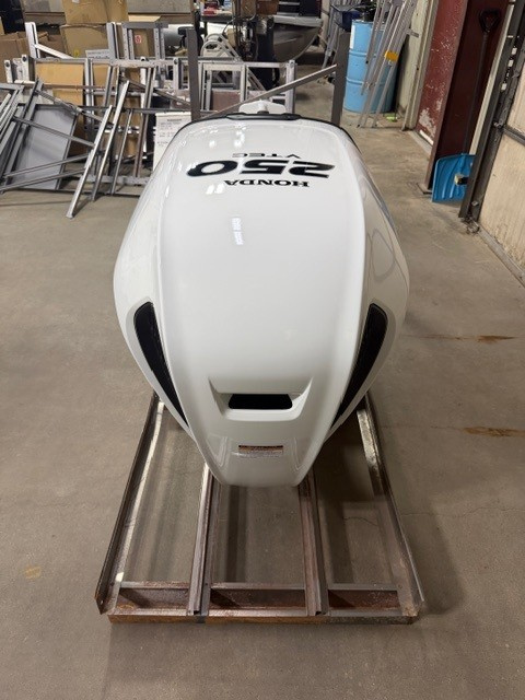 Honda 250 HP EFI outboard motor. 25" XL (Extra Long Shaft). White Exterior Model is discounted for Open Crate with minor cosmetic defects. 2025 Program Year with earlier manufacture date includes Honda’s industry-leading “True-5” five-year, non-declining warranty. Prop, Cables, Controls, Gauges, and Install are available for an additional charge.