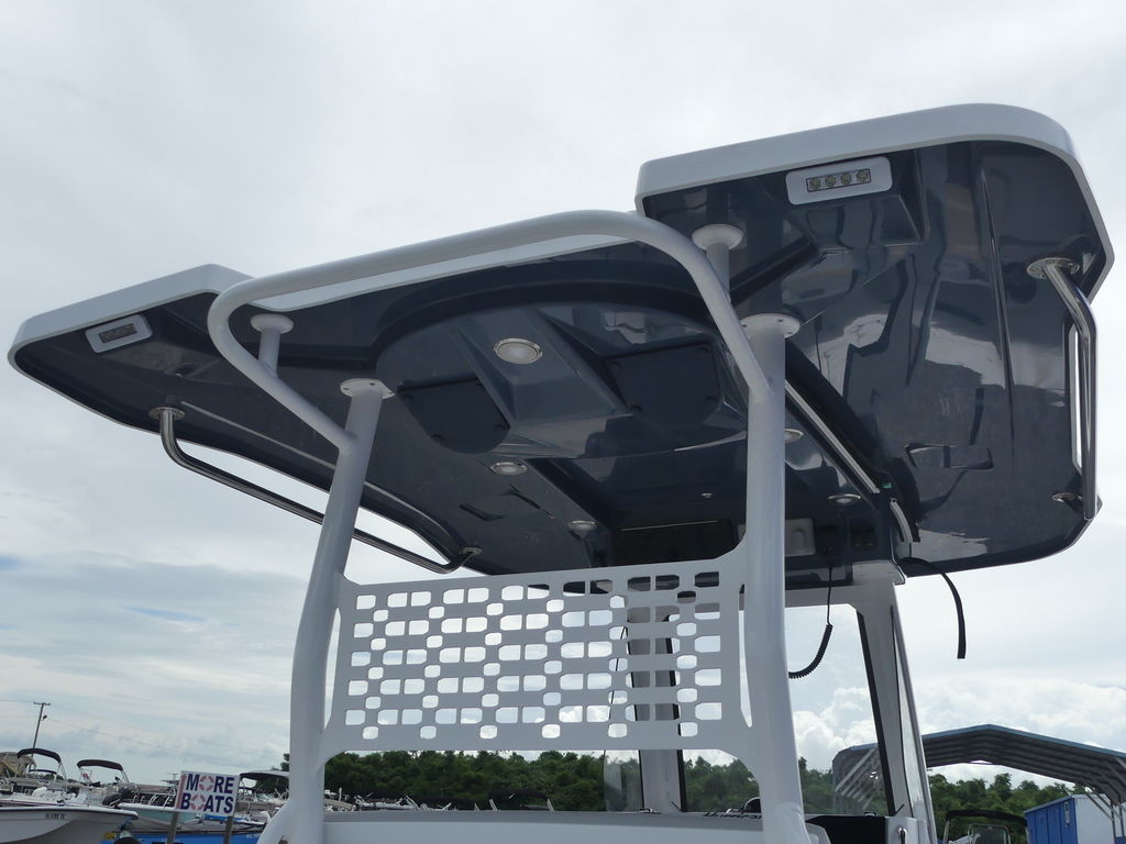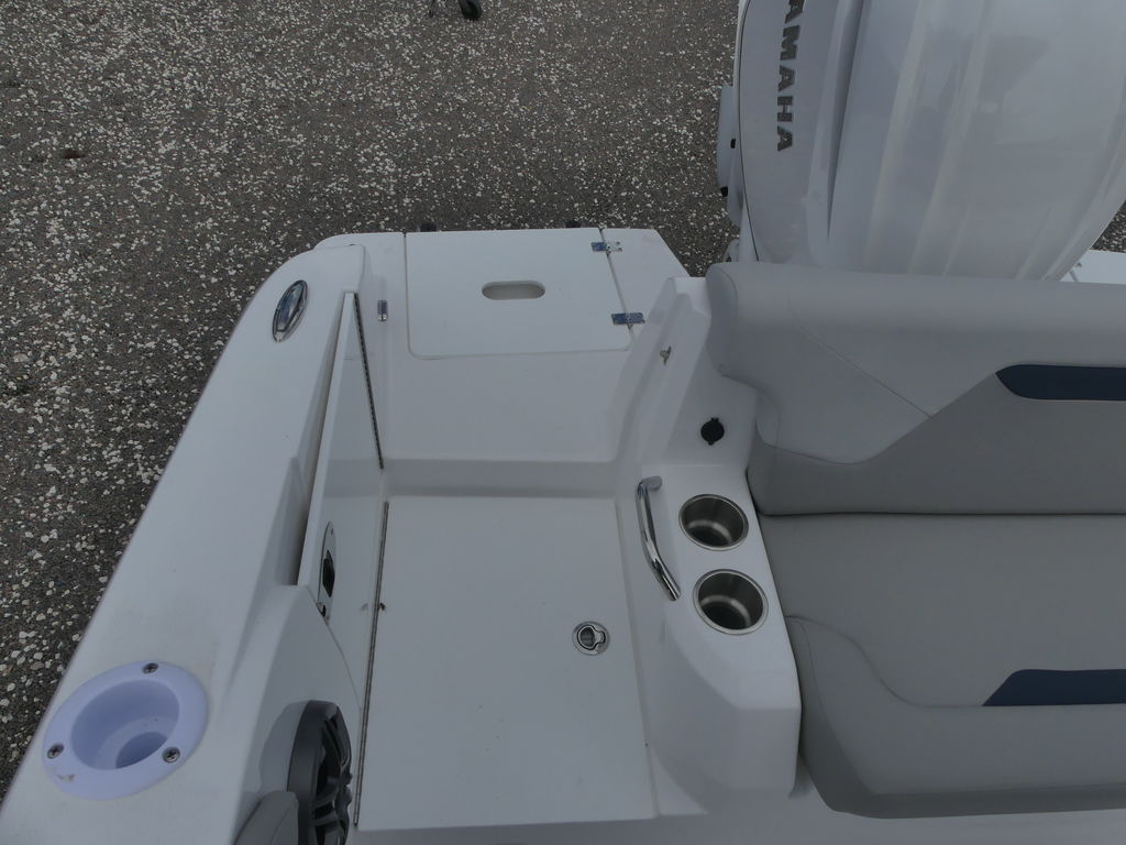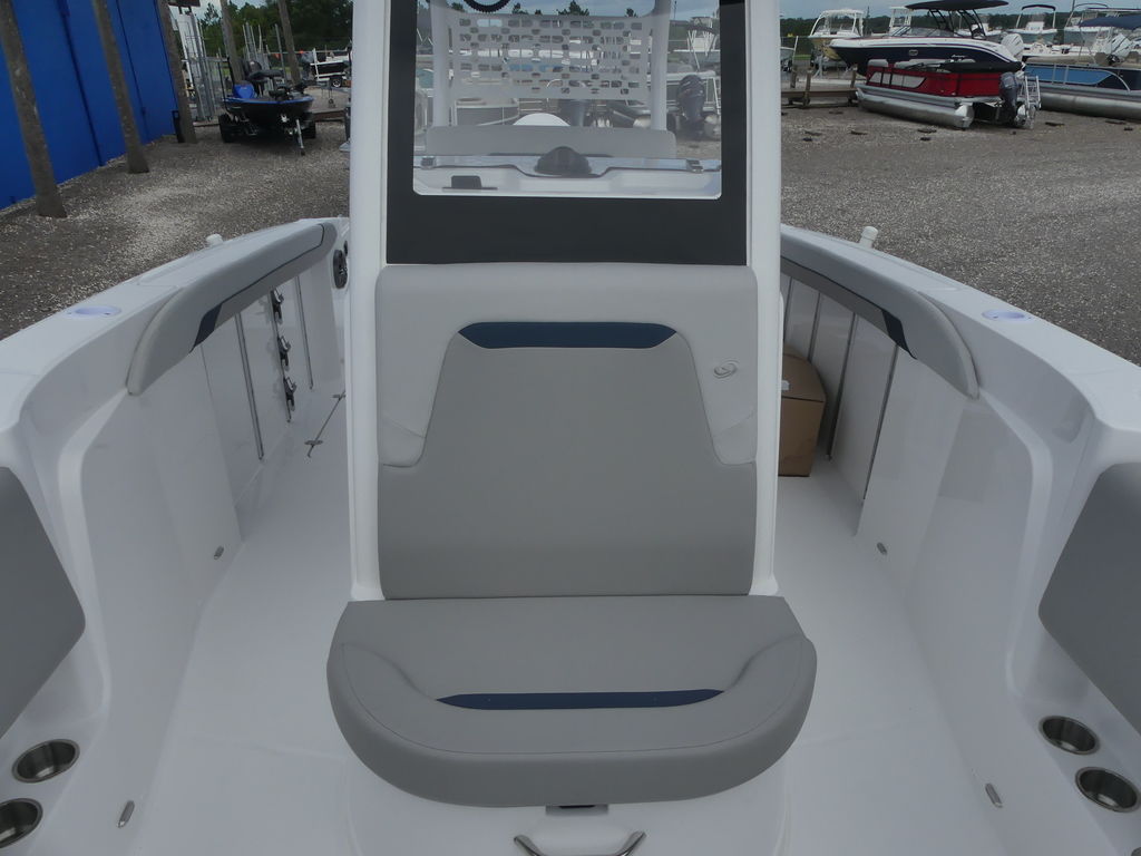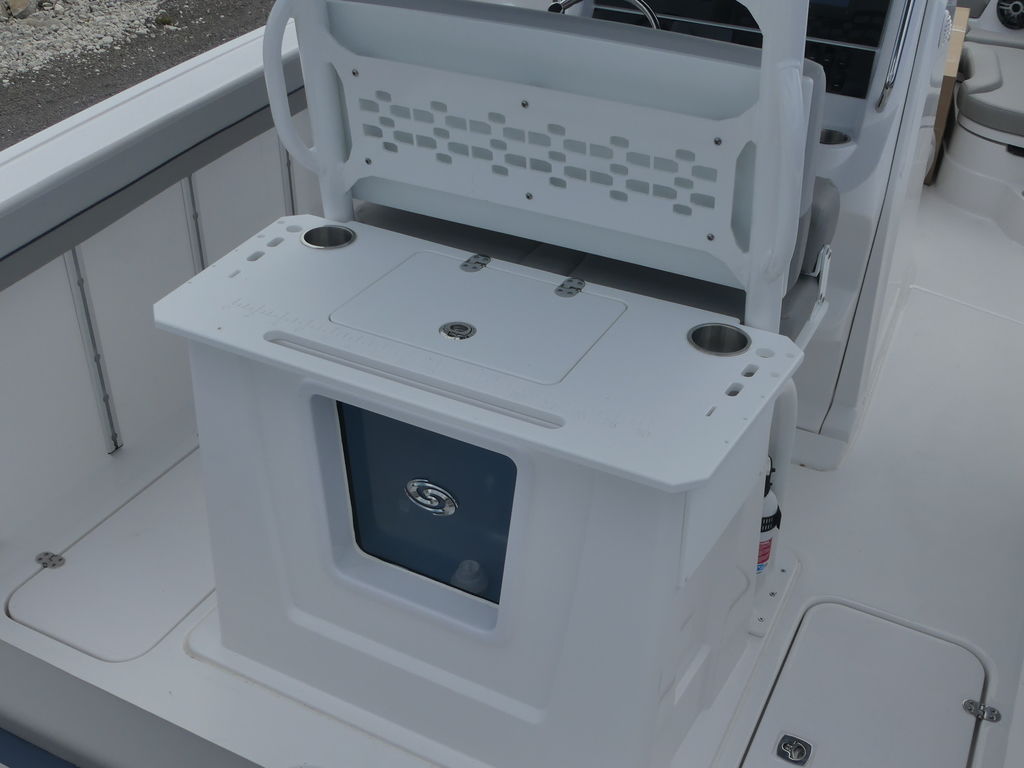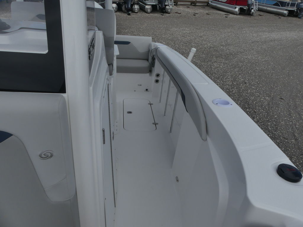 The spacious deck layout provides easy access around the console, abundant seating, and plenty of room for gear and coolers. Anglers will appreciate the thoughtful fishing features, including rod storage, livewell options, and ample casting space, while families and guests will enjoy comfortable seating and an open, inviting cockpit. The center console design keeps the helm area functional and efficient, with room for modern electronics and navigation systems to make every trip easier and more enjoyable.
