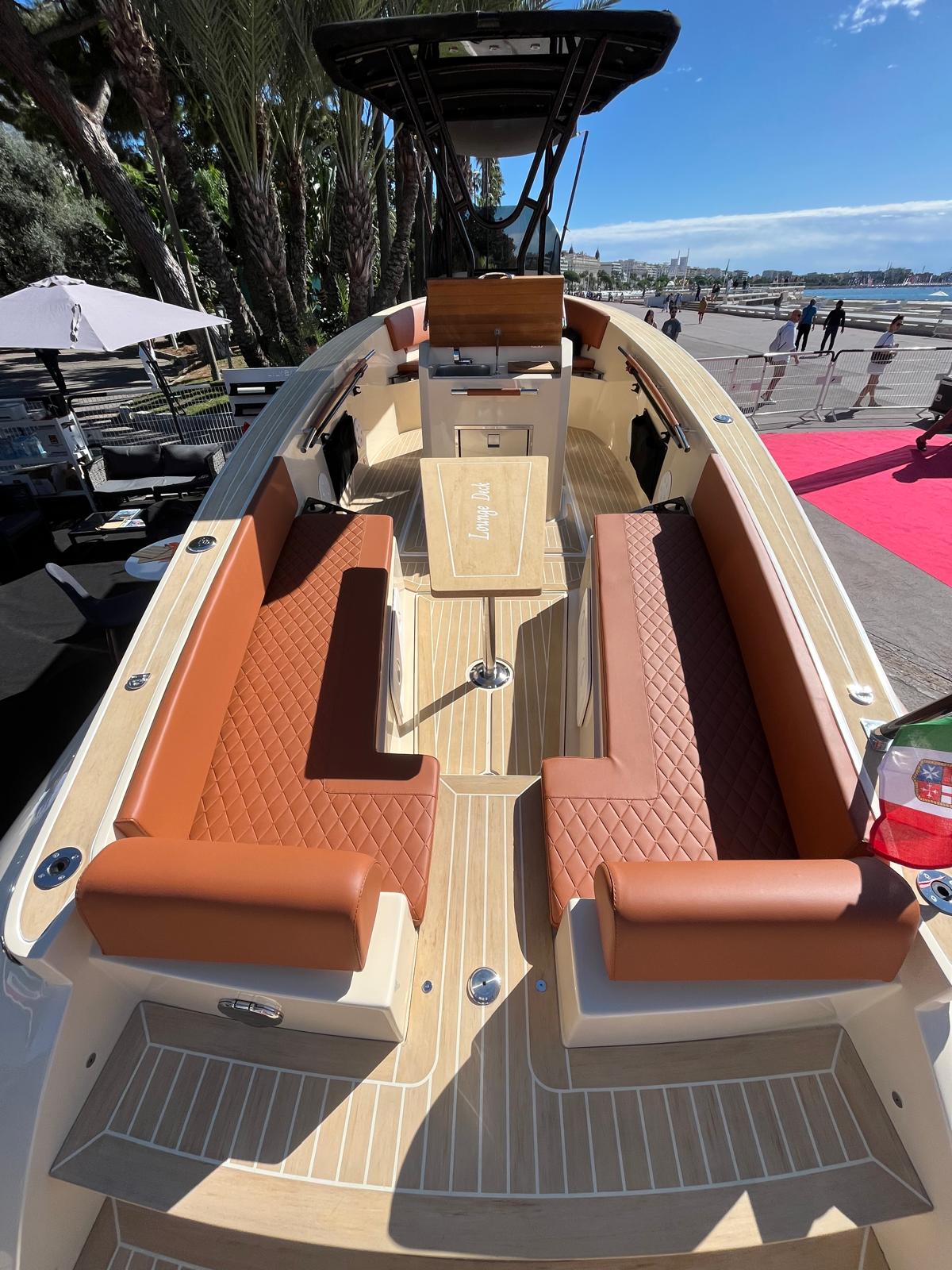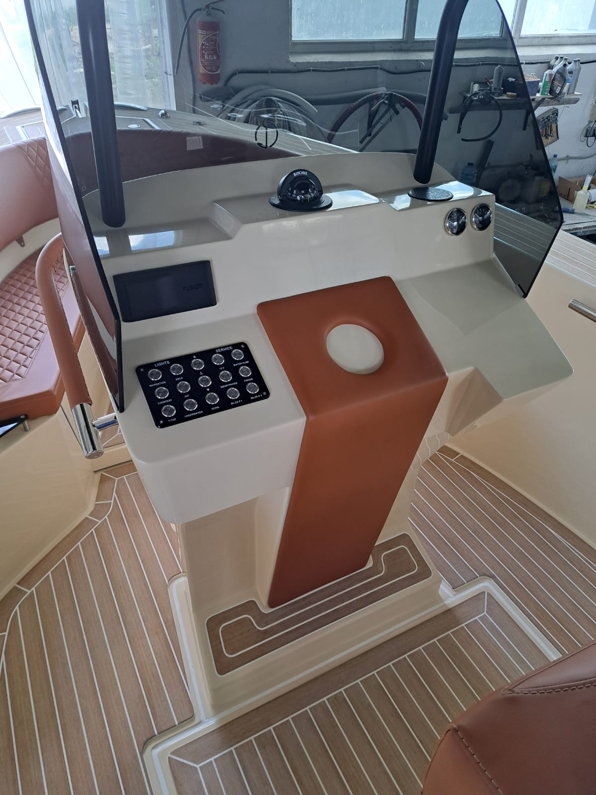 This luxury day boat has a deep v-hull that provides optimal stability and maneuverability, even on rough waters it feels very comfortable to sail. The design is compact and stylish, with great attention to detail. This is the ultimate boat for a day of sailing fun, where the also equipment can be called very complete. For example, the boat is equipped as standard with high-quality upholstery, flexiteak, recessed aluminum frogs, electric windlass, leather-finished stainless steel handles, a "wet bar", hydraulic steering, stern shower and very much storage space.