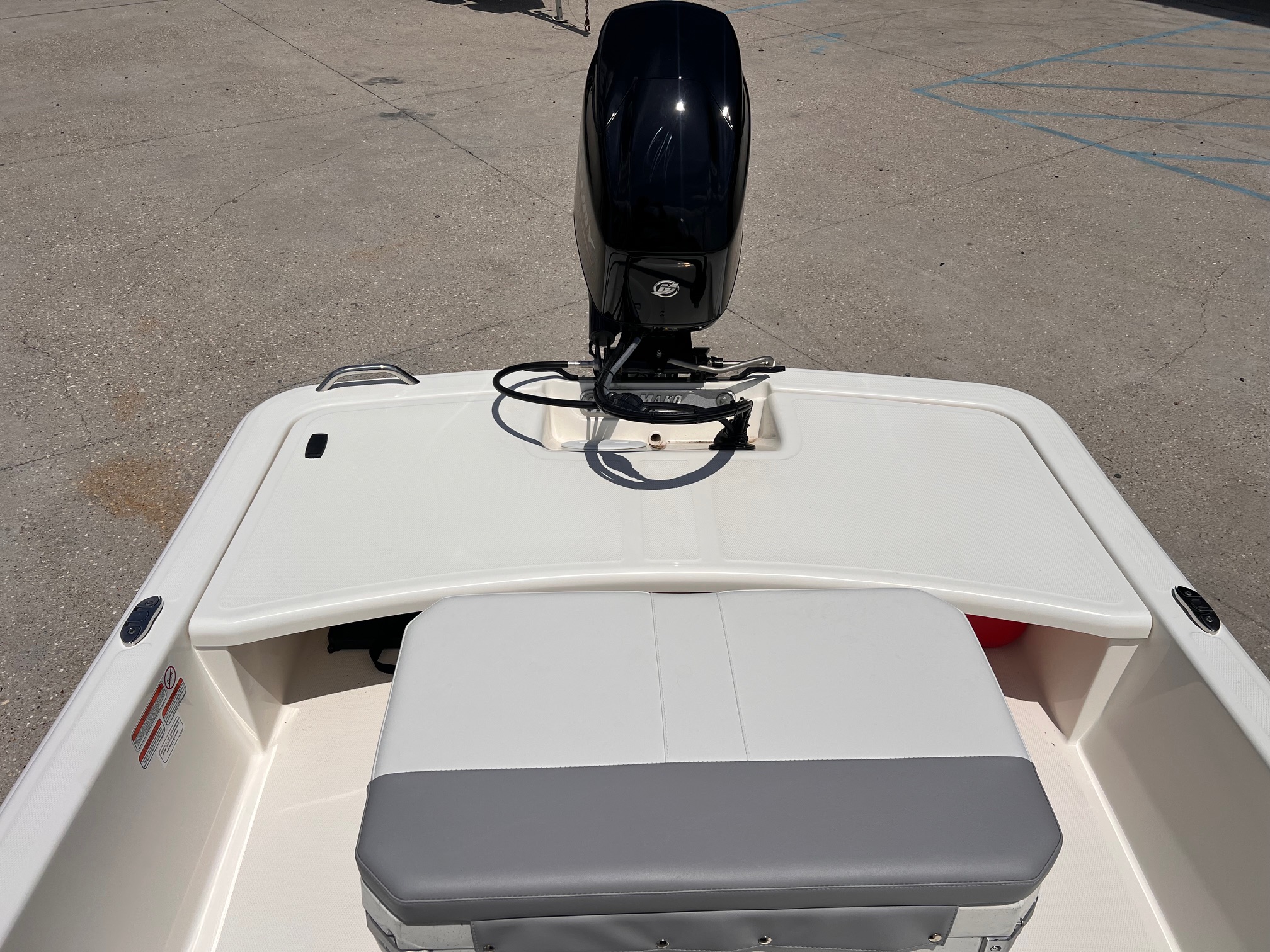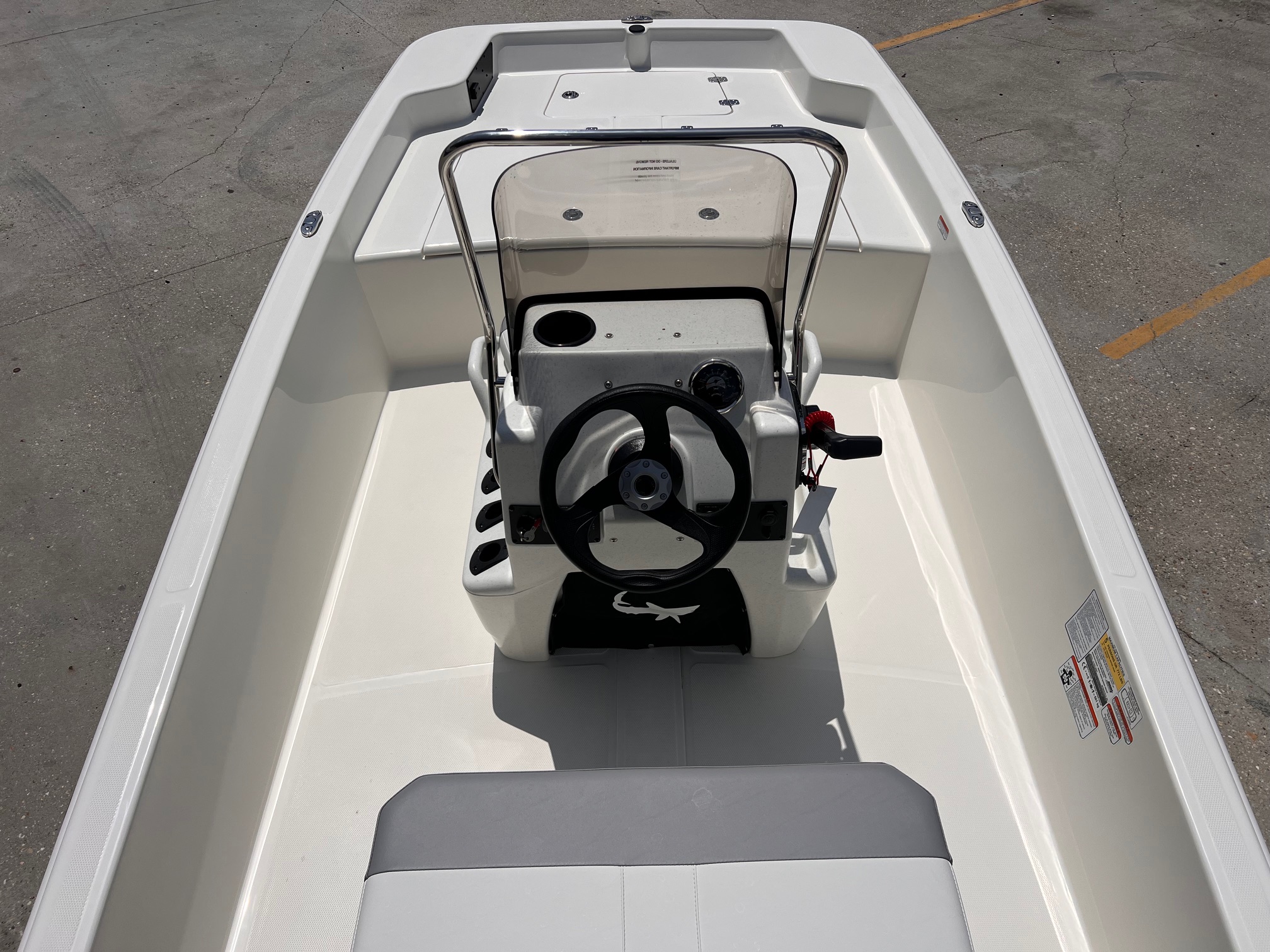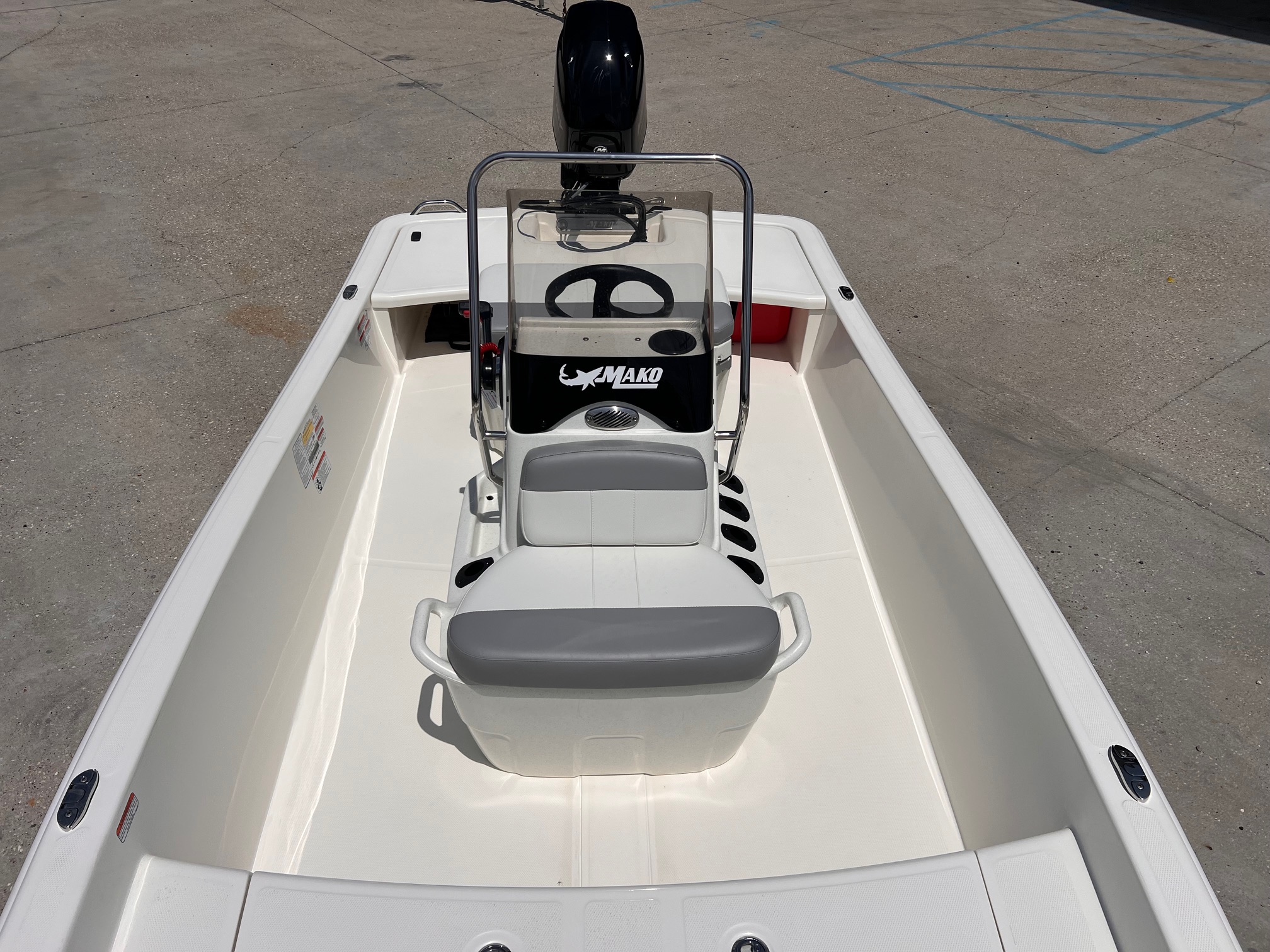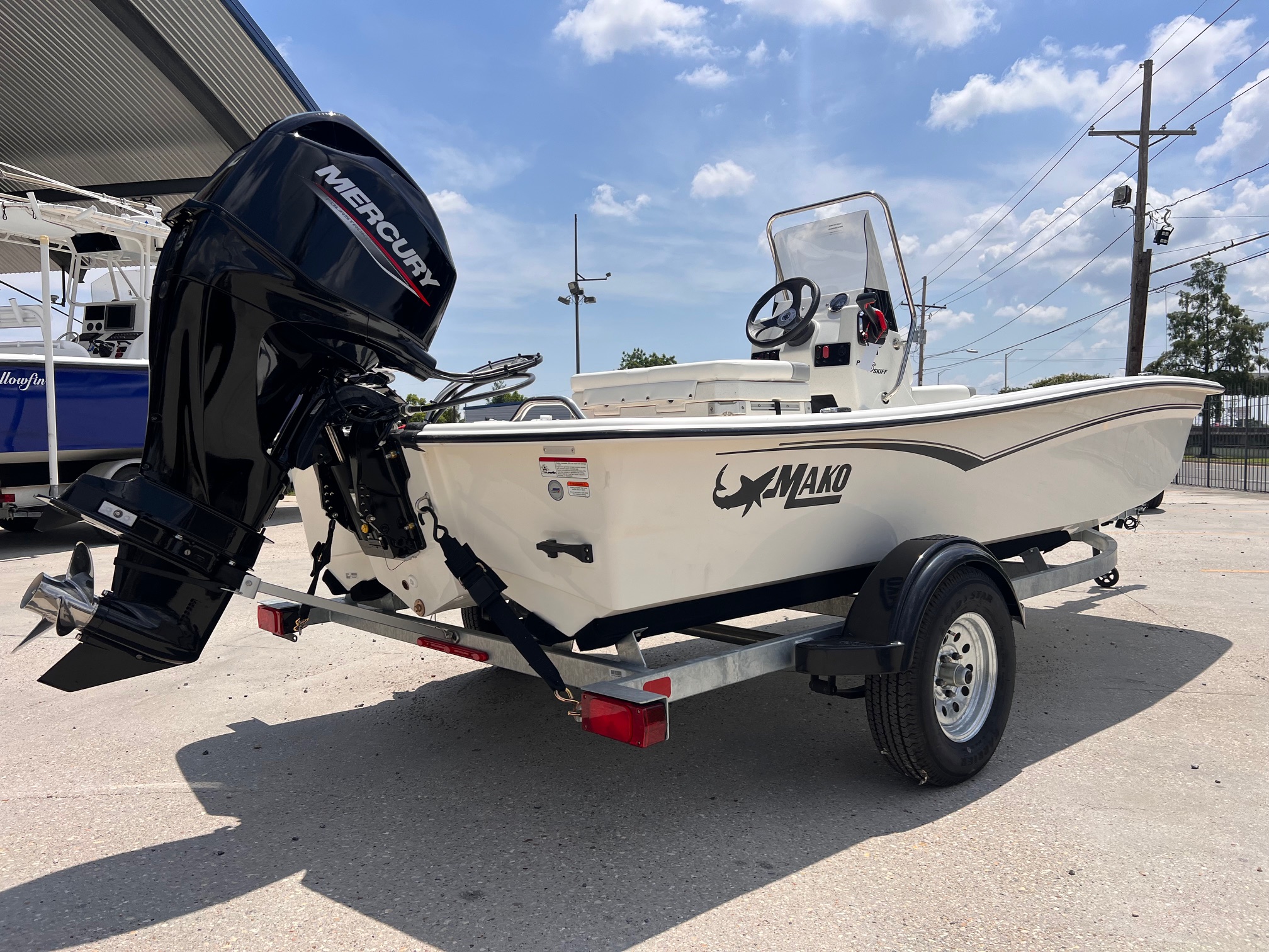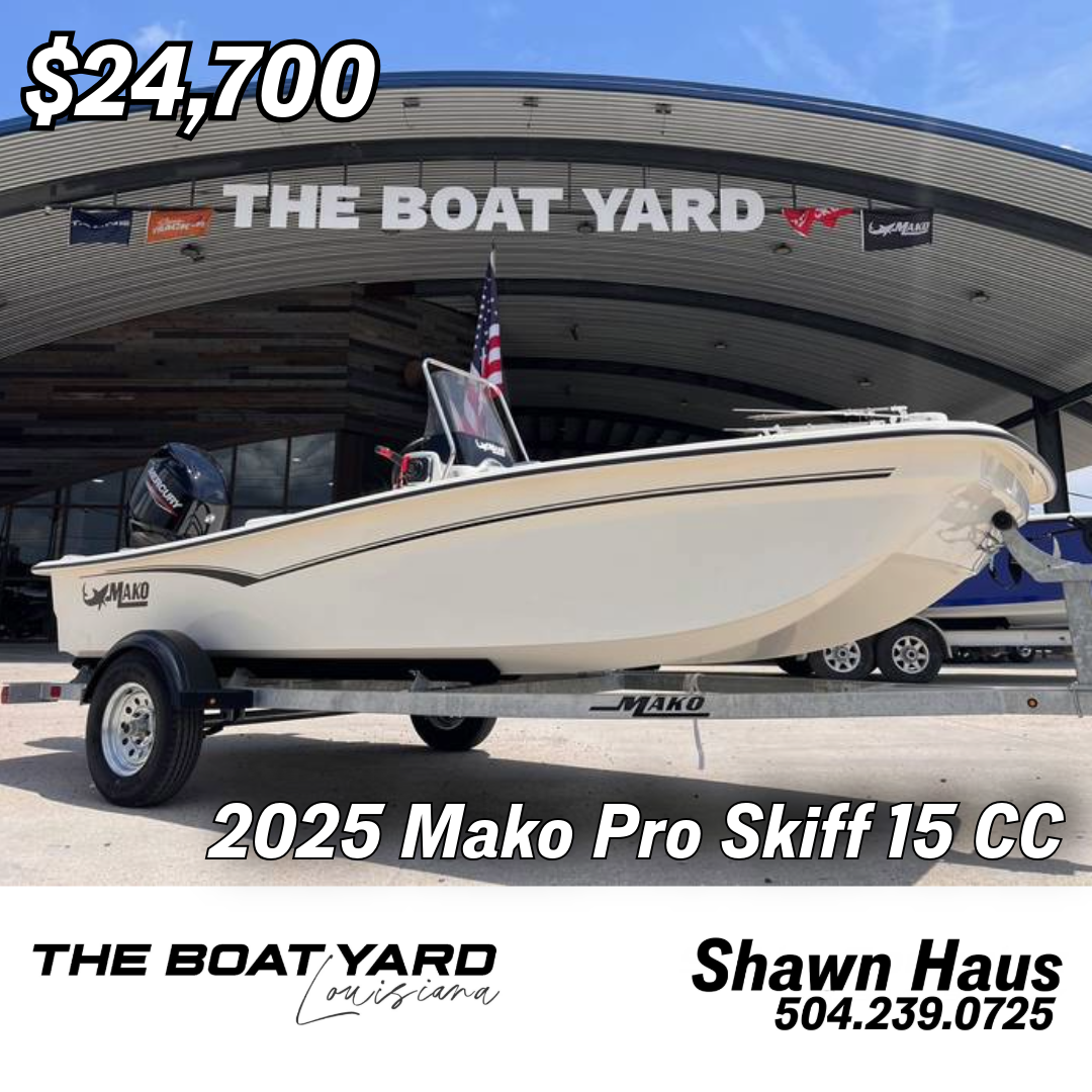 The 2025 Mako Pro Skiff 15 CC is a 15' 2" center console boat with a beam of 6' 5.5" and a draft of 8". It can handle a maximum of 60 horsepower and has a fuel capacity of 6.6 gallons. The boat can carry up to 5 people with a maximum combined weight of 1300 lbs (including motor and gear).