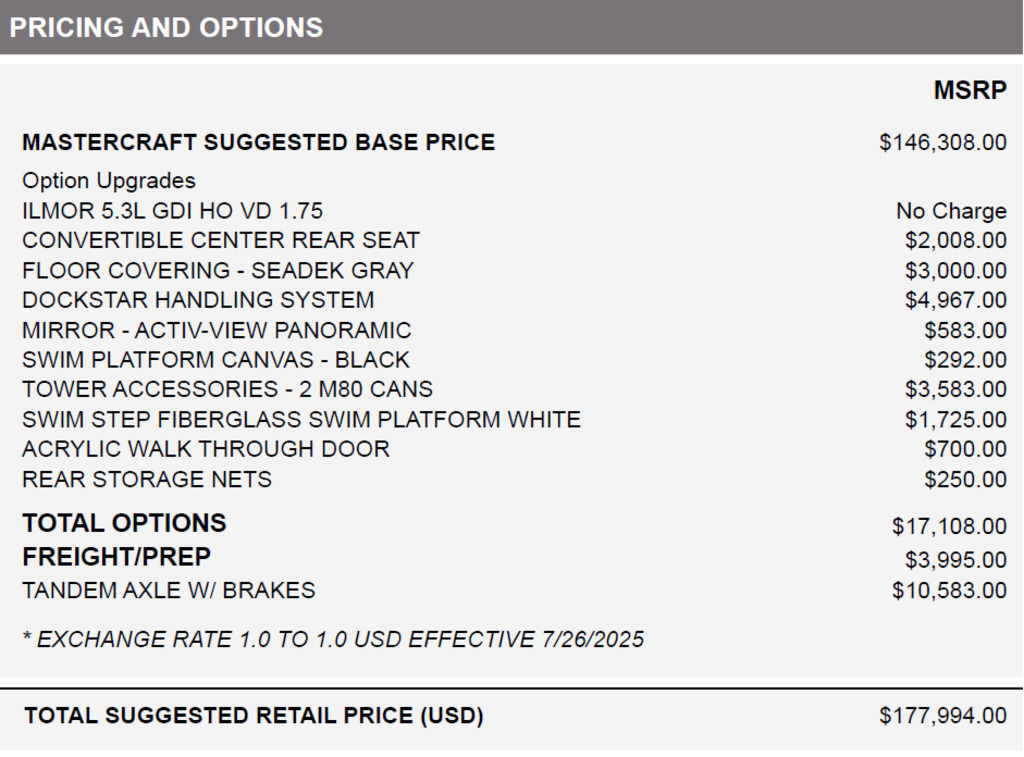 SeaDek Floor Covering-Cockpit, Activ-View Panoramic Ski Mirror, Fiberglass Swim Platform w/Flip-Down Swim Step, Swim Platform Canvas, (2) M80 Tower Speakers, Acrylic Walk Through Door, Convertible Rear Seat, Rear Storage Nets, Dock Star Handling System and Tandem Trailer w/Disc Brakes.