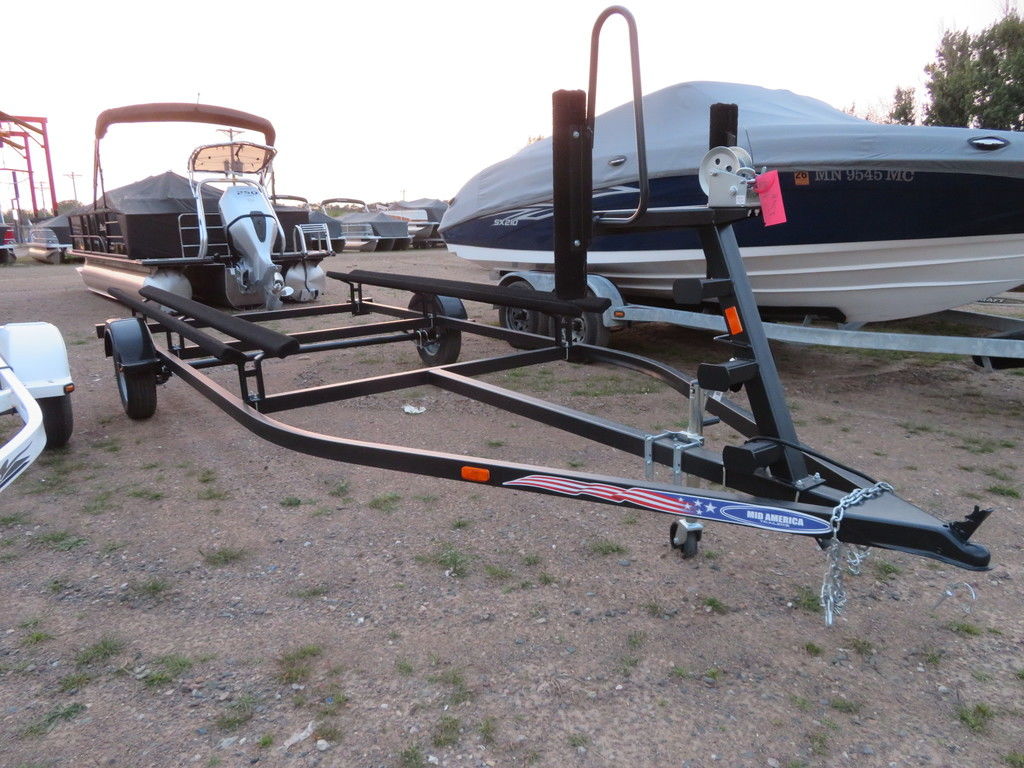 2025 Mid-America PT16LT Pontoon Bunk Single Axle Trailer. This 16' Adjustable Pontoon Trailer Has A 1200 LB Double Wheel Tongue Jack, LED Lights All The Way Around The Trailer, Front Boarding Ladder, Safety Chains, 3500 LB Axle With EZ Lube Hubs, 13" Tires. $2899