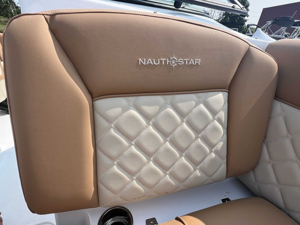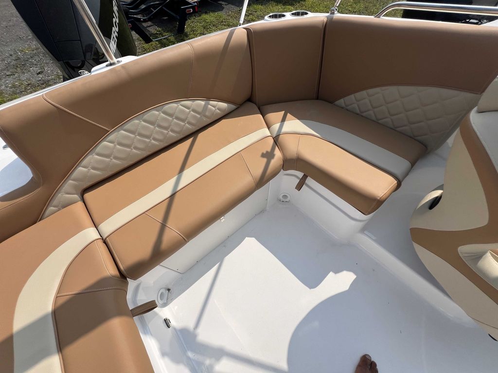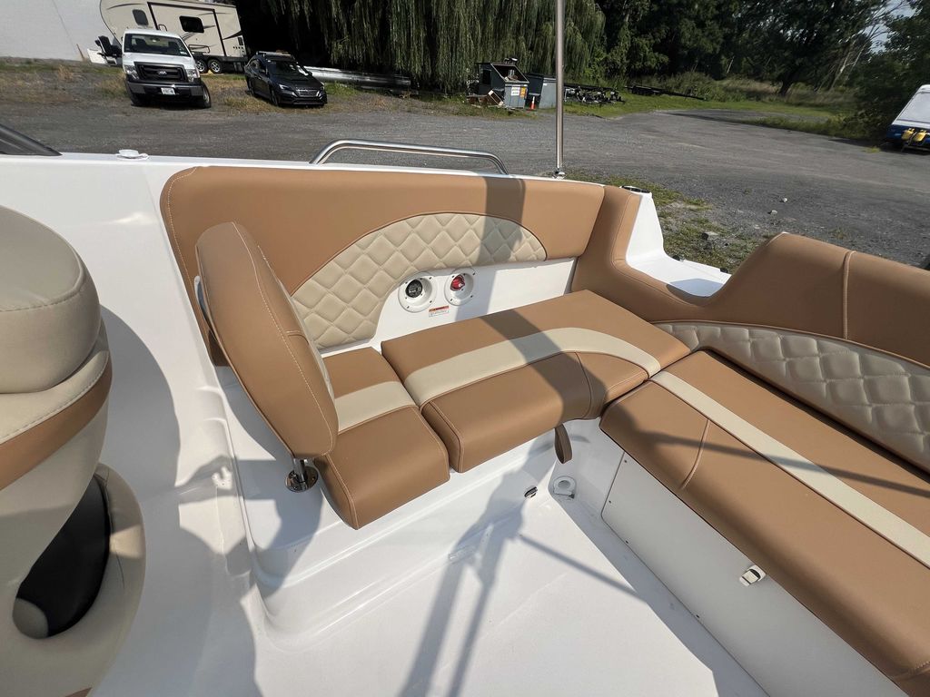 Its rugged Deep-Vee hull and U-shaped wraparound cockpit ensure a comfortable ride for everyone. A panoramic walk-through windshield, enclosed dressing room, leather touch upholstery and Fusion® stereo system are just a few of its creature comforts. A Seadek transom landing and forward and aft boarding ladders extend the fun beyond the boat. Take it up a notch with the optional fishing package, which includes a live bait well and fishing seat. Now we are talking.