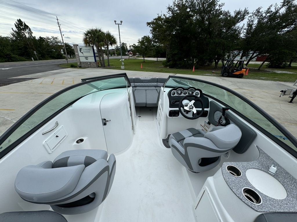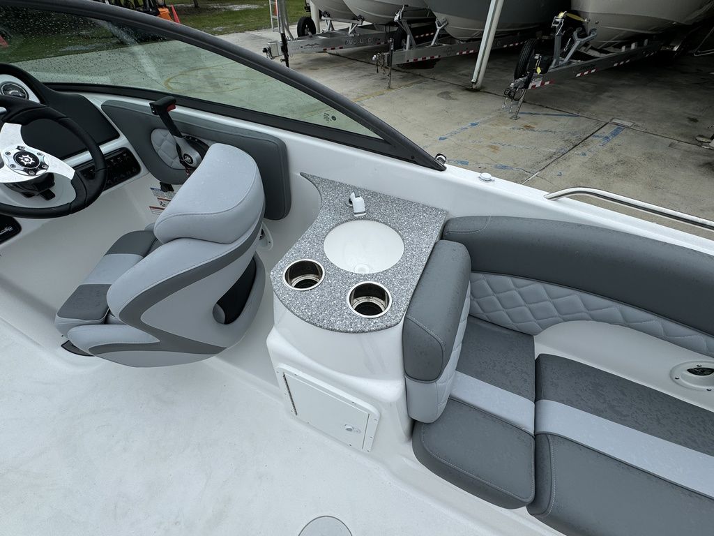 The 243 DC is the perfect combination of size and functionality. It offers an enclosed, step-down dressing room with optional portable head; wraparound seating in the cockpit; and a pressurized water system that services the galley with an optional transom shower. Plush seating bolsters the cockpit and bow with a transitional sun pad and easy-locking storage. Two bucket seats at the helm make way to the panoramic walkthrough windshield. Bow and transom landings offer access to the water for swimming and diving.