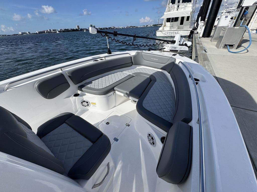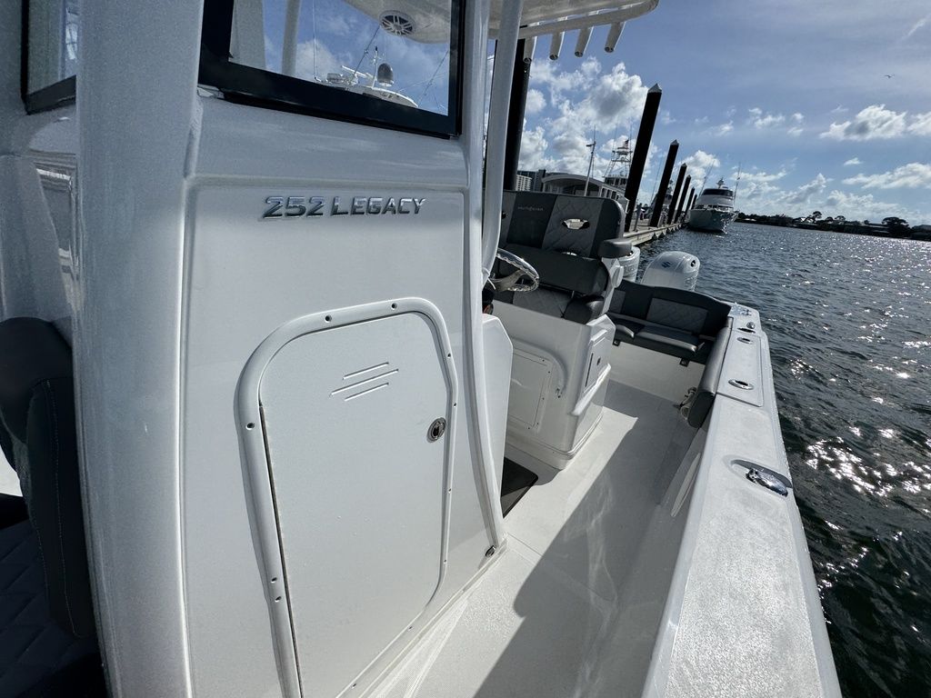 There is nothing you can’t accomplish in a 252 Legacy. Its deluxe leaning post includes a built-in 21-gallon bait well and prep station for pro-style fishability. It also holds tackle storage drawers and a freshwater wash down. Captain’s seating comes with flip-up bolsters, an armrest and a footrest.
