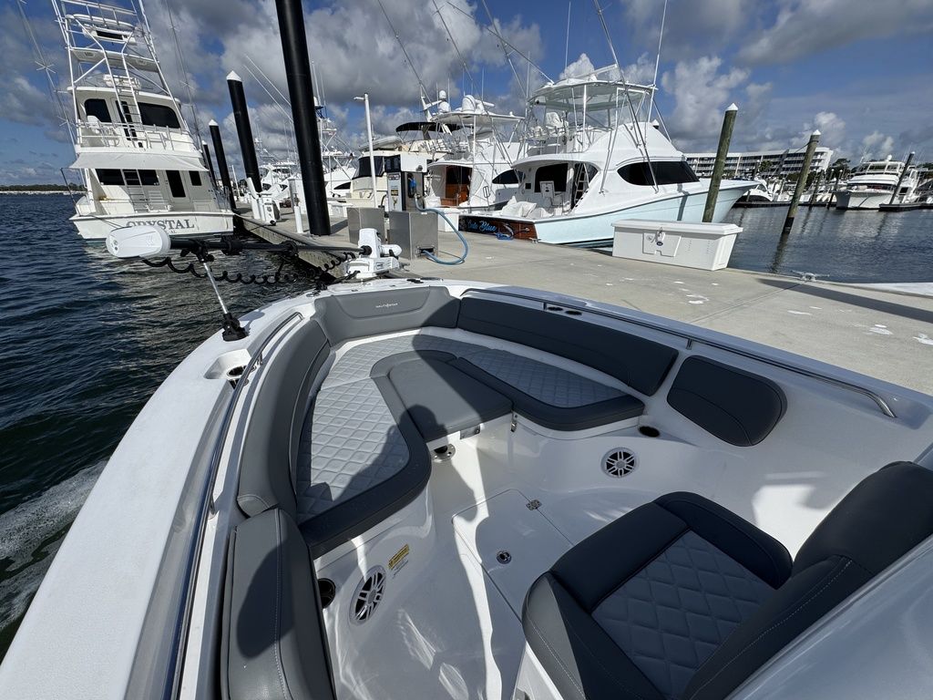 Three-across seating at aft houses an 18-gallon cooler and an oversized insulated 50-gallon fish box. A walkthrough transom door makes way to a swim platform with a retractable ladder.