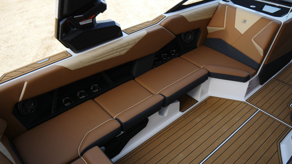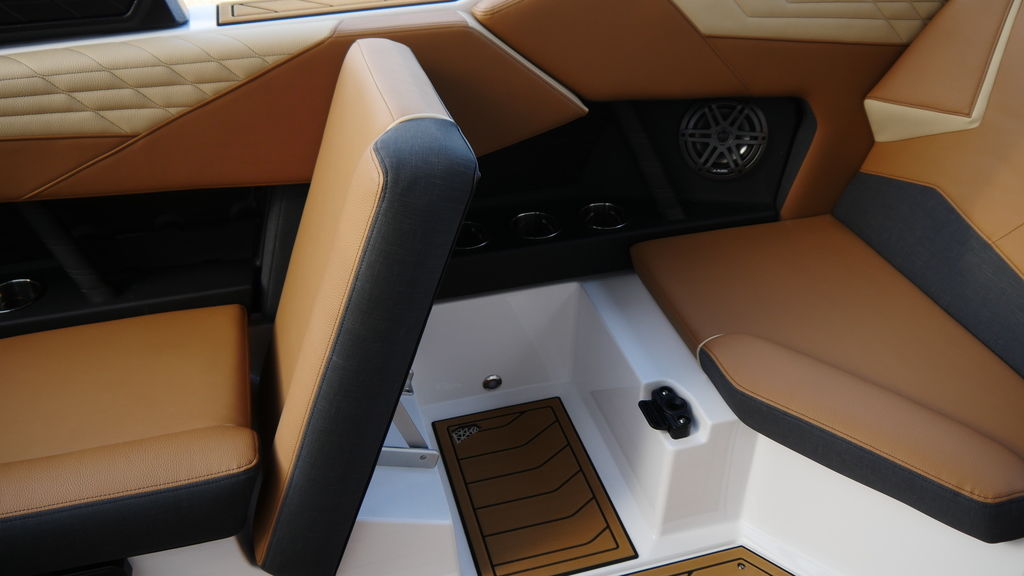 - When the time comes to just relax, take advantage of the rear transom seats aboard the Super Air Nautique S23. Adjacent to the swim platform, these rear-facing seats are angled slightly inward to allow for better engagement, so you can spend time with family and friends while they swim in the water.