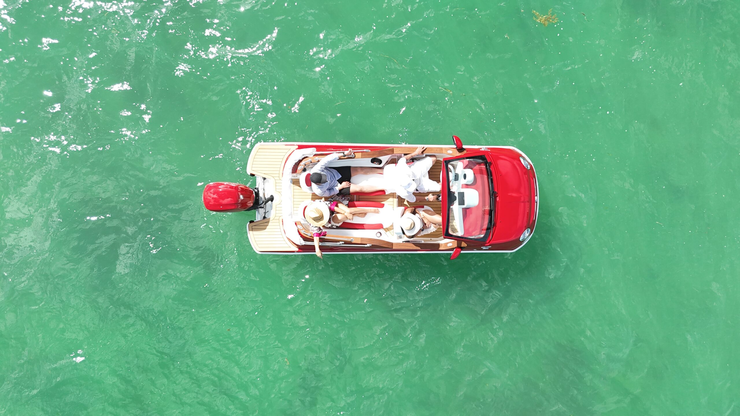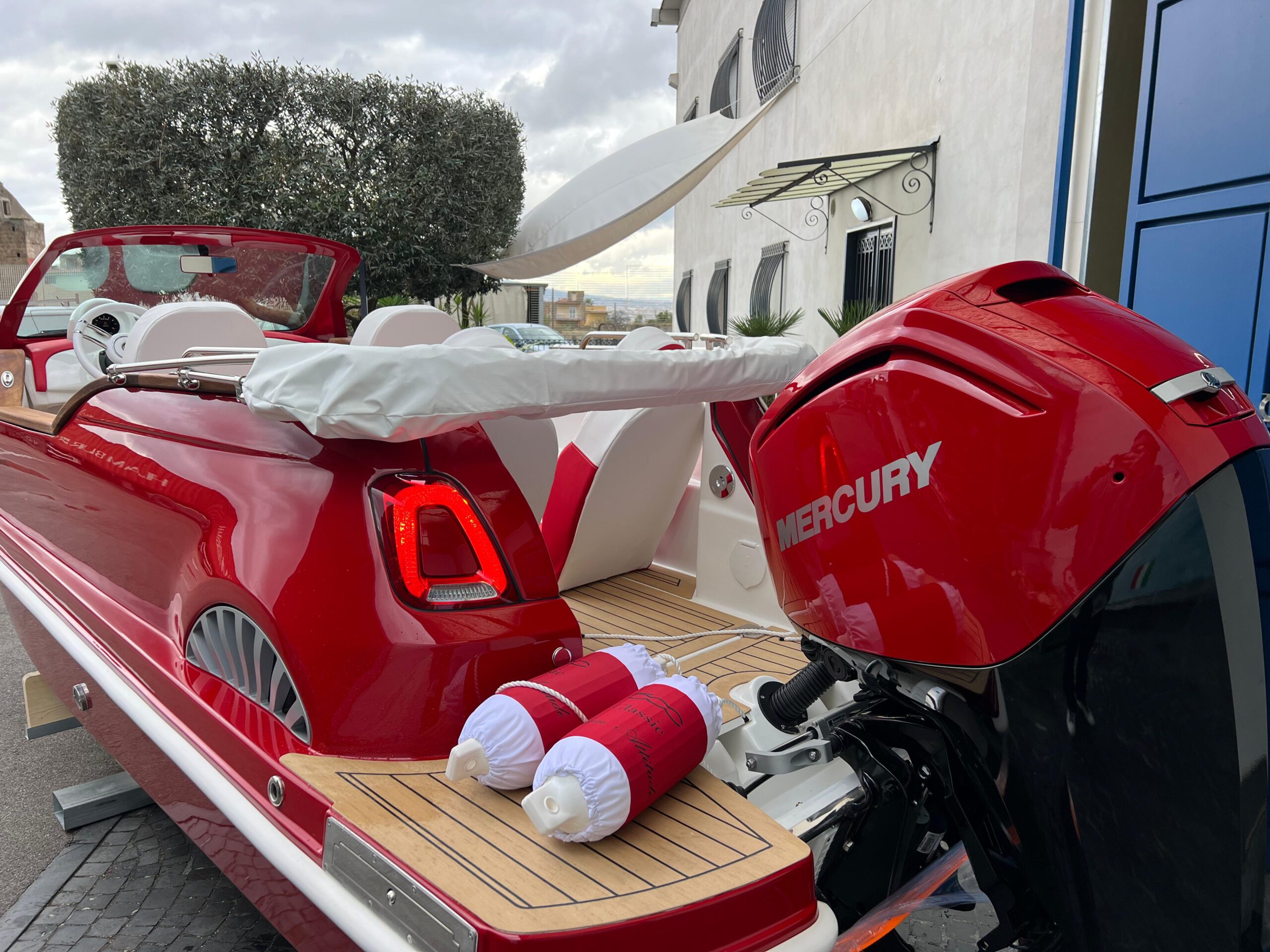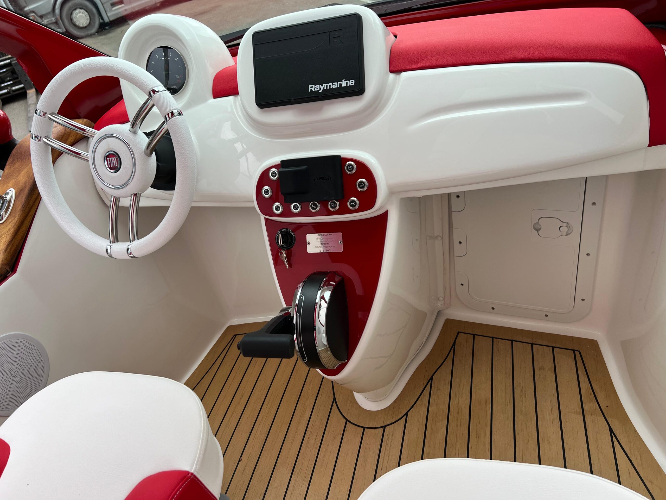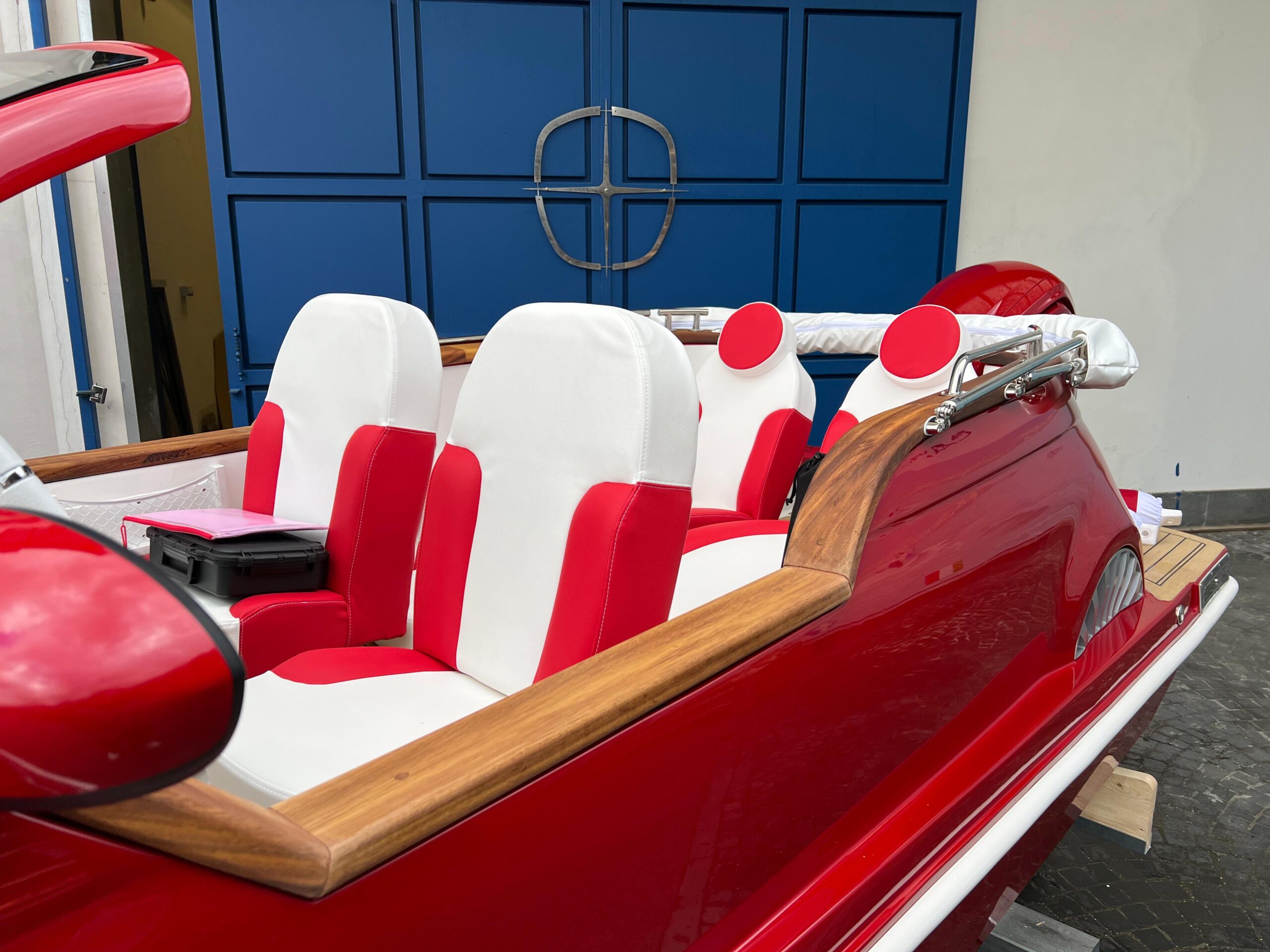 a clean classic style model with features inspired by the Fiat 500 Italian style icon. The project successfully combines luxury, efficiency, style and comfort. The natural curved lines and the absence of straight lines, offer a dynamic movement and a unique character to the design. Thus combining the beauty of boating with the comfort of driving on the road.