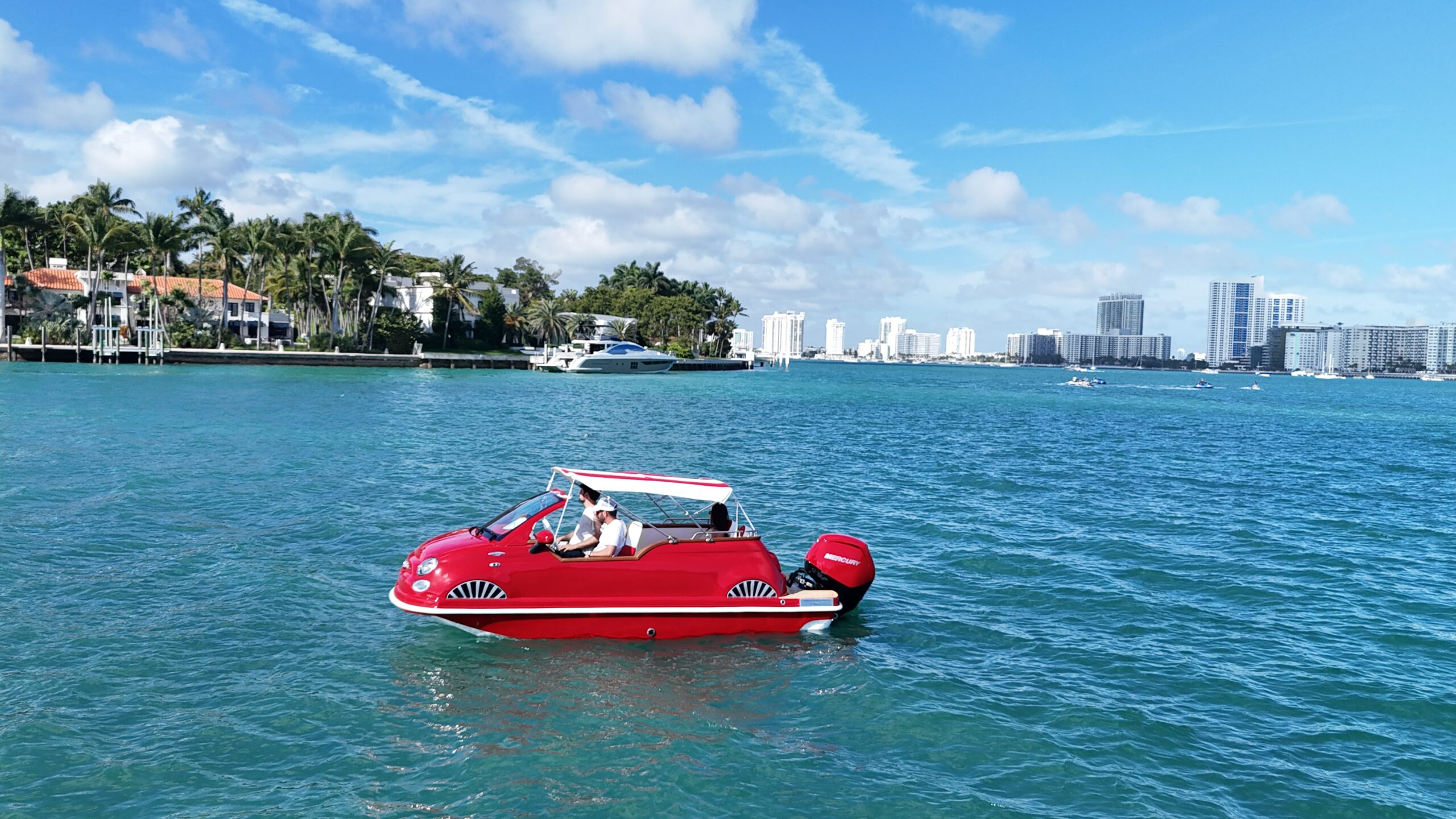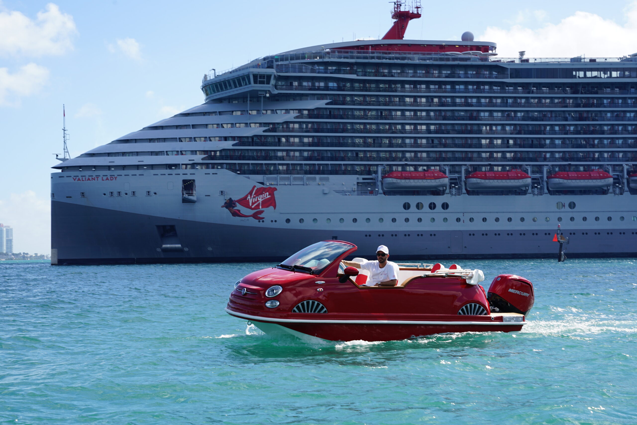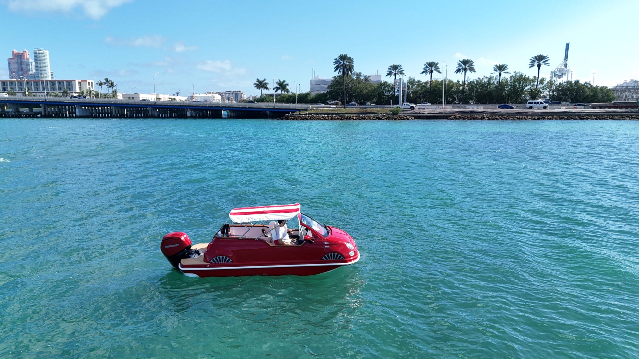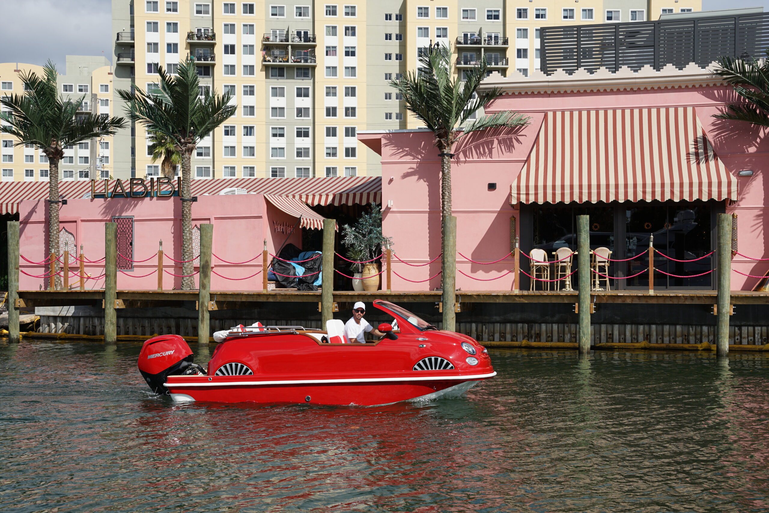 a clean classic style model with features inspired by the Fiat 500 Italian style icon. The project successfully combines luxury, efficiency, style and comfort. The natural curved lines and the absence of straight lines, offer a dynamic movement and a unique character to the design. Thus combining the beauty of boating with the comfort of driving on the road.