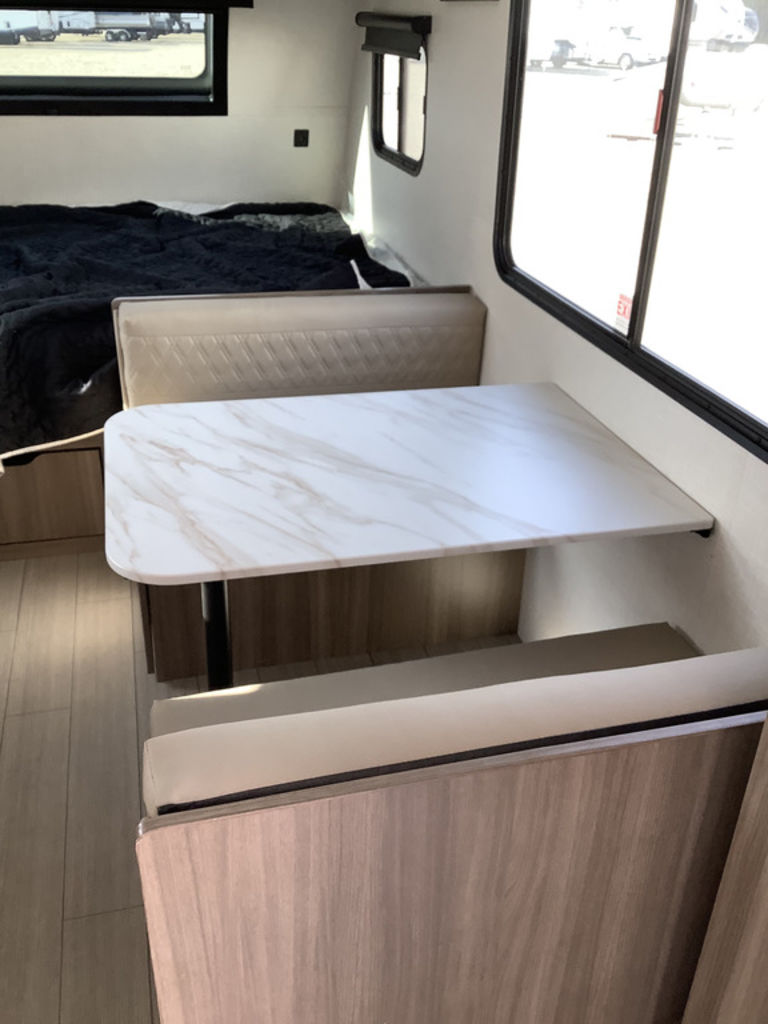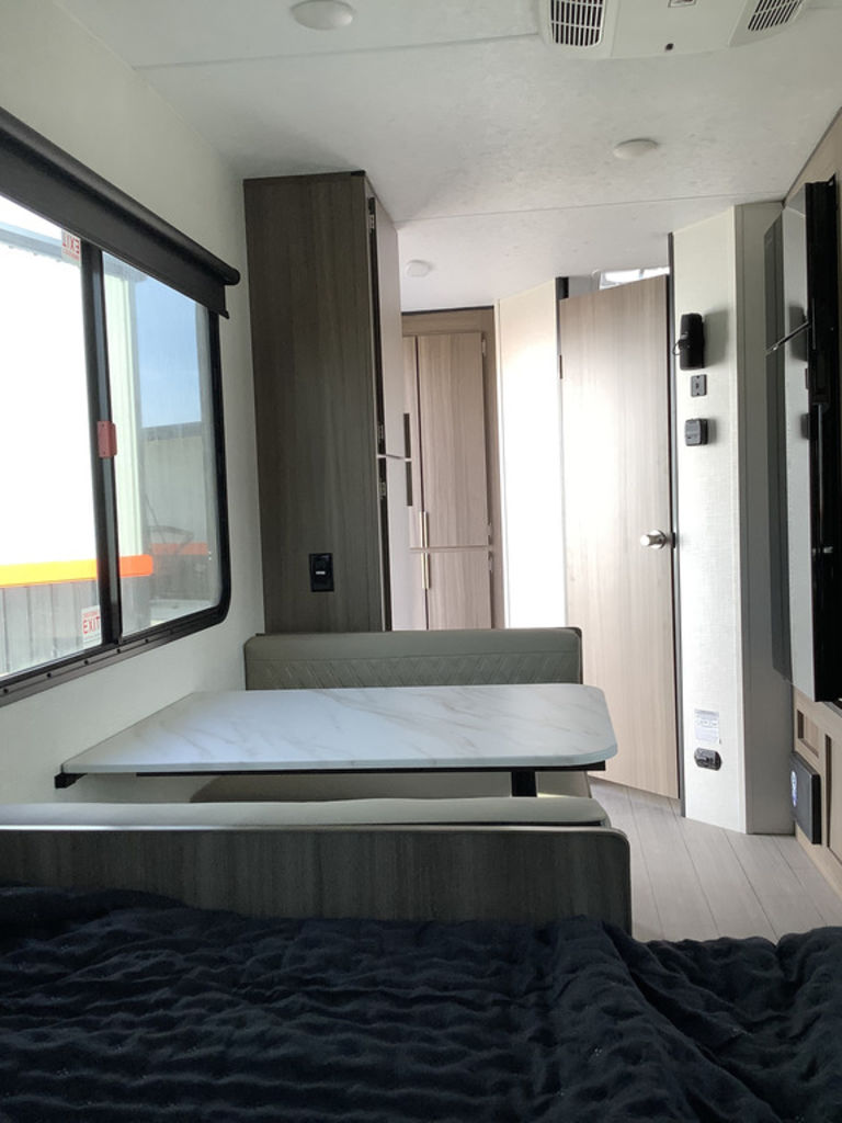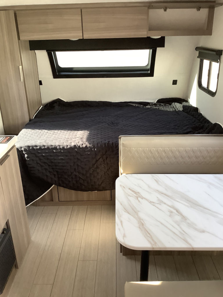 Inside, you will find a bright and functional living space with smart storage, comfortable seating, and a well-designed kitchen layout. The front bed configuration provides a cozy sleeping area while maximizing interior space, making this camper both practical and comfortable for real-world camping.