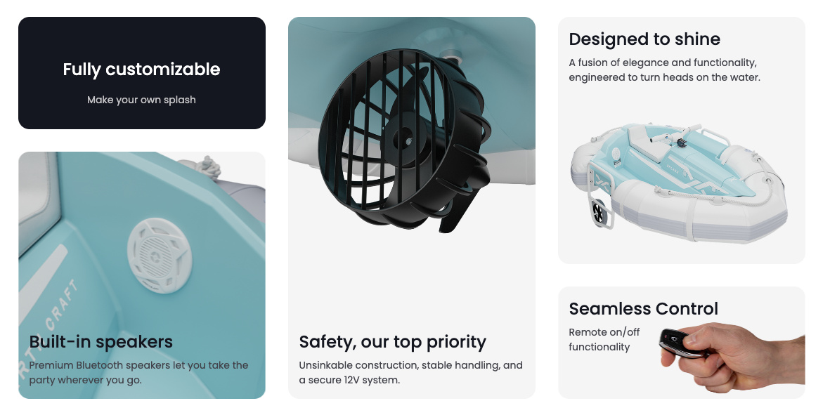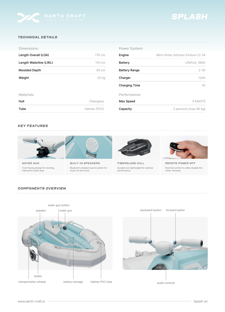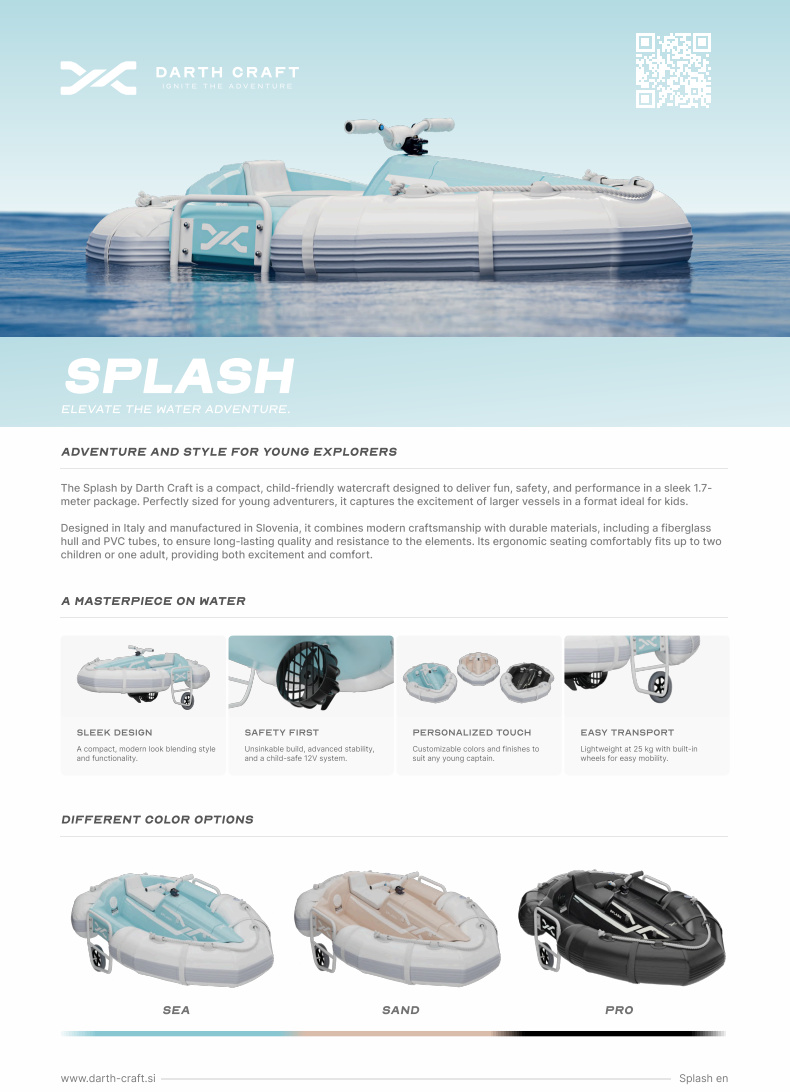 Designed for safety and performance, they provide endless fun!A perfect balance of style, performance, and innovation, the Splash is designed for those who crave thrill and adventure on the water. Featuring a fiberglass hull, white inflatable tubes, and an integrated audio system, it’s the ideal choice for young explorers and water enthusiasts alike.