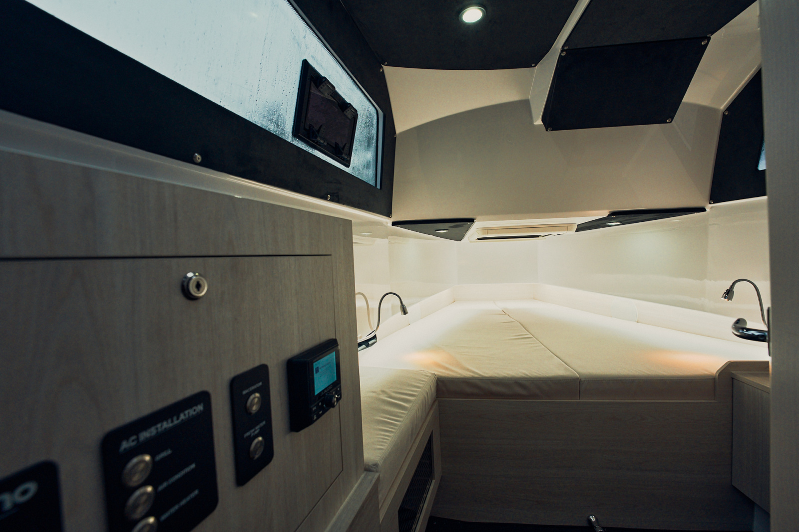 Thoughtfully designed upholstered exterior elements double as comfortable armrests and convenient drink holders. Situated between the helm and the rear bench, the wet bar is generously equipped with dual refrigerators, an electric grill, a sink, and ample food preparation space. Below deck, the surprisingly spacious cabin comes standard with a wide double bed, a wardrobe, lockers, and a private bathroom featuring a toilet, shower, and washbasin.
