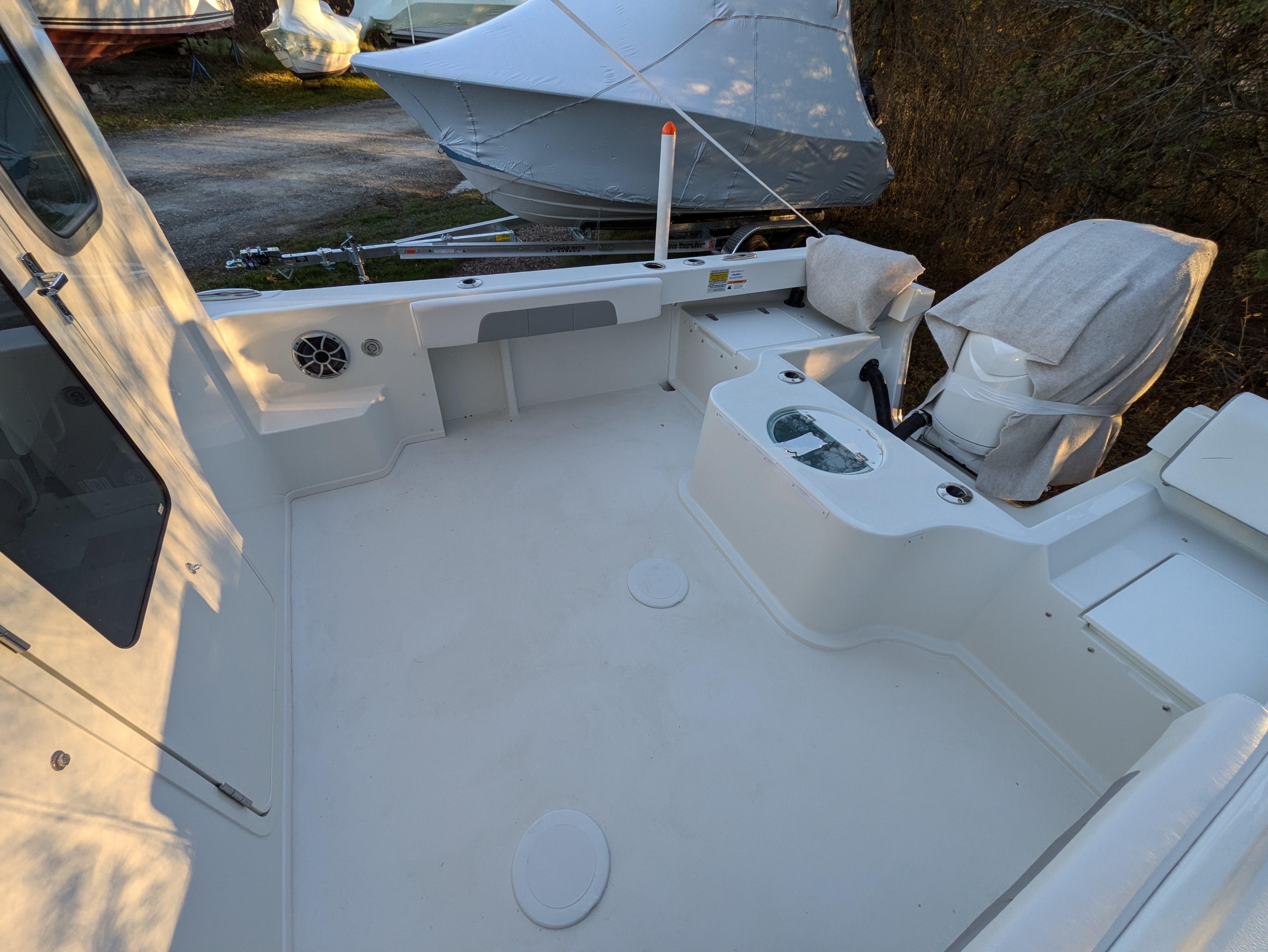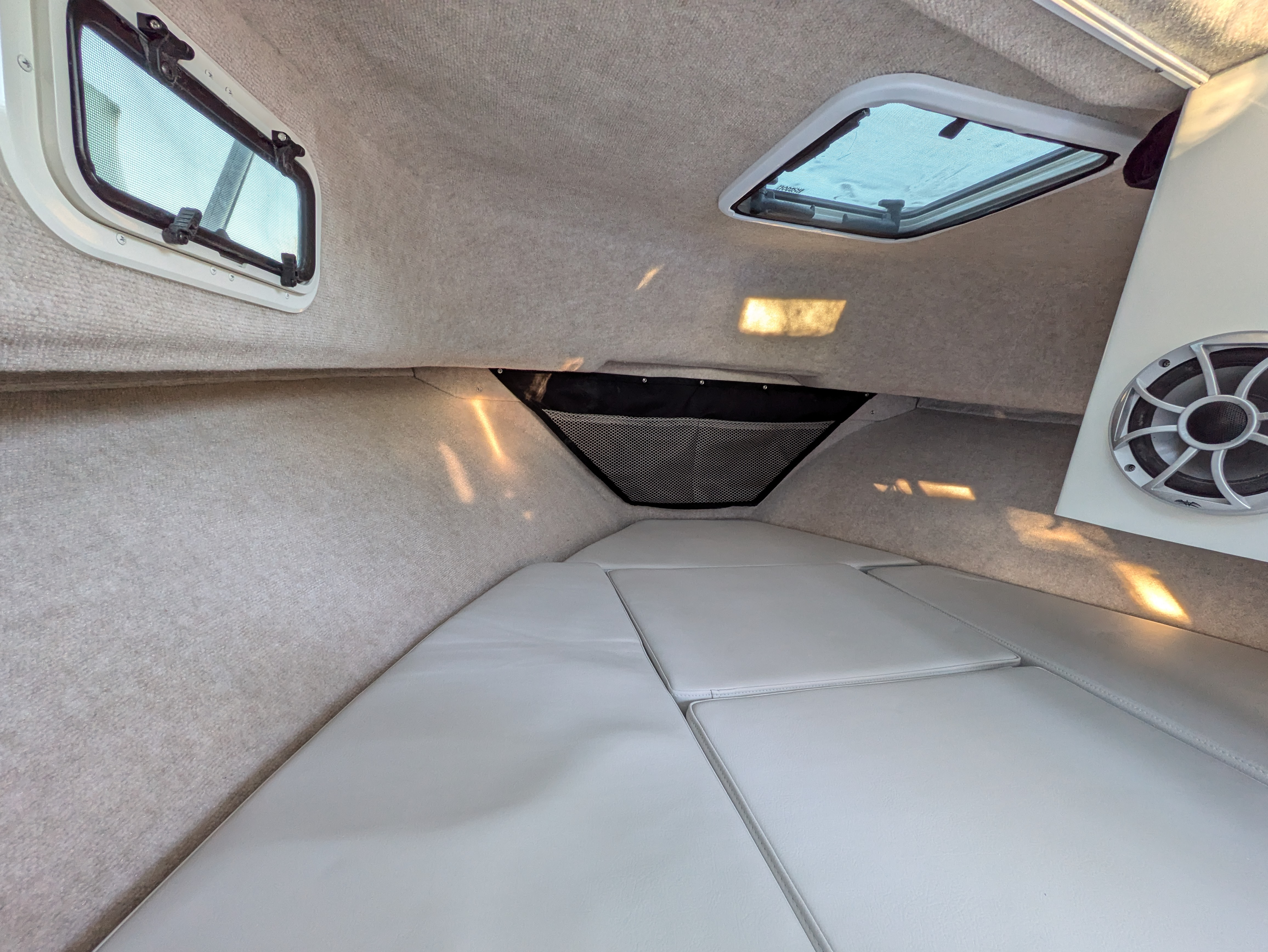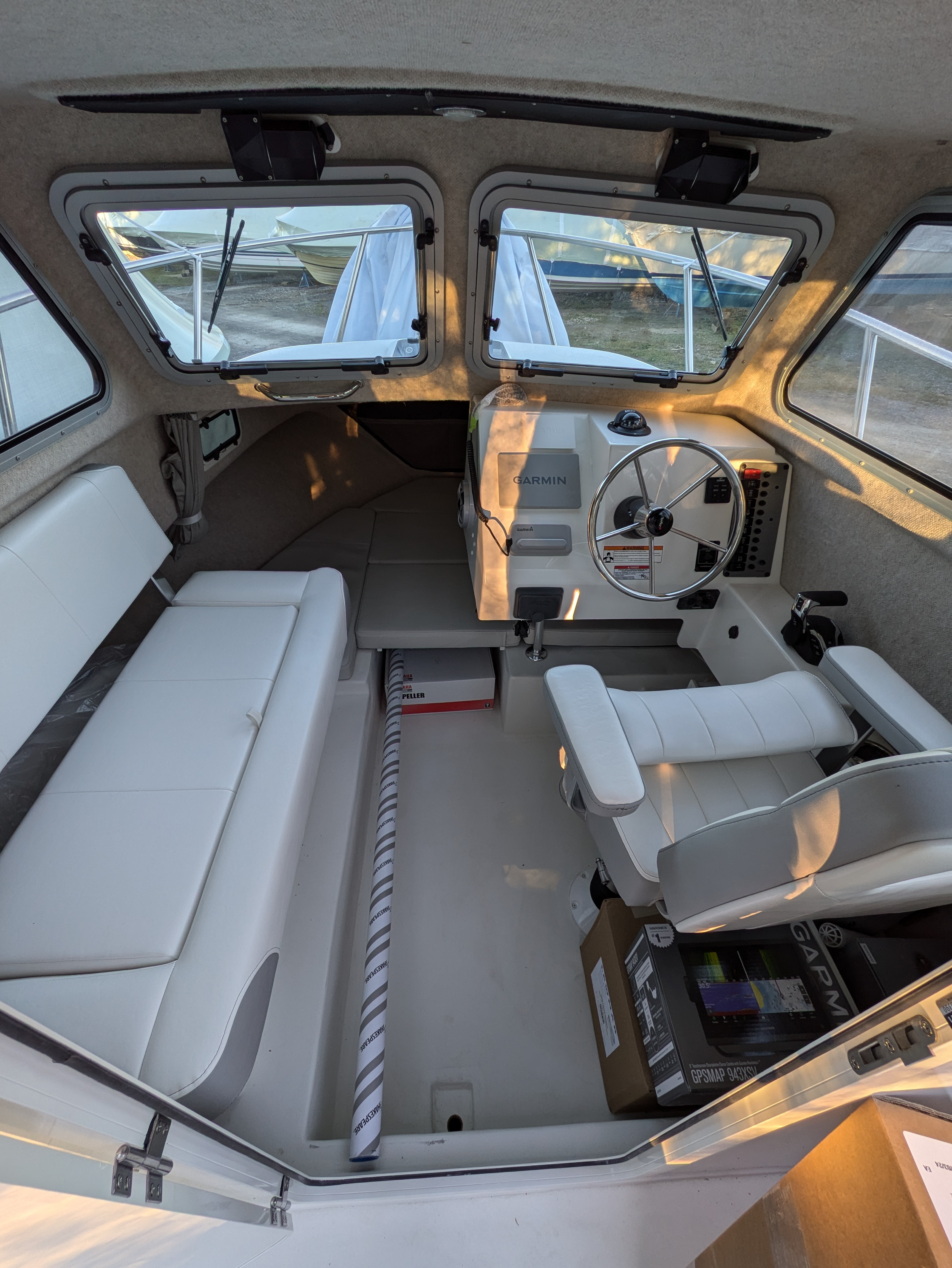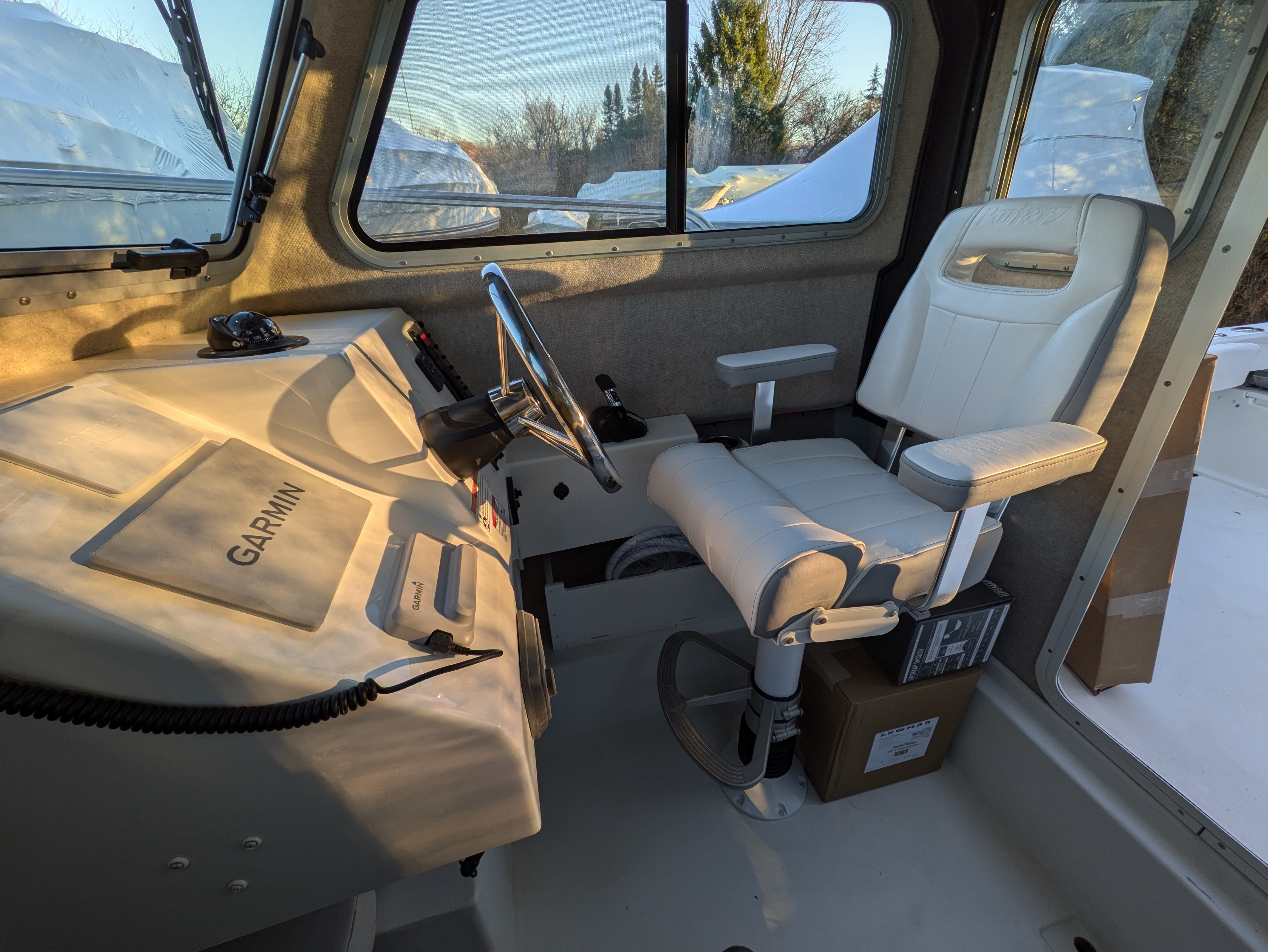 Pilothouse: Tinted windshields, fixed port windshield, starboard opening windshield, port and starboard sliding windows with screens, headliner, ladder back chair with cushions and footrest, port inboard facing lounge seat with tackle cabinet (3trays), interior storage and grab rails (forward and aft), storage tray (starboard), non-skid pilothouse floor and cabin lighting.