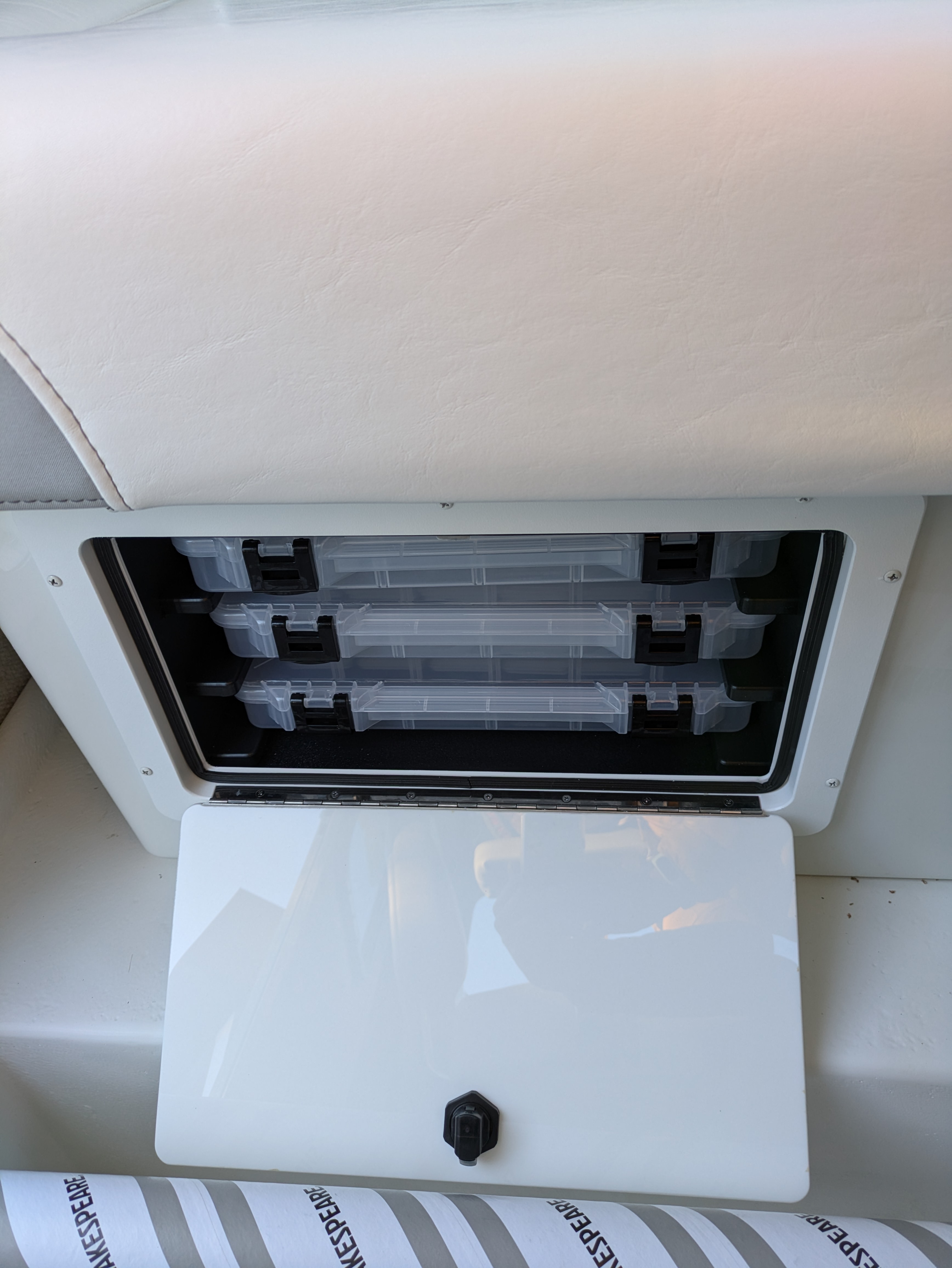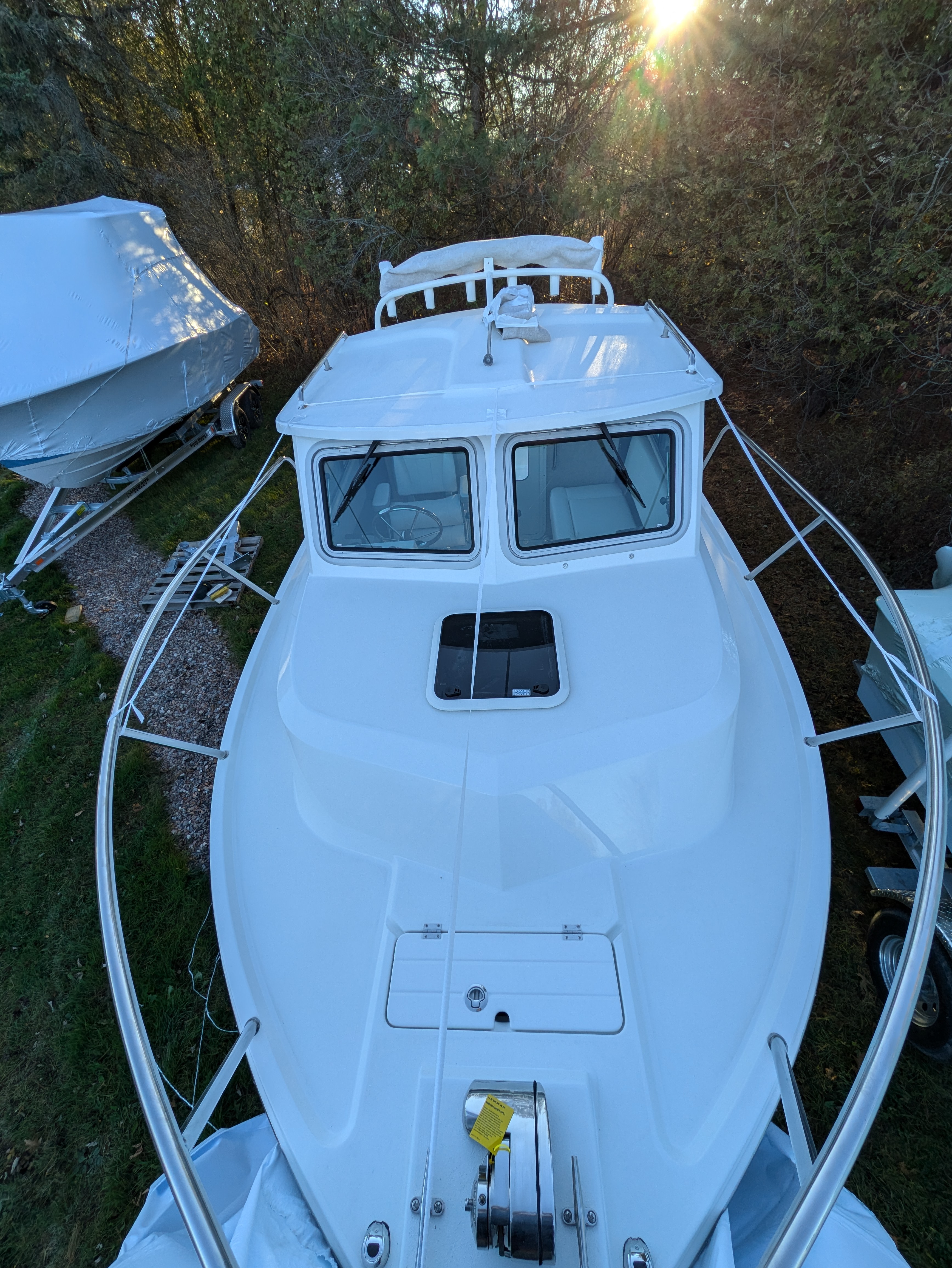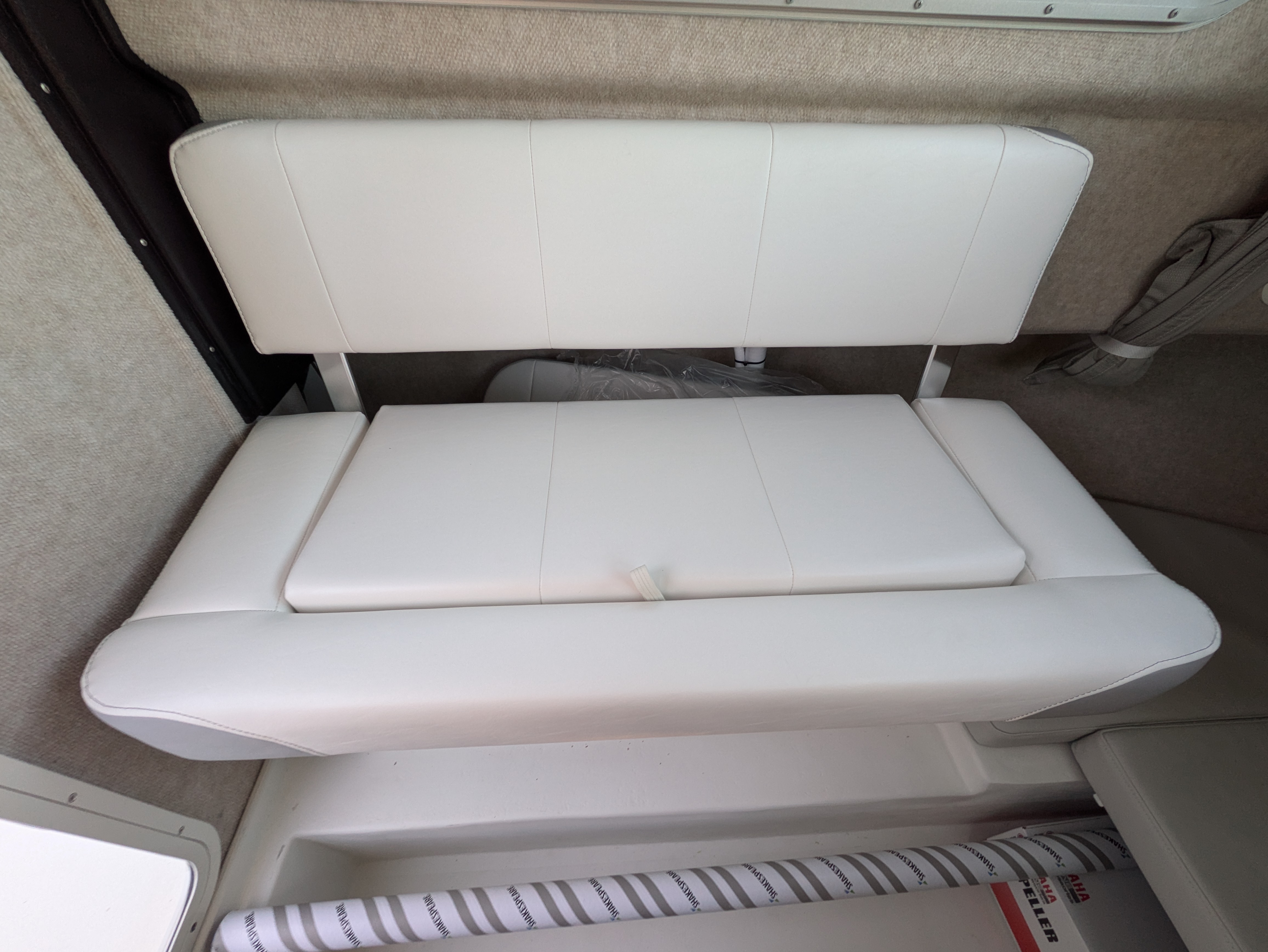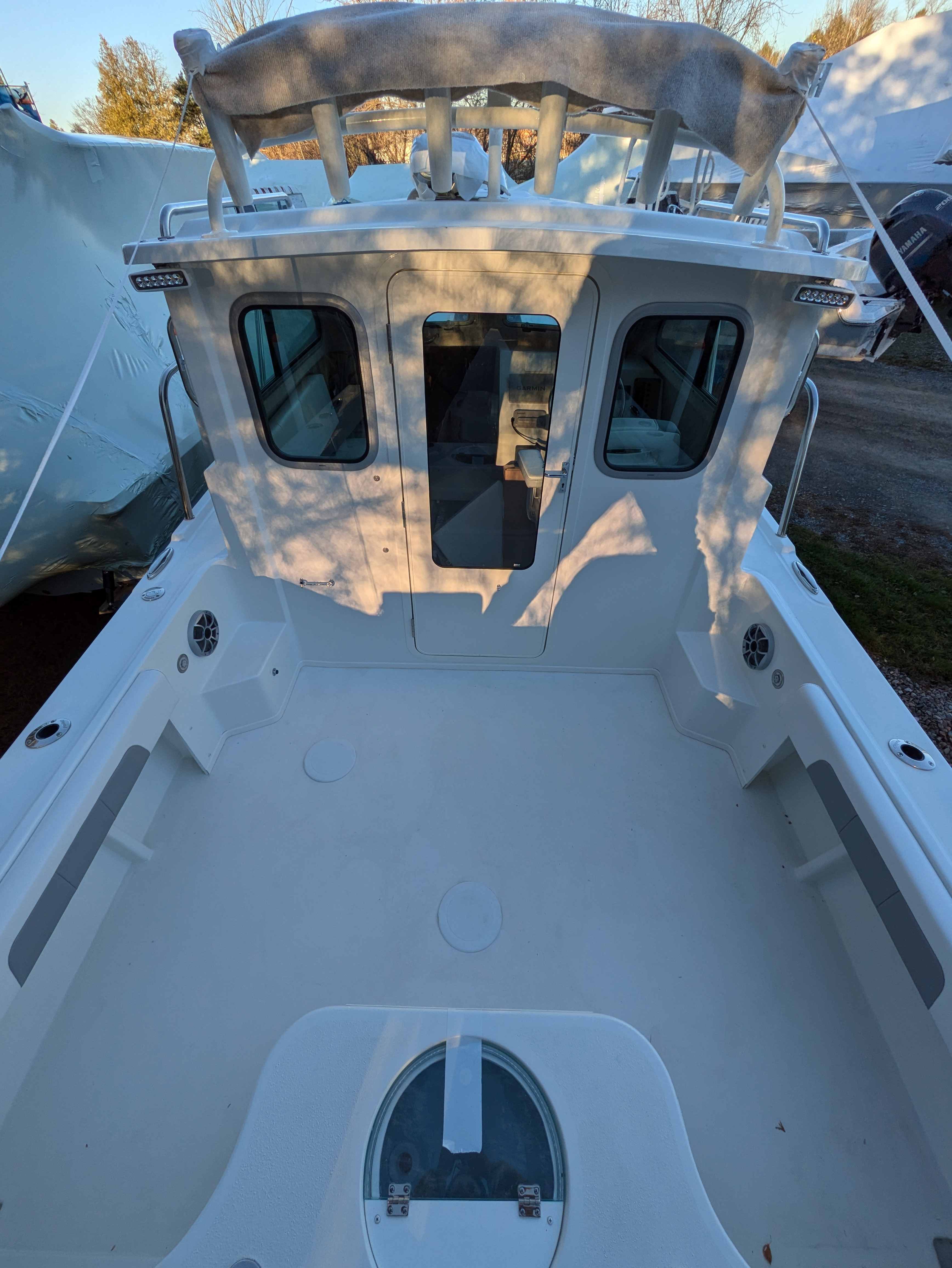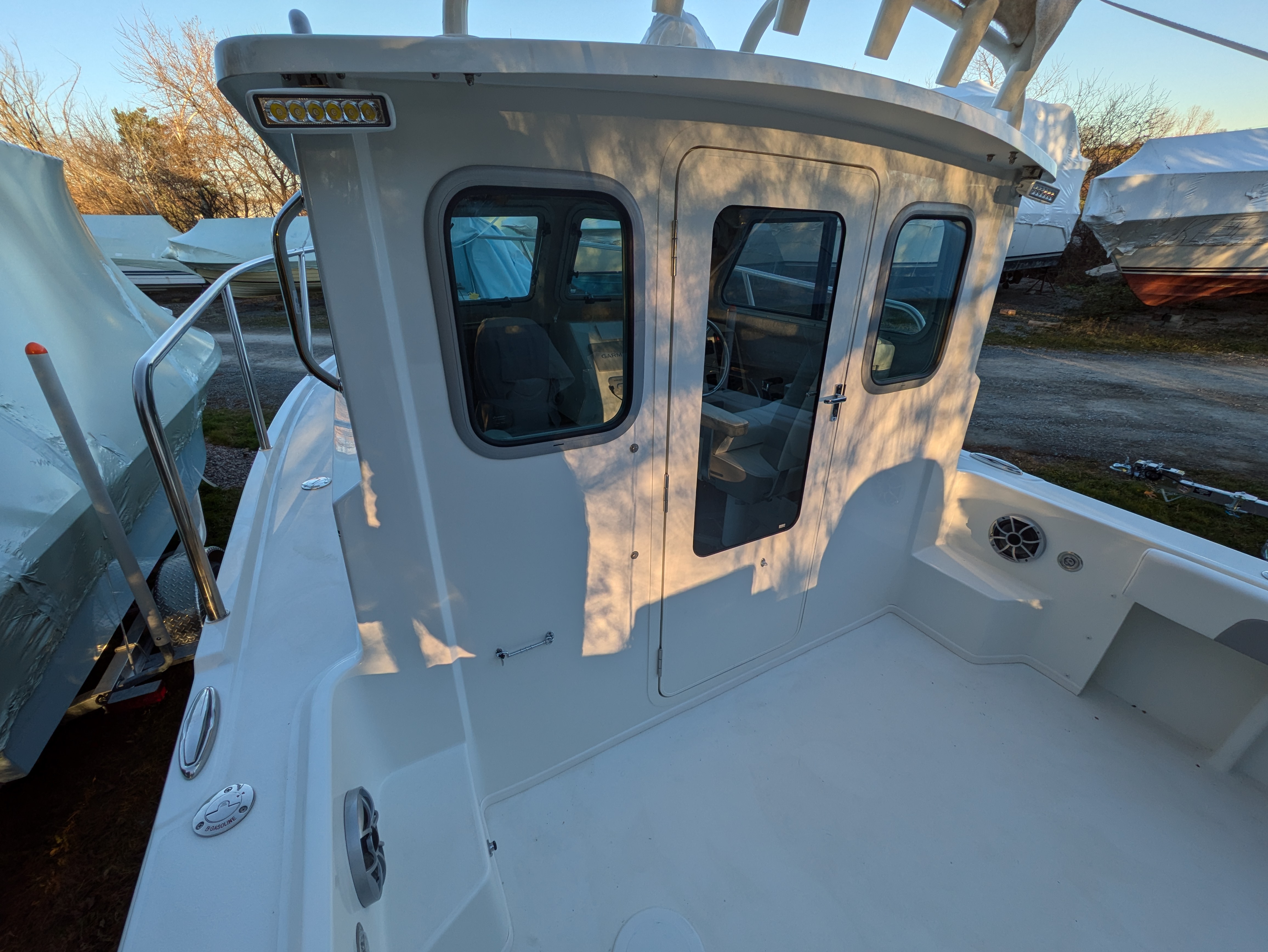 Pilothouse: Tinted windshields, fixed port windshield, starboard opening windshield, port and starboard sliding windows with screens, headliner, ladder back chair with cushions and footrest, port inboard facing lounge seat with tackle cabinet (3trays), interior storage and grab rails (forward and aft), storage tray (starboard), non-skid pilothouse floor and cabin lighting.