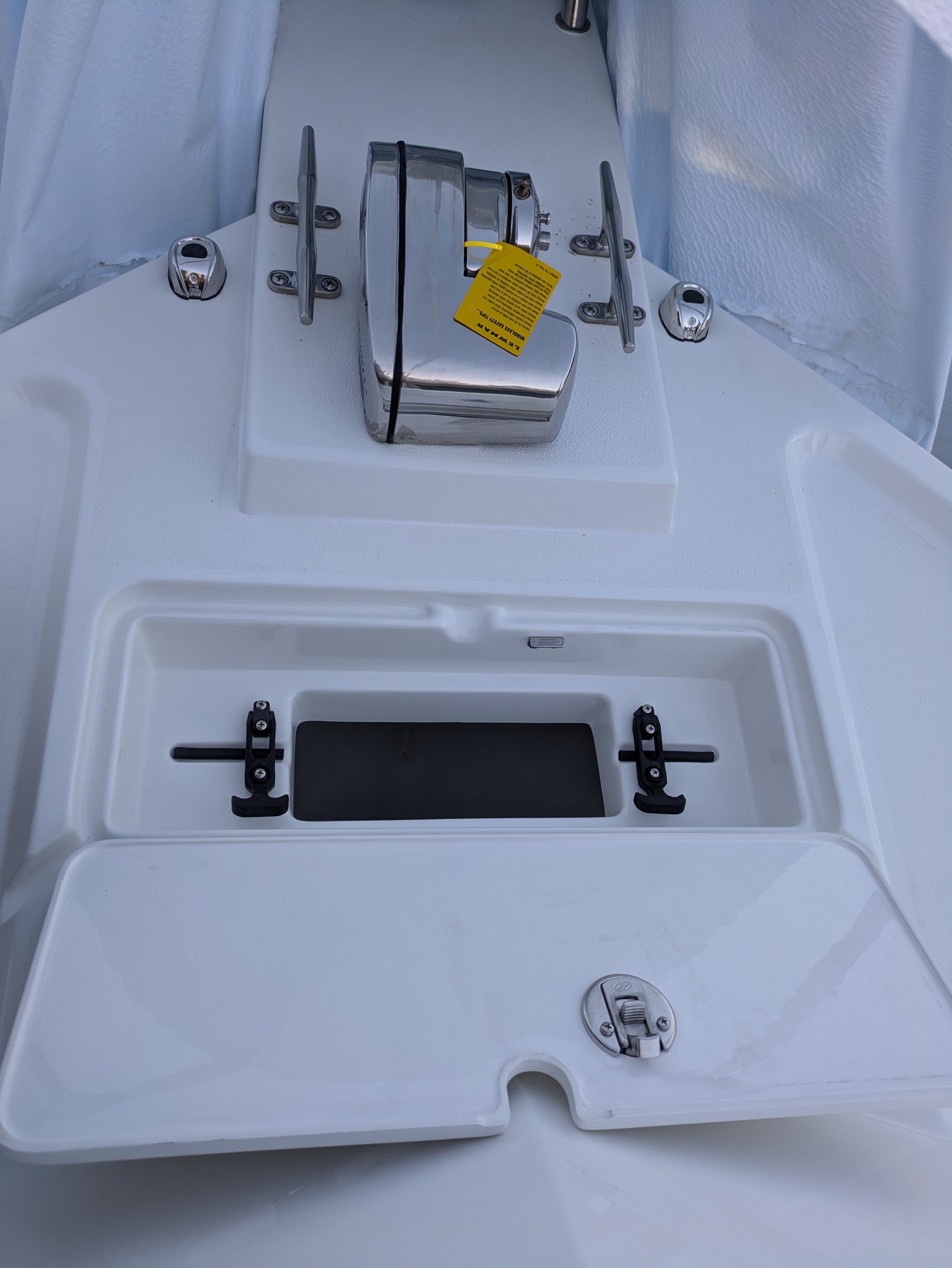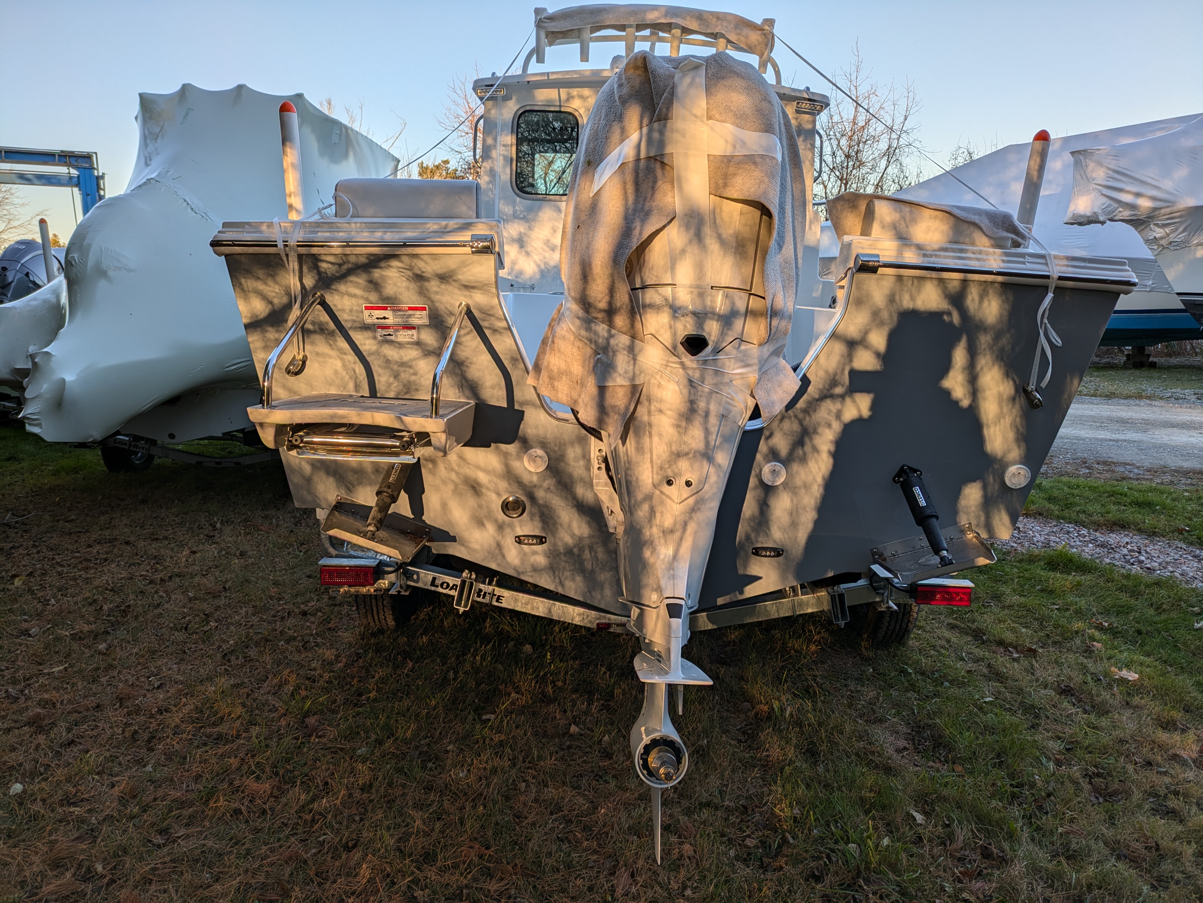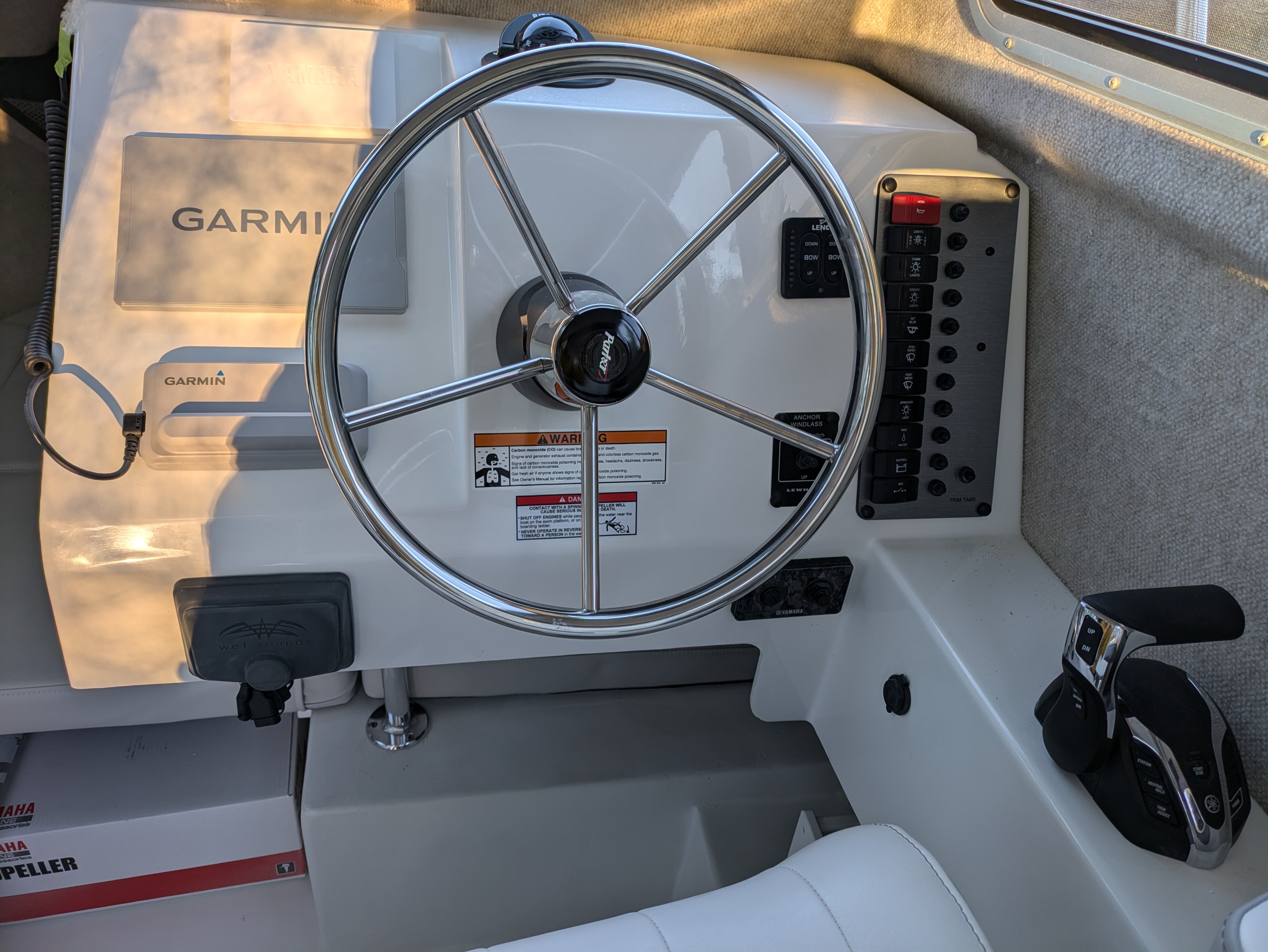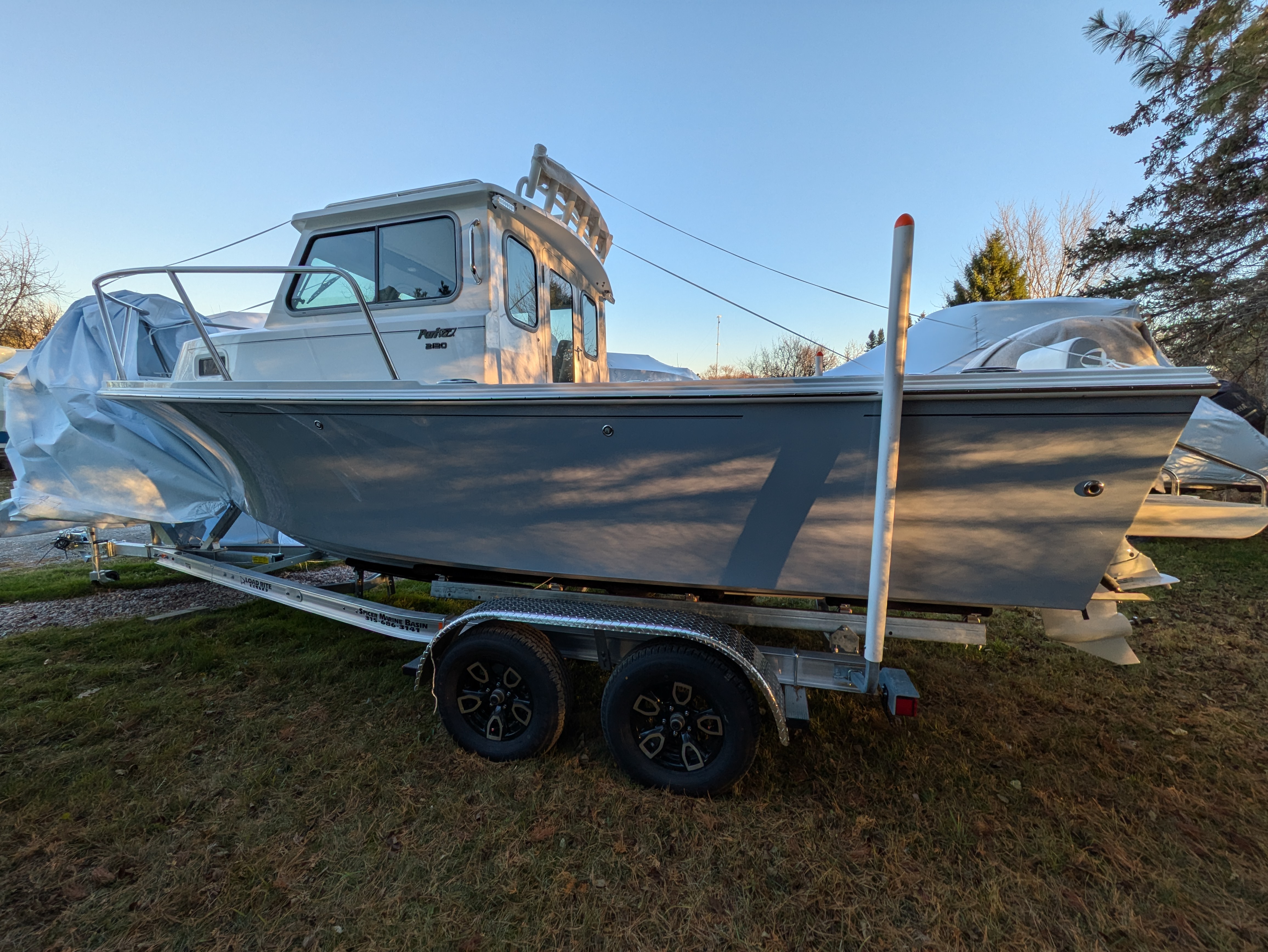 Pilothouse: Tinted windshields, fixed port windshield, starboard opening windshield, port and starboard sliding windows with screens, headliner, ladder back chair with cushions and footrest, port inboard facing lounge seat with tackle cabinet (3trays), interior storage and grab rails (forward and aft), storage tray (starboard), non-skid pilothouse floor and cabin lighting.