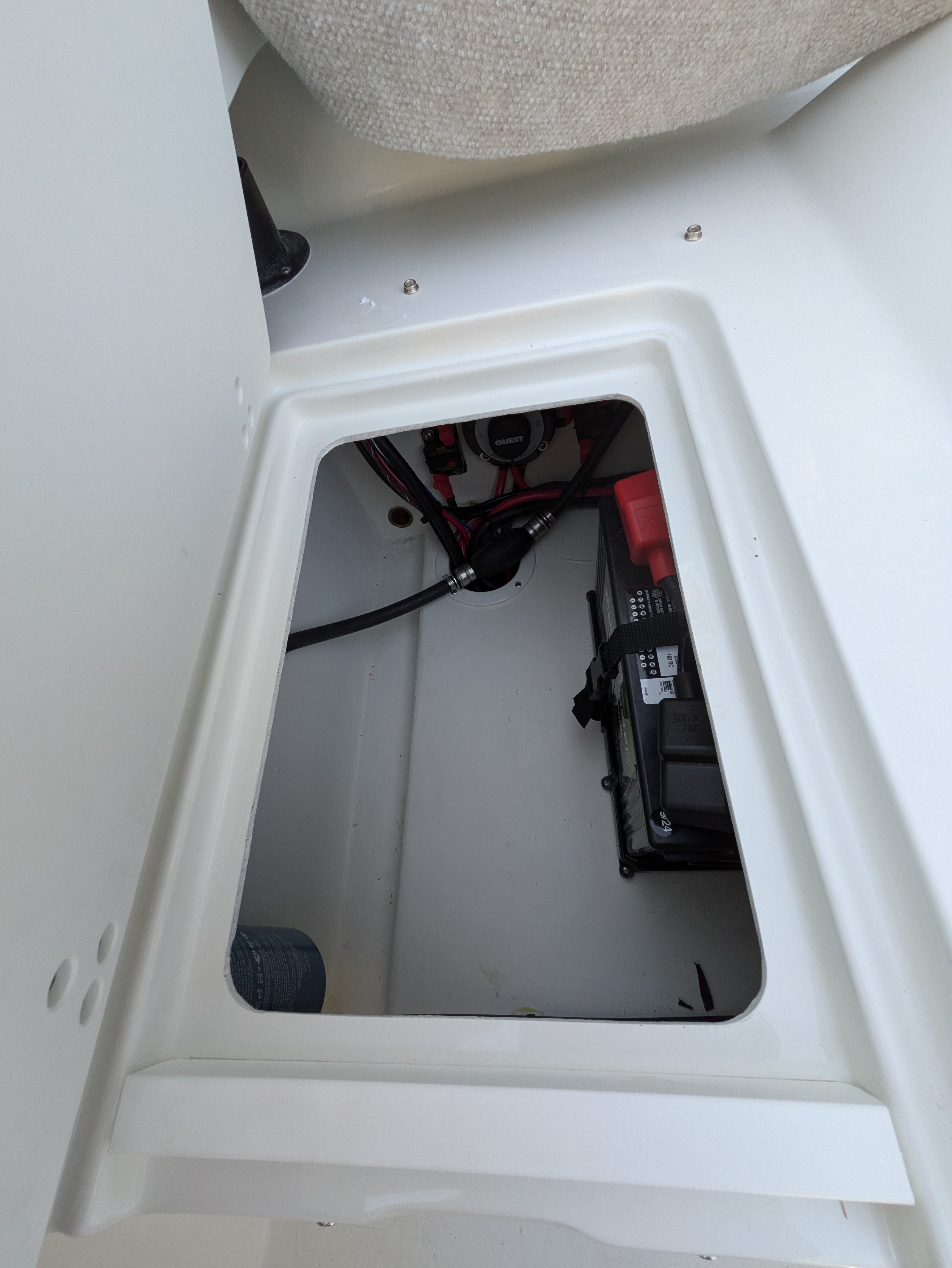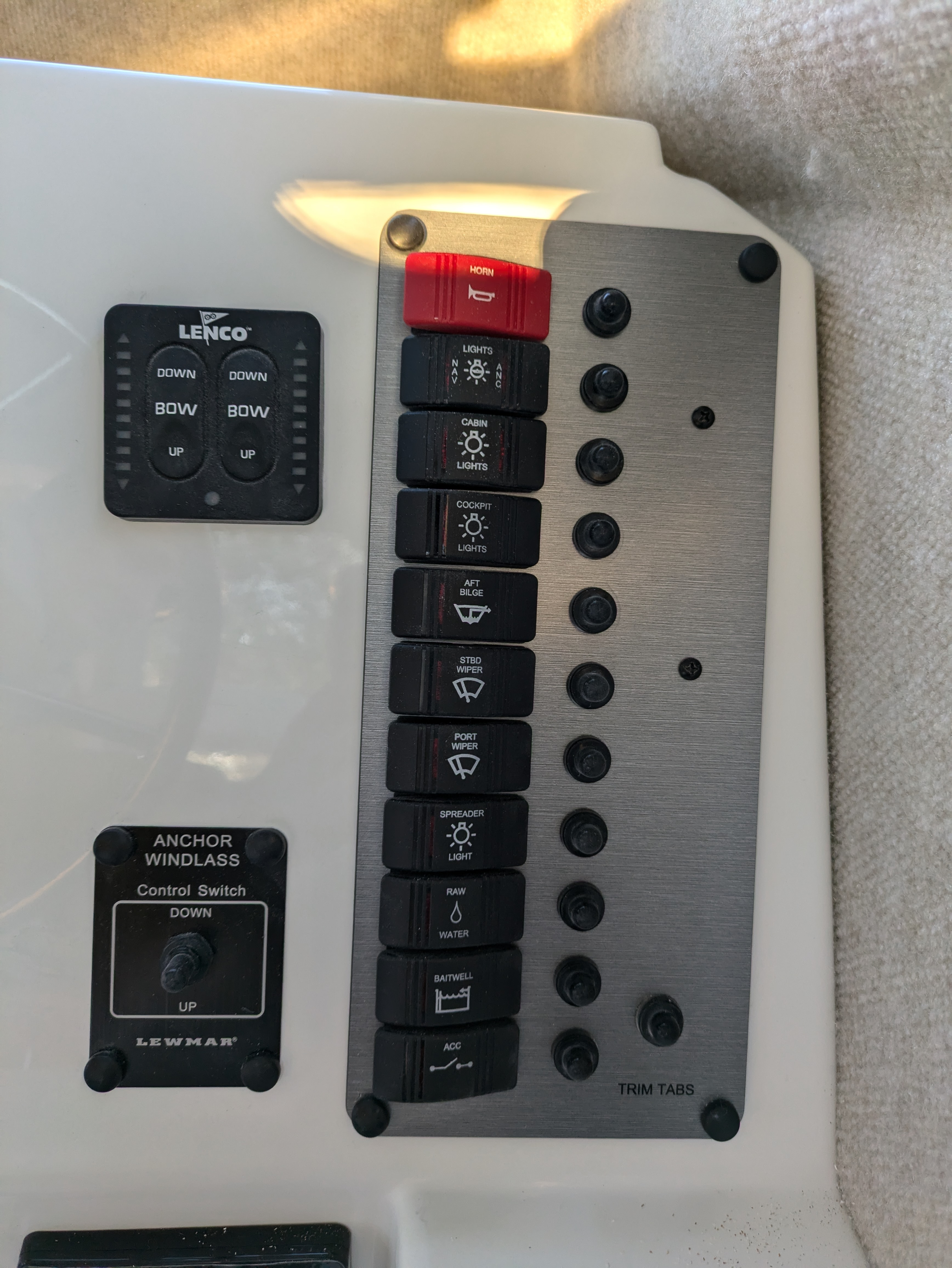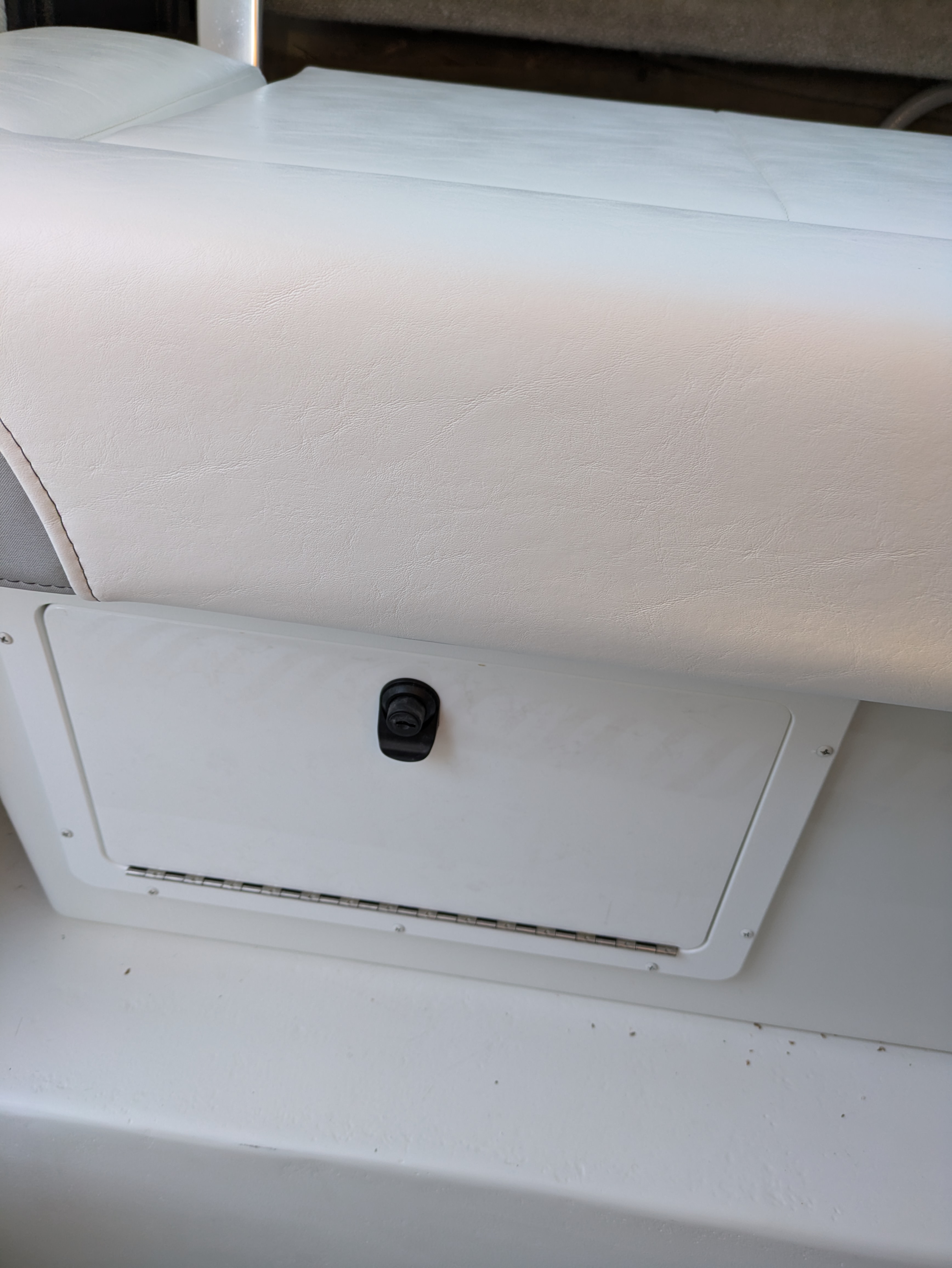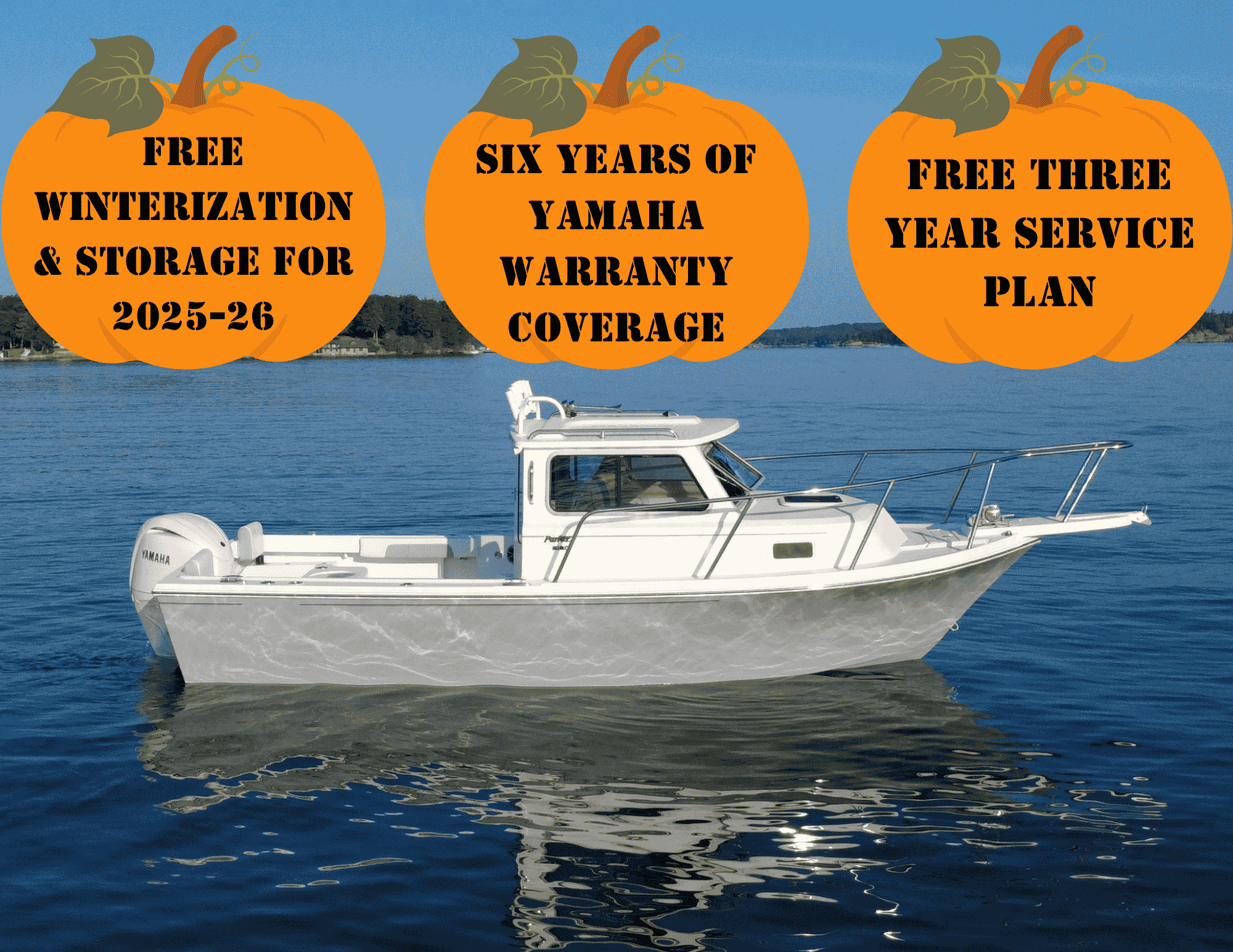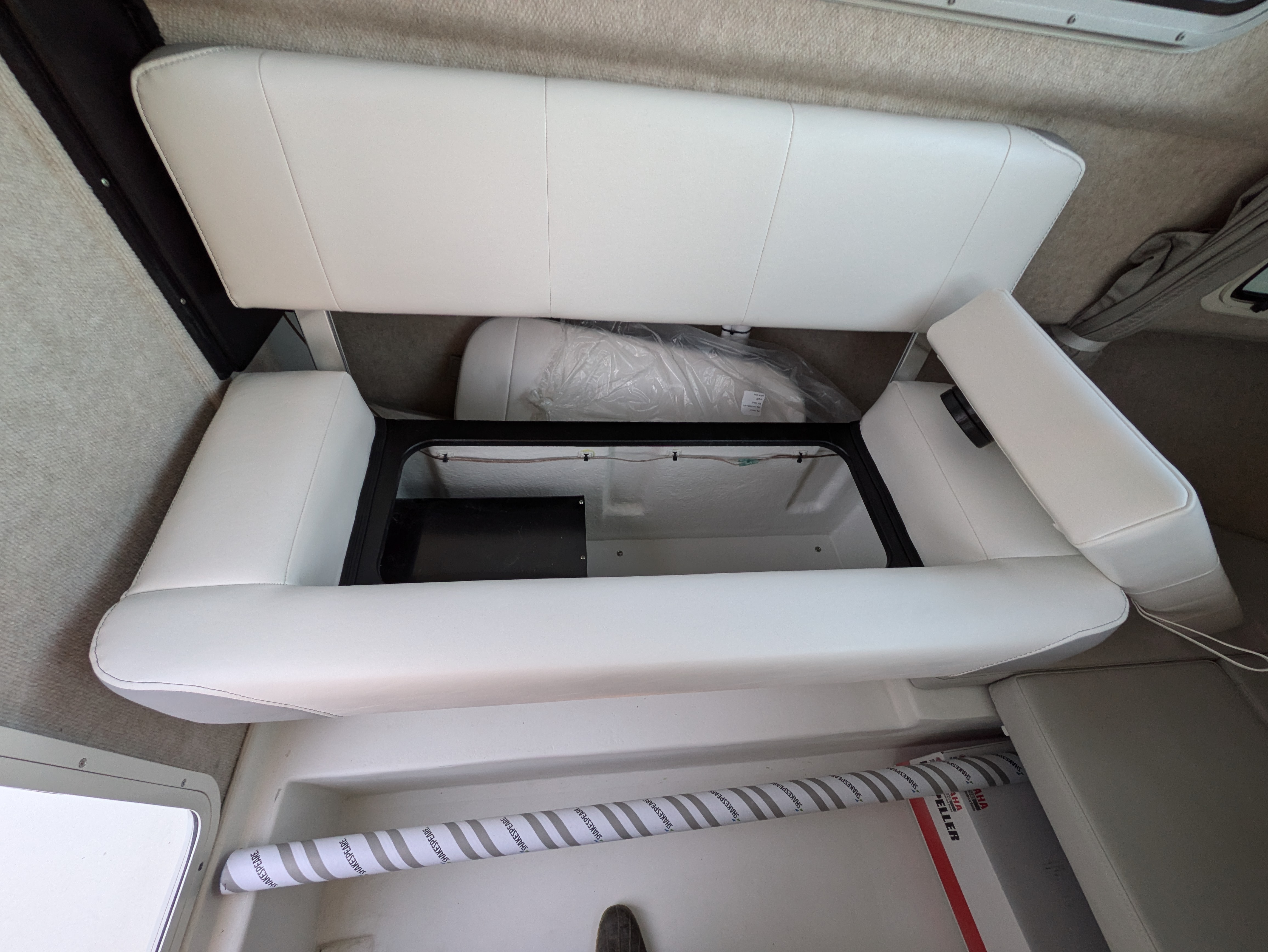 Pilothouse: Tinted windshields, fixed port windshield, starboard opening windshield, port and starboard sliding windows with screens, headliner, ladder back chair with cushions and footrest, port inboard facing lounge seat with tackle cabinet (3trays), interior storage and grab rails (forward and aft), storage tray (starboard), non-skid pilothouse floor and cabin lighting.