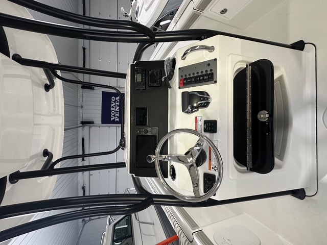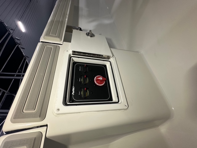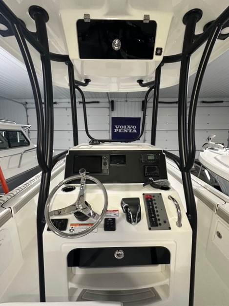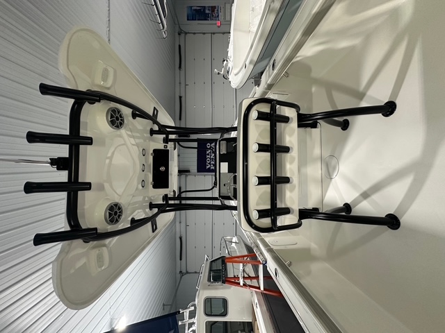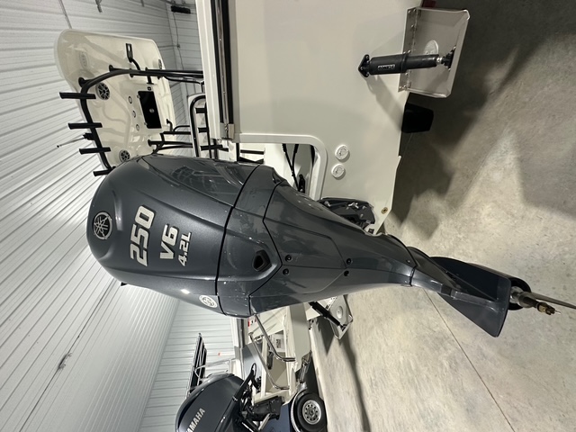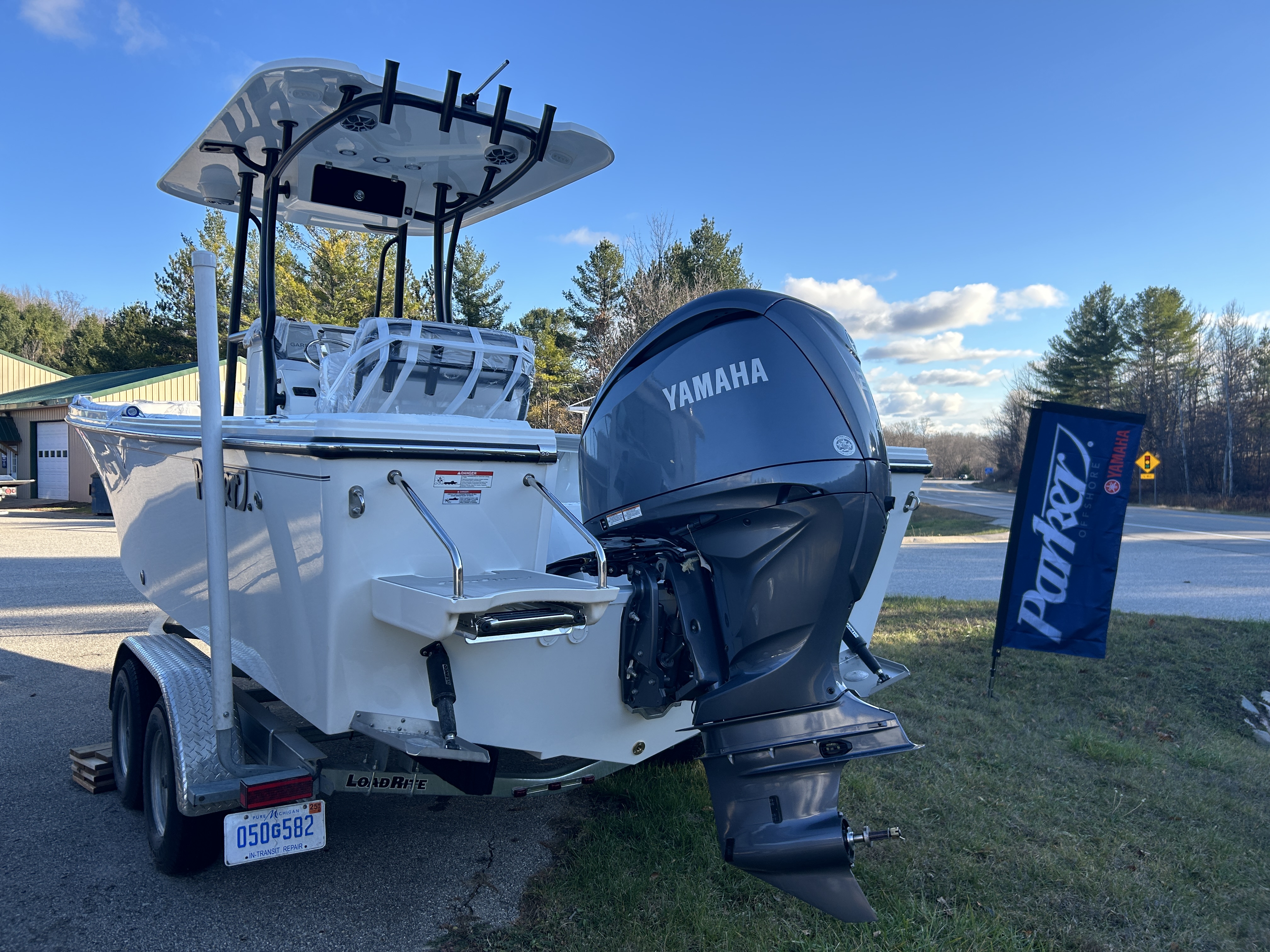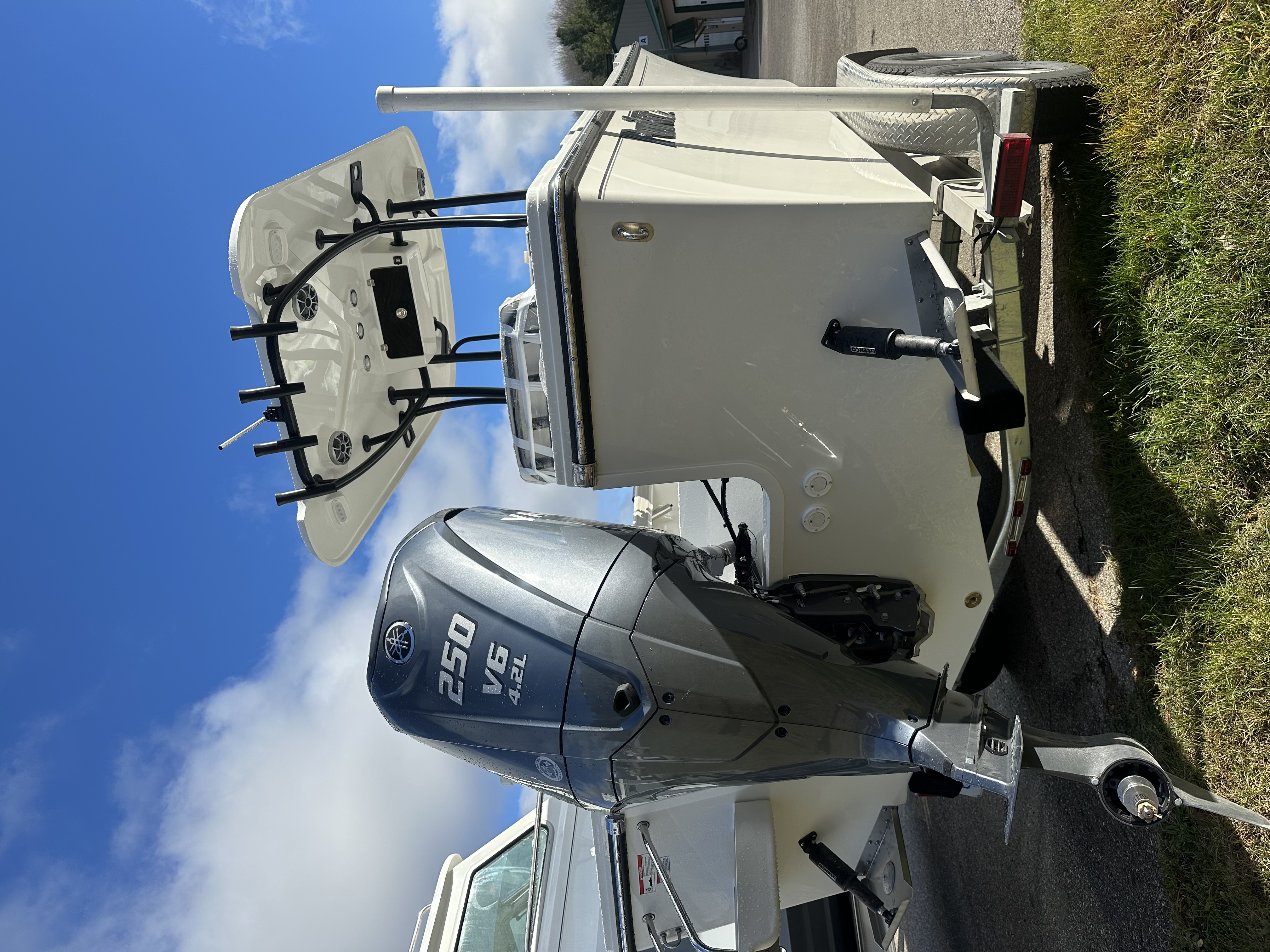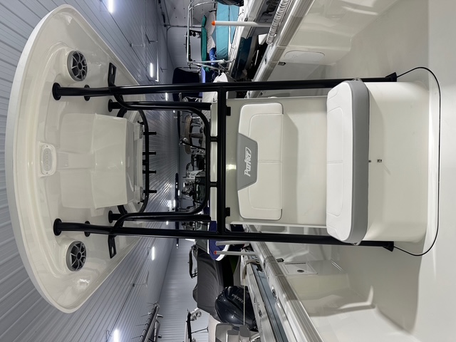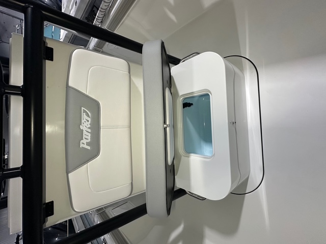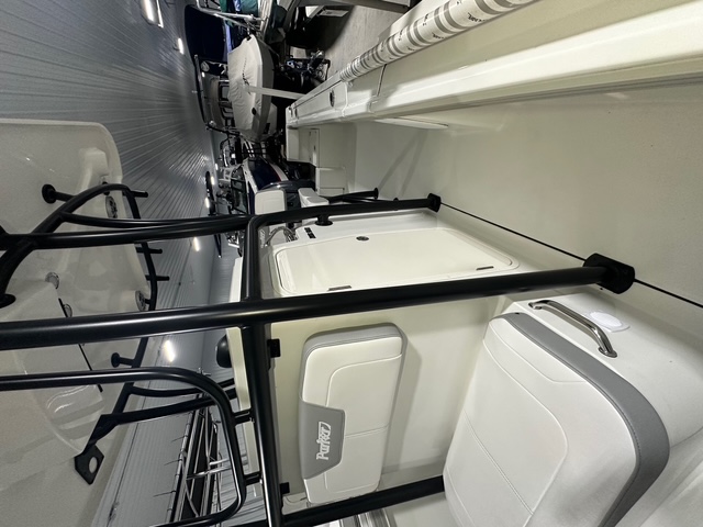 2025 Parker Offshore 23 SE Center Console, white, Yamaha 250hp outboard engine (F250XCB), Load Rite tandem axle trailer, fiberglass hard top, black powder coated rount-tube T-Top frame w/ 4-rod rocket launcher, electronics box, integrated LED spreader lights (1 Fwd, 2 Aft), speaker pods (2), LED courtesy lights (3), black powder coated leaning post, Wet Sounds stereo w/ speakers, Wet Sounds LED speaker upgrade, forward V-seat, cockpit coaming bolsters w/ marine mat port & starboard, marine mat console top, battery charger (2 bank), raw water washdown, splashwell, Garmin GPS Map 1042 XSV & B60 & VHF 115 w/ antenna