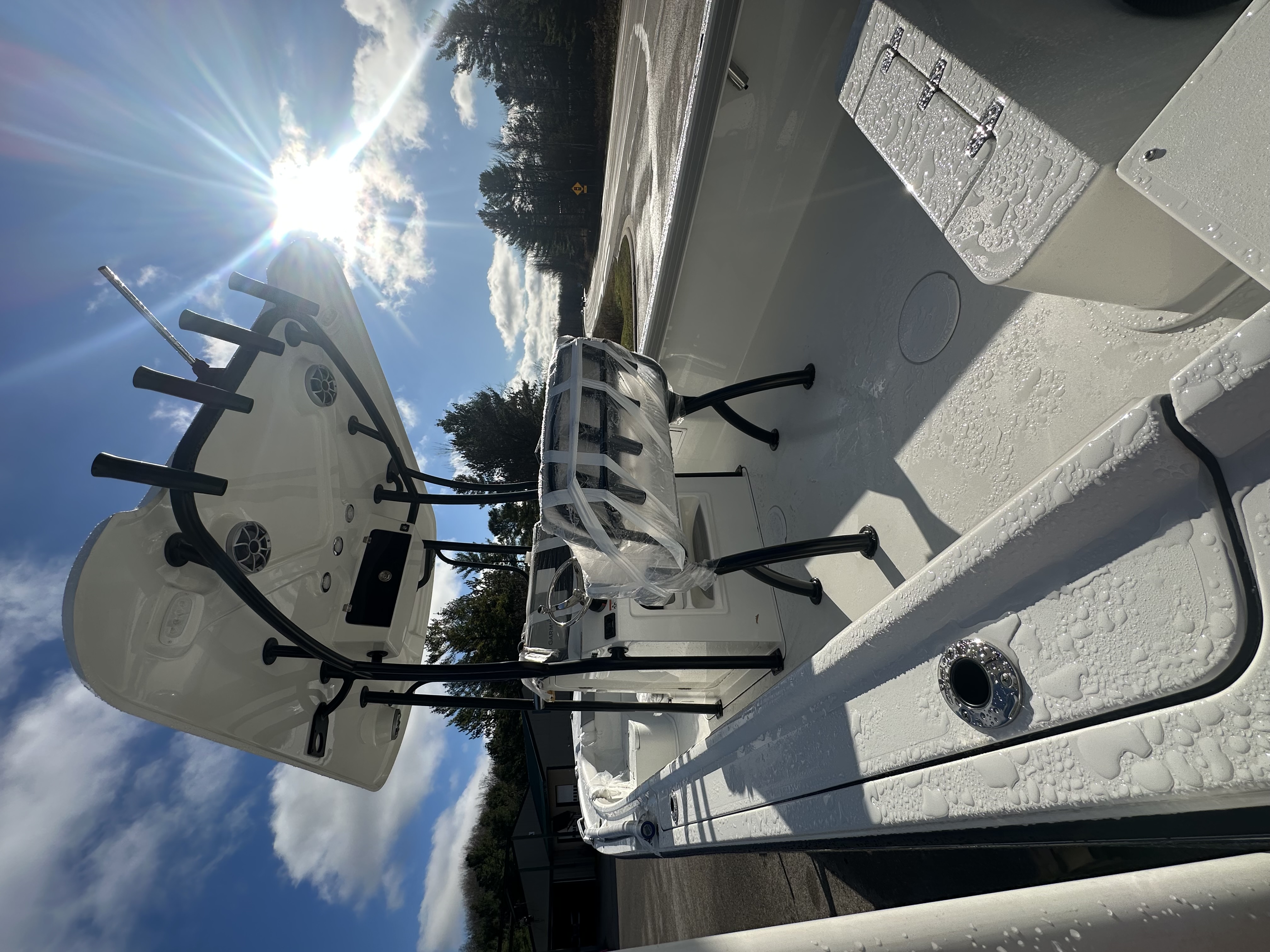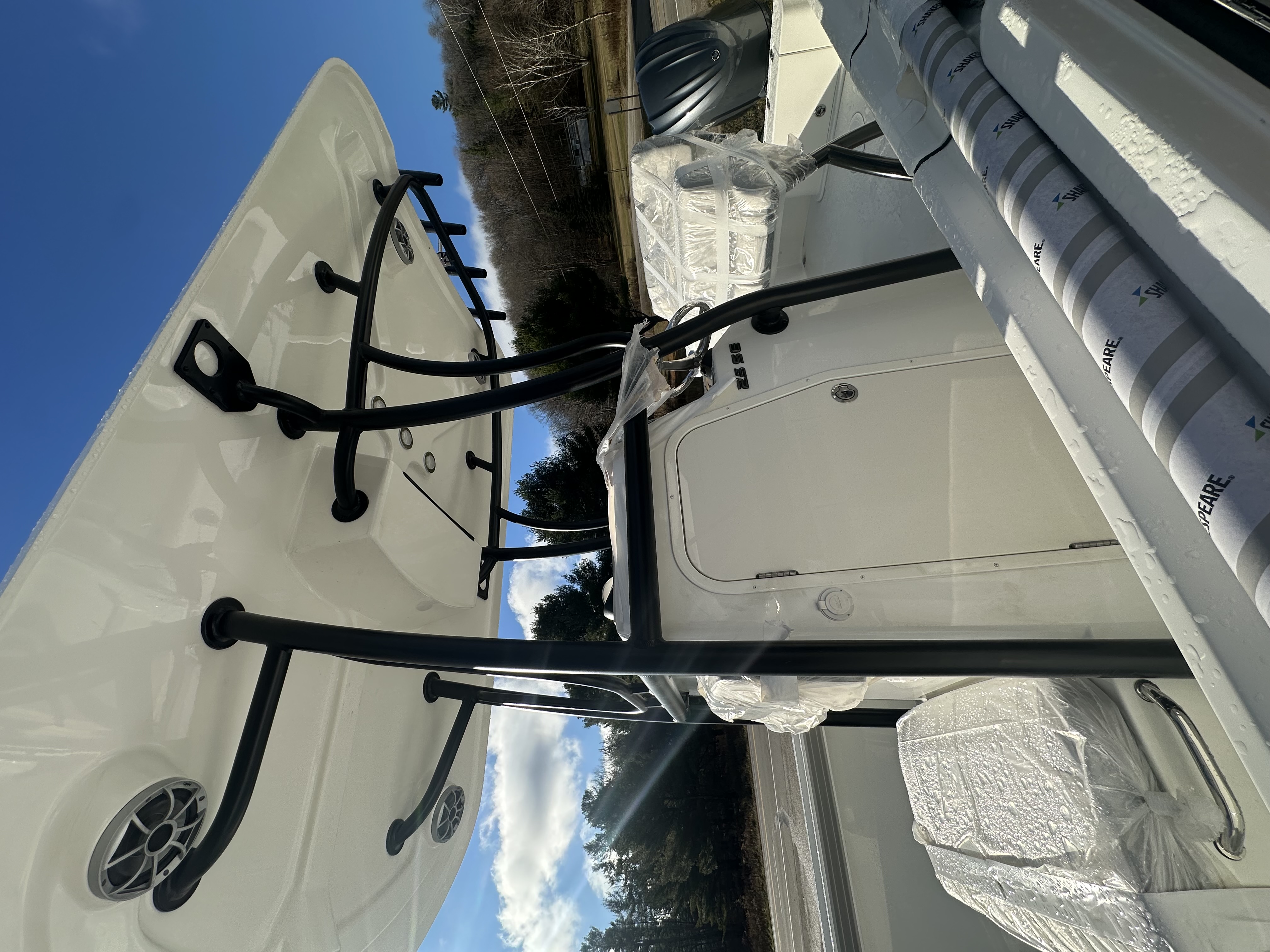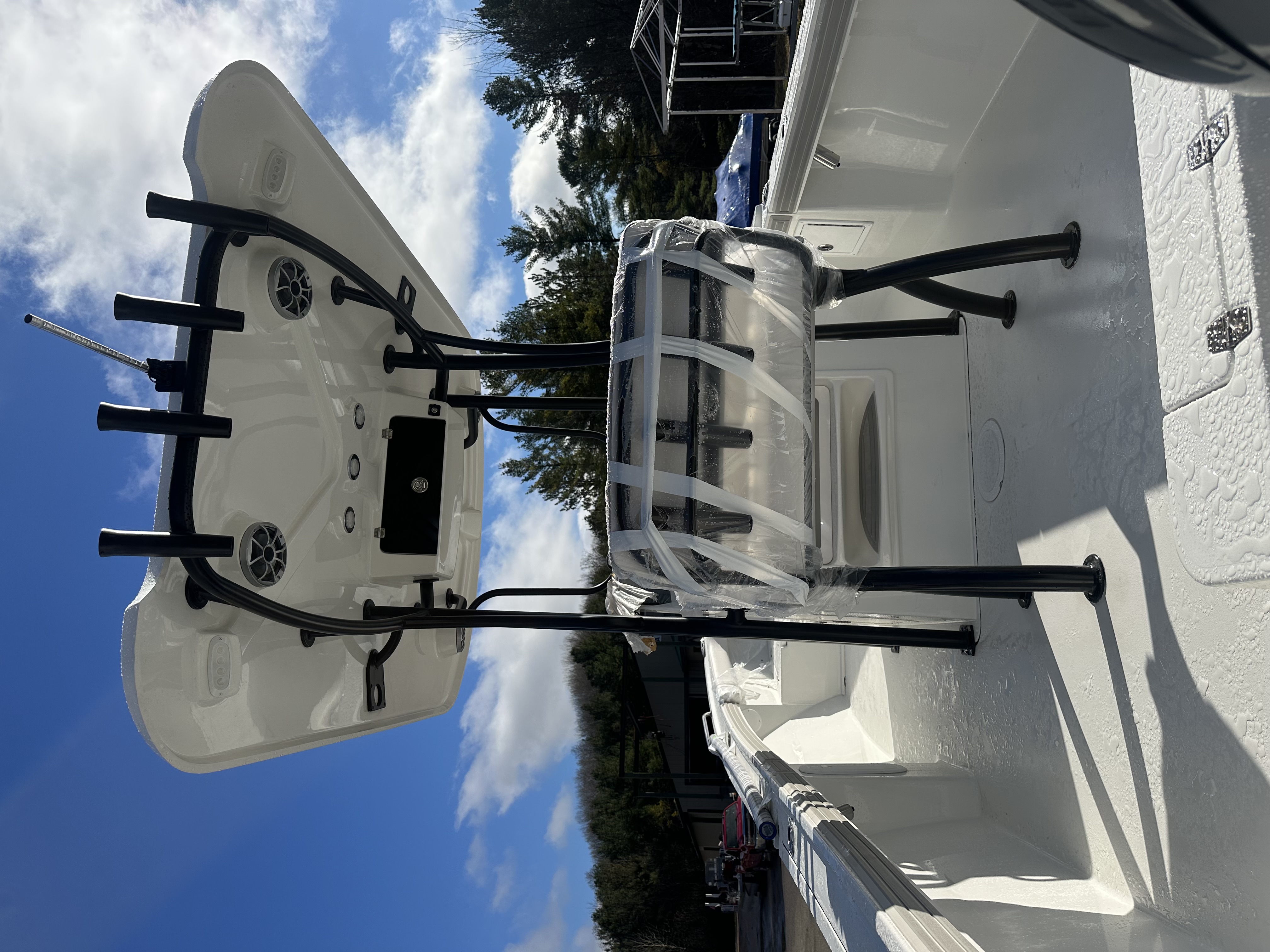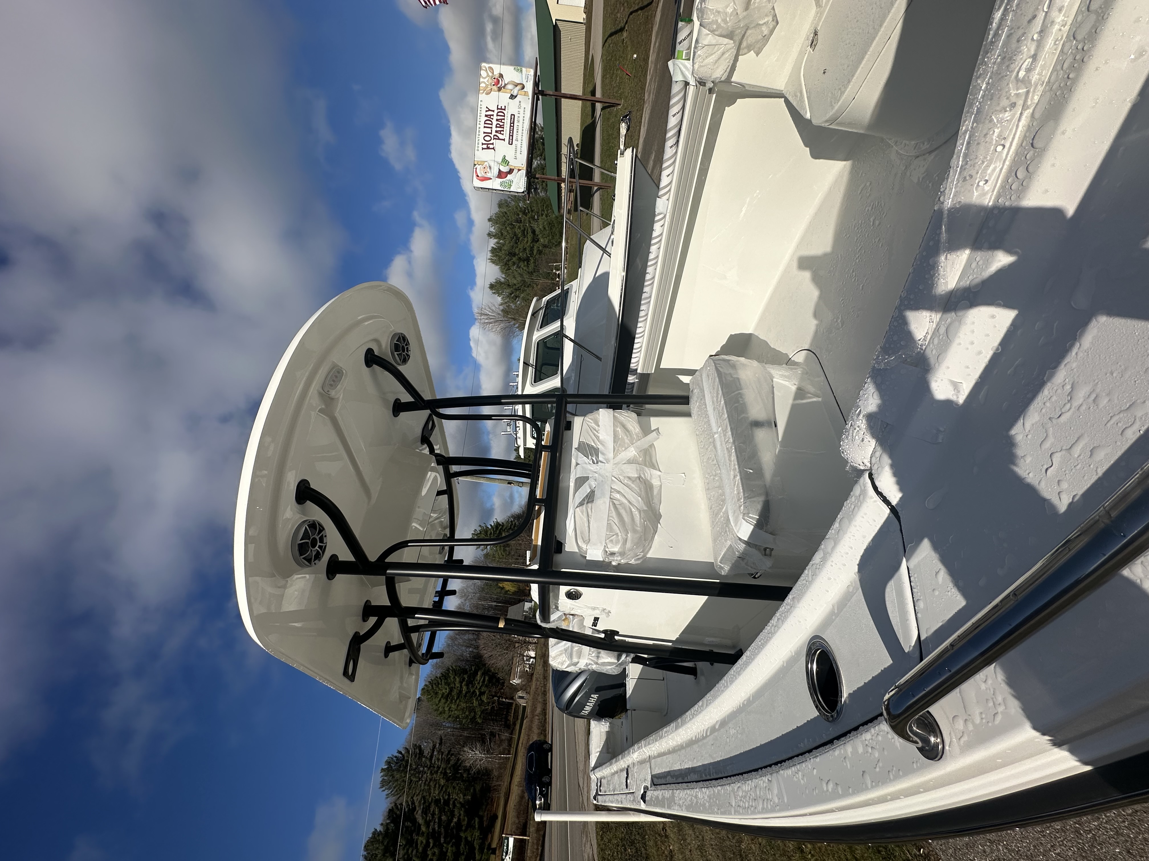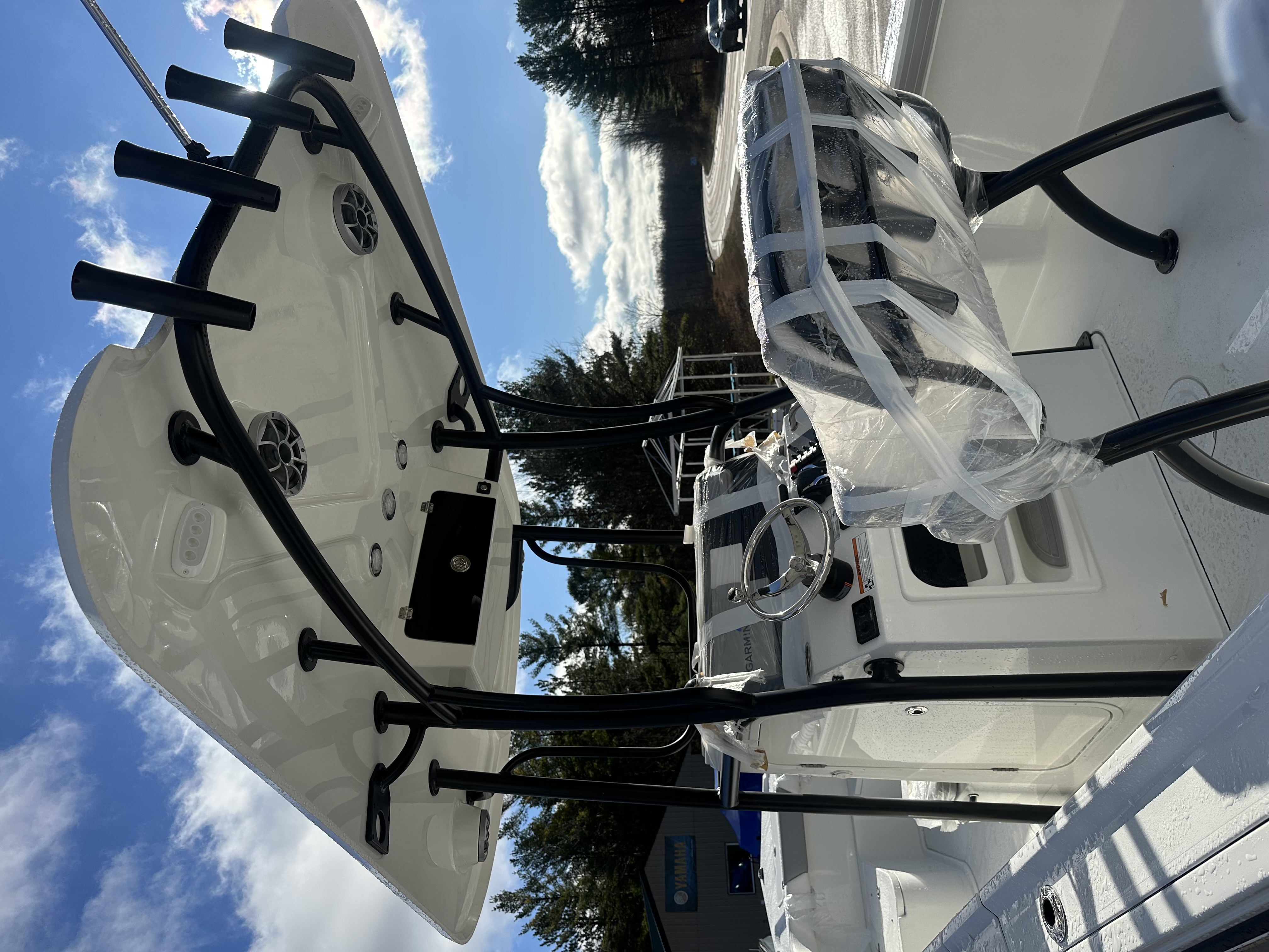 2025 Parker Offshore 23 SE Center Console, white, Yamaha 250hp outboard engine (F250XCB), Load Rite tandem axle trailer, fiberglass hard top, black powder coated rount-tube T-Top frame w/ 4-rod rocket launcher, electronics box, integrated LED spreader lights (1 Fwd, 2 Aft), speaker pods (2), LED courtesy lights (3), black powder coated leaning post, Wet Sounds stereo w/ speakers, Wet Sounds LED speaker upgrade, forward V-seat, cockpit coaming bolsters w/ marine mat port & starboard, marine mat console top, battery charger (2 bank), raw water washdown, splashwell, Garmin GPS Map 1042 XSV & B60 & VHF 115 w/ antenna