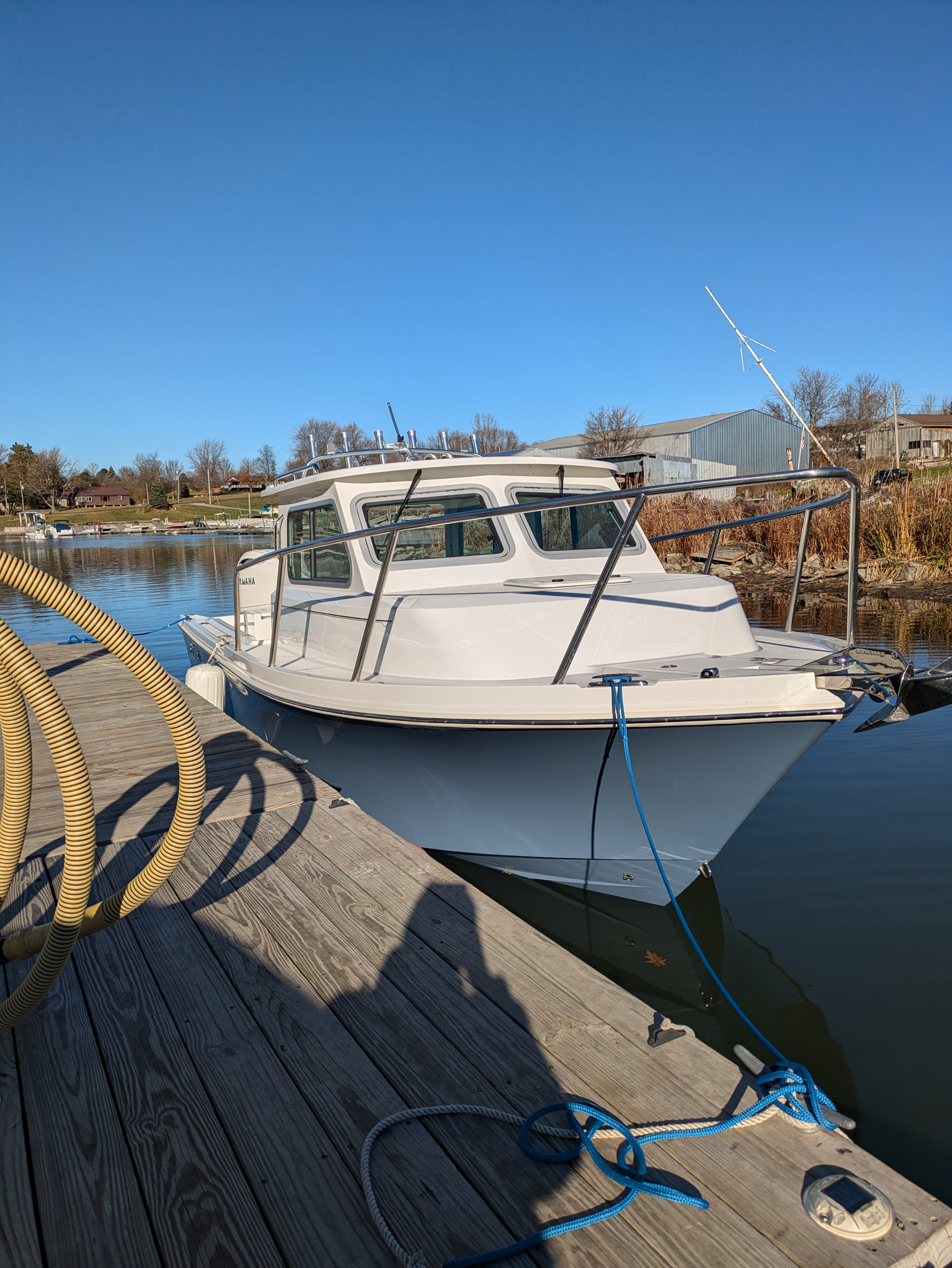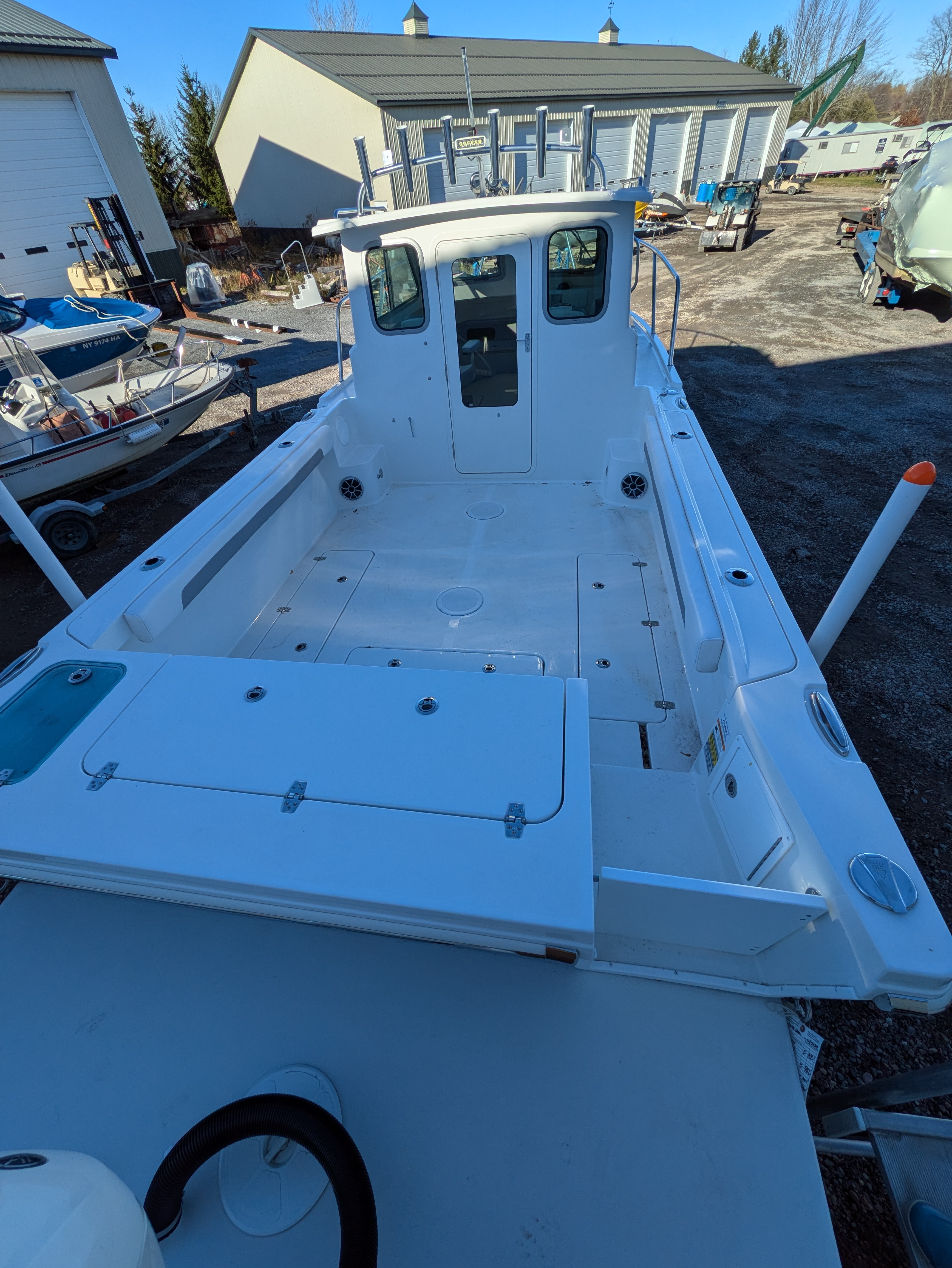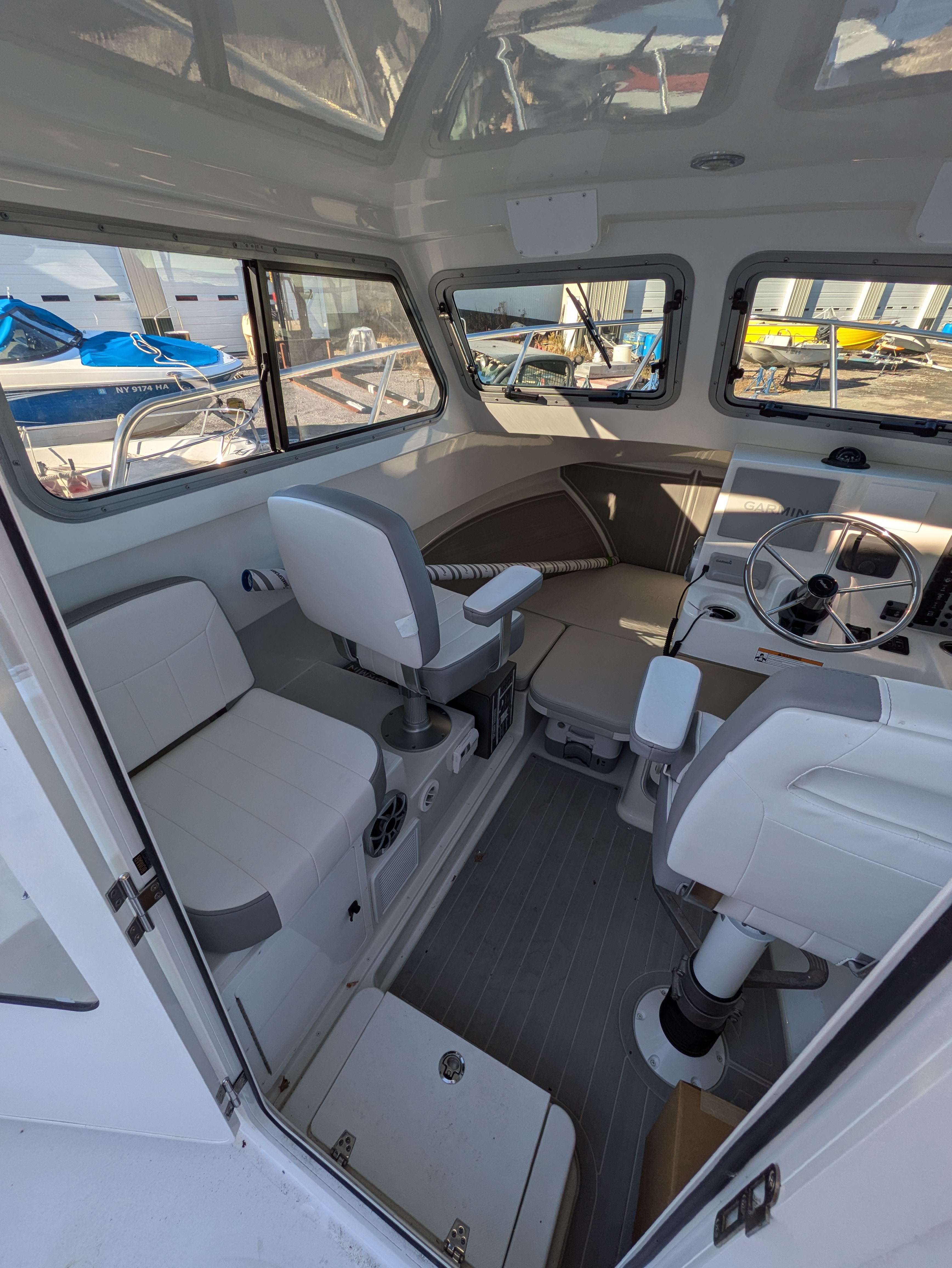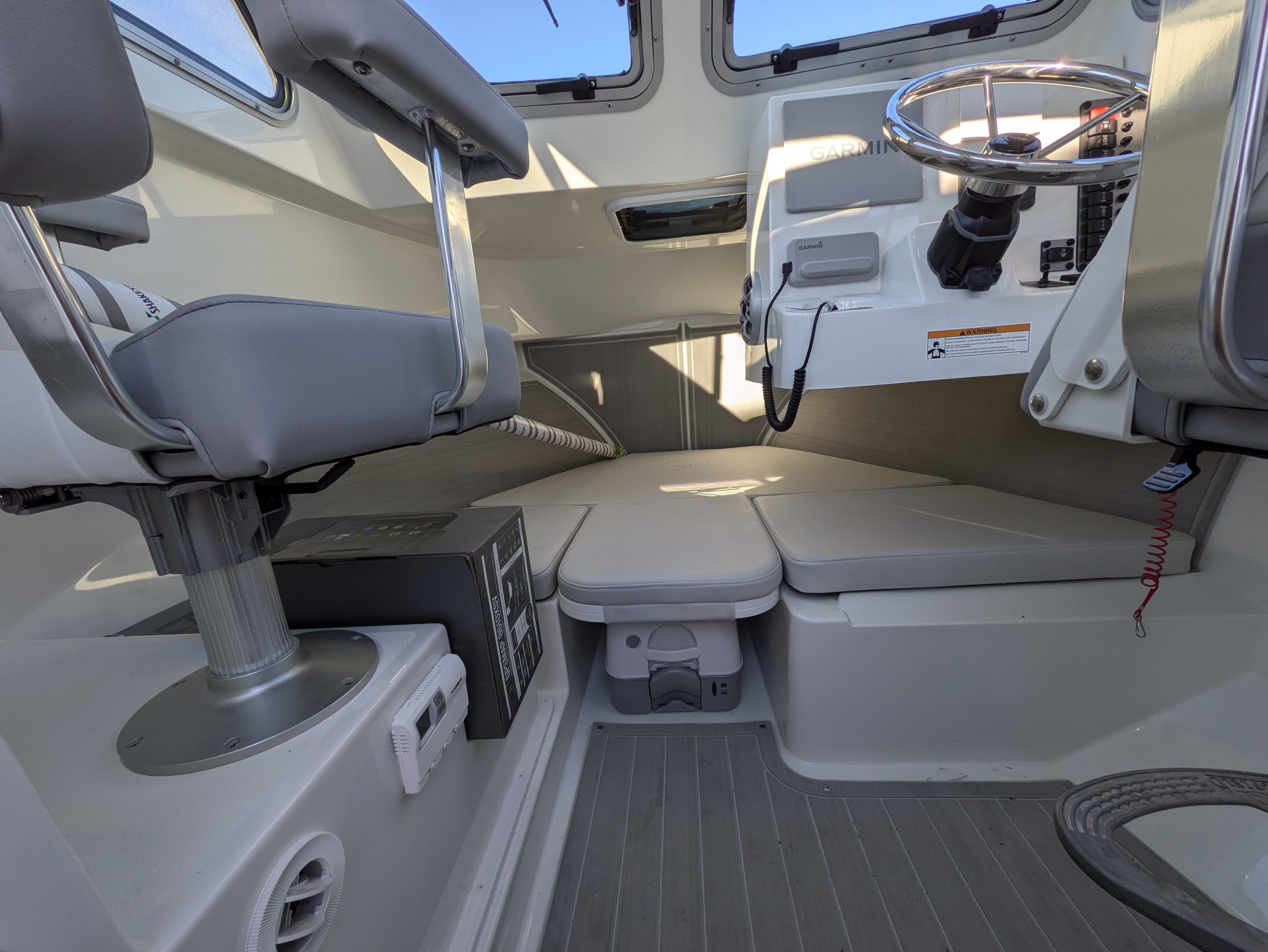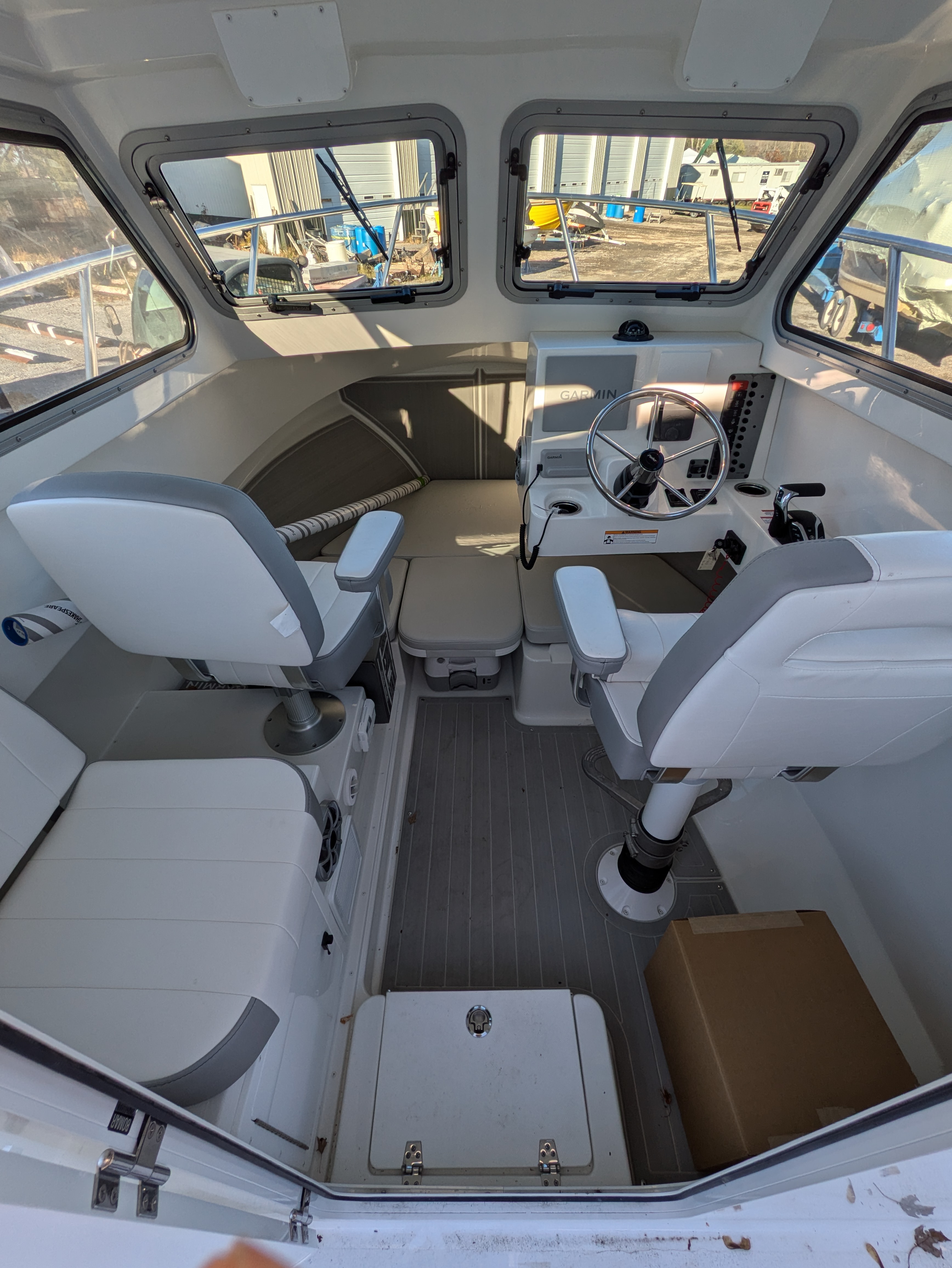 Pilothouse (57"L X 84"W): Windshields (starboard hinged), sliding side windows with screens, ladder back seating with footrests, interior storage & grabrails, non-skid pilothouse floor, LED cabin lighting.