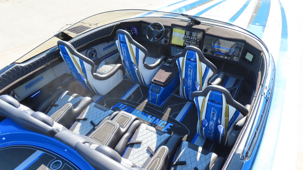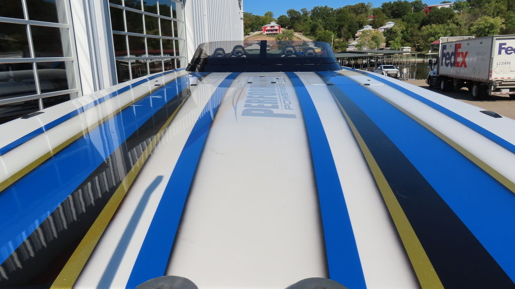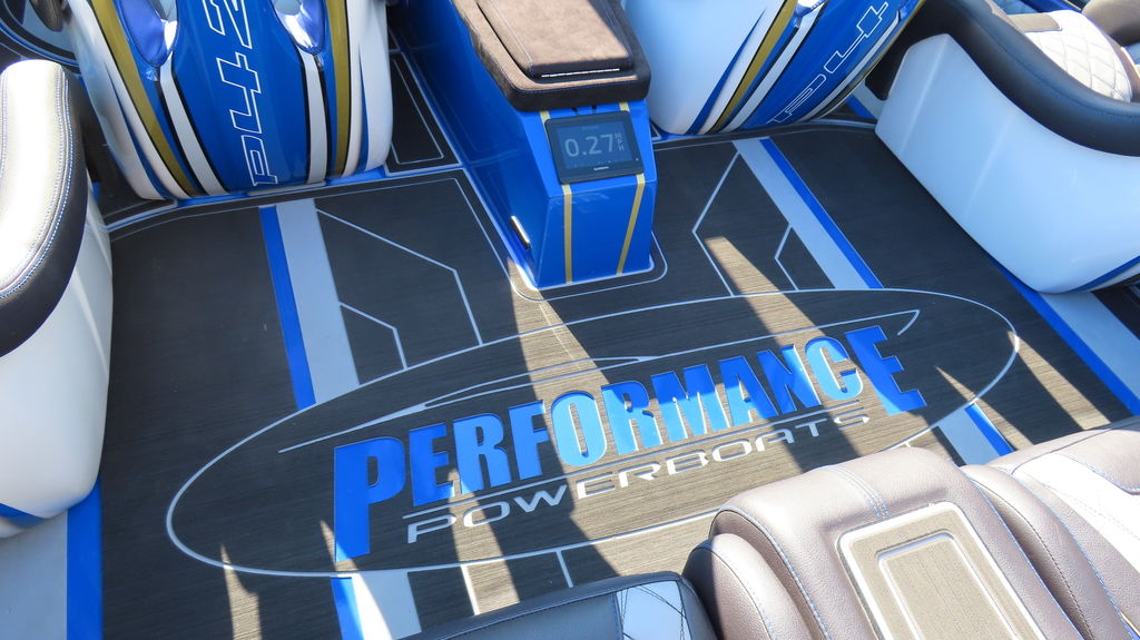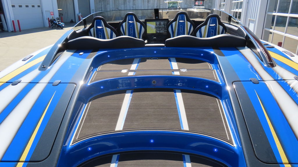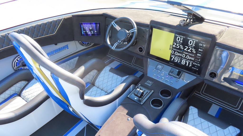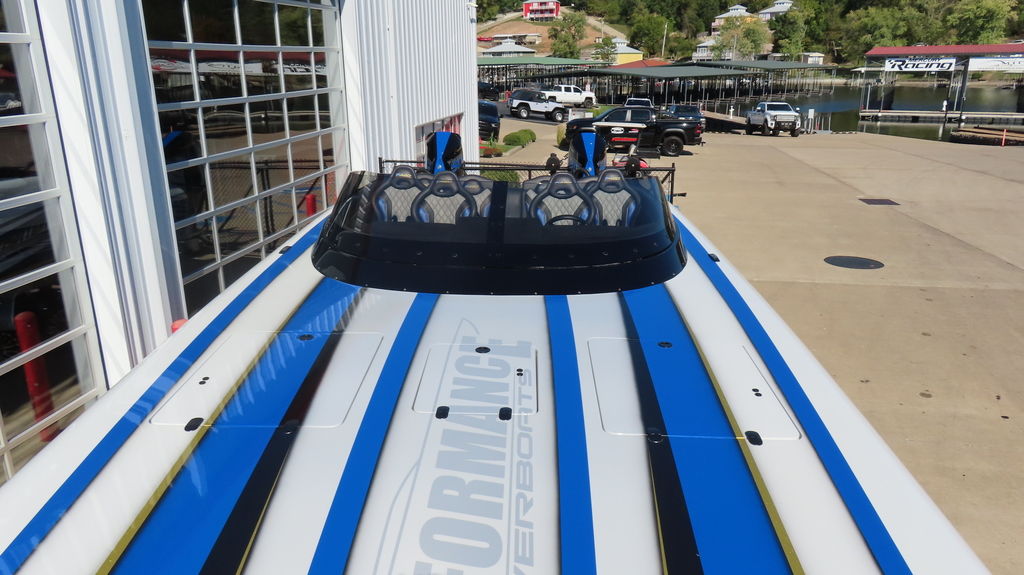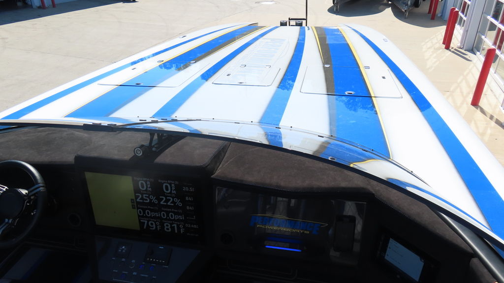 Carbon hull and deck lay-up, Vacuum-bagged e-Glass Epoxy/Carbon Fiber, Stringers & Bulkheads formed out of Foam Core/Carbon Fiber Reinforced, Faired Hull and Deck Joint, No Rub Rail, Wrap Around Windshield, Bocatech Switches, Lined Large Storage Locker Rear of Cockpit, Stainless Tie Bar, Billet Jack Plates, LED Nav and cockpit lighting, 3 AGM Batteries w/Remote Dash Switch, Bilge Pumps w/Automatic float Switches, 3 Bank Battery Charger, Cockpit blower vents, Illuminated Billet Cockpit handles, 8" Pop up cleats, QTY 6, Garmin 8622 22" Display Centered in Dash, Pull out Telescoping Ladder, Carbon Fiber dash panels, Cup Holders Qty 8, Mercury DTS Throttles and Shifters, Fire Extinguisher with Billet Mount, Sea Dek Flooring, Custom 8 person interior, Alcantara accents, Ultra Leather and Suede, Storage Compartments in cockpit with Performance logo, Fusion Head Unit, JL Multi Channel AMP, Speakers Sub and box, Shadow Caster Underwater lights, cockpit and Bilge lights, Tilt Steering, Isotta Steering wheel, Vessel View 903, 2 Garmin Rear facing cameras, Dash Blowers, Power Footrest, Mercury CNC 5 Blade Cleaver Props, Wireless Phone Chargers, Cockpit cover, Myco Aluminum Trailer Included!