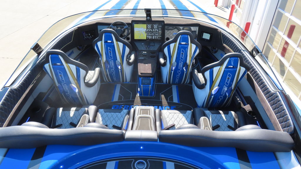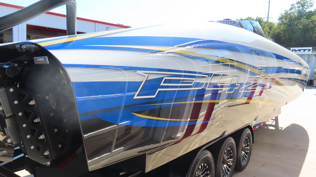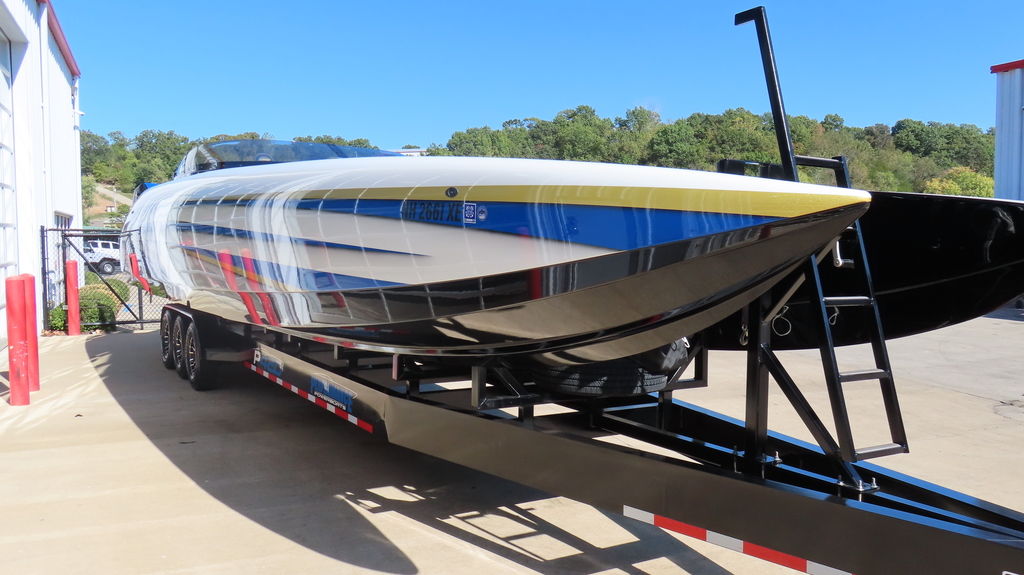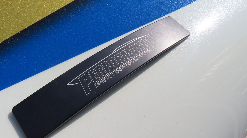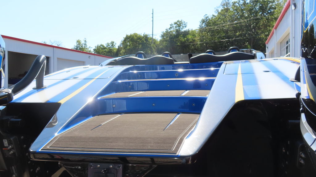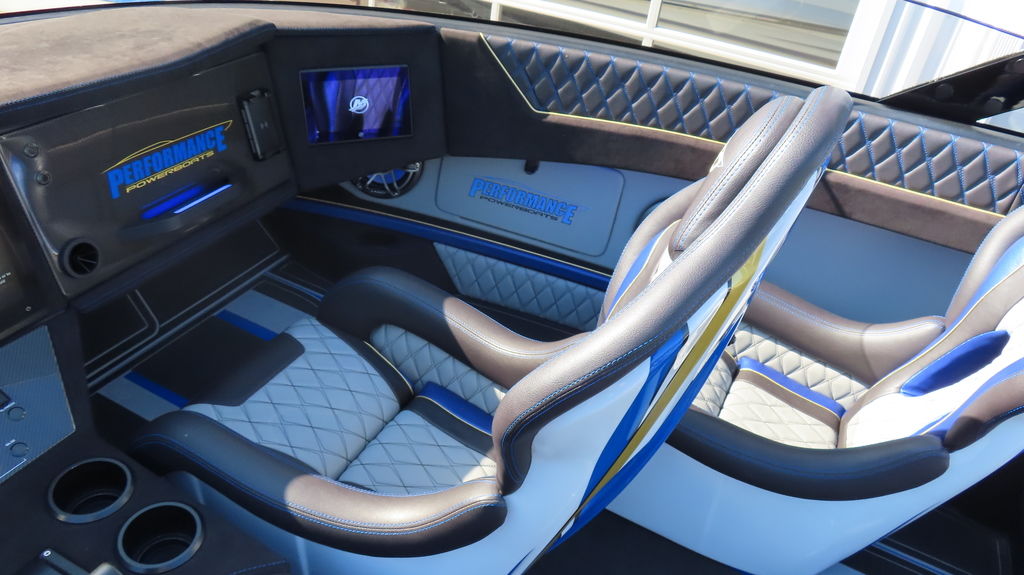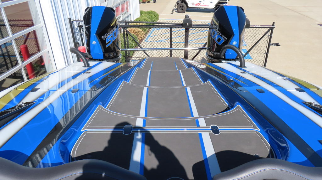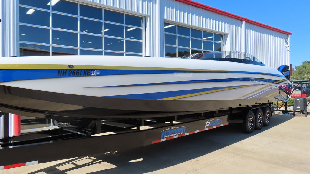 Carbon hull and deck lay-up, Vacuum-bagged e-Glass Epoxy/Carbon Fiber, Stringers & Bulkheads formed out of Foam Core/Carbon Fiber Reinforced, Faired Hull and Deck Joint, No Rub Rail, Wrap Around Windshield, Bocatech Switches, Lined Large Storage Locker Rear of Cockpit, Stainless Tie Bar, Billet Jack Plates, LED Nav and cockpit lighting, 3 AGM Batteries w/Remote Dash Switch, Bilge Pumps w/Automatic float Switches, 3 Bank Battery Charger, Cockpit blower vents, Illuminated Billet Cockpit handles, 8" Pop up cleats, QTY 6, Garmin 8622 22" Display Centered in Dash, Pull out Telescoping Ladder, Carbon Fiber dash panels, Cup Holders Qty 8, Mercury DTS Throttles and Shifters, Fire Extinguisher with Billet Mount, Sea Dek Flooring, Custom 8 person interior, Alcantara accents, Ultra Leather and Suede, Storage Compartments in cockpit with Performance logo, Fusion Head Unit, JL Multi Channel AMP, Speakers Sub and box, Shadow Caster Underwater lights, cockpit and Bilge lights, Tilt Steering, Isotta Steering wheel, Vessel View 903, 2 Garmin Rear facing cameras, Dash Blowers, Power Footrest, Mercury CNC 5 Blade Cleaver Props, Wireless Phone Chargers, Cockpit cover, Myco Aluminum Trailer Included!
